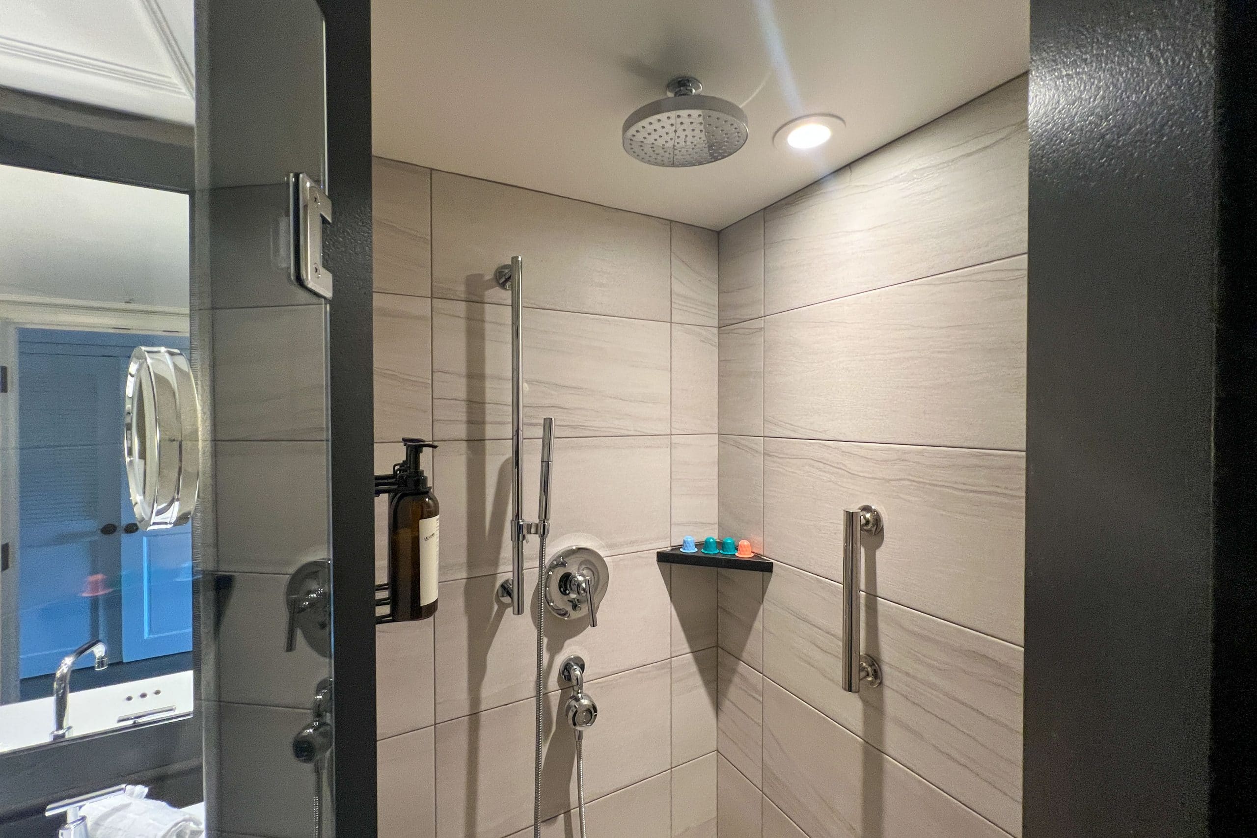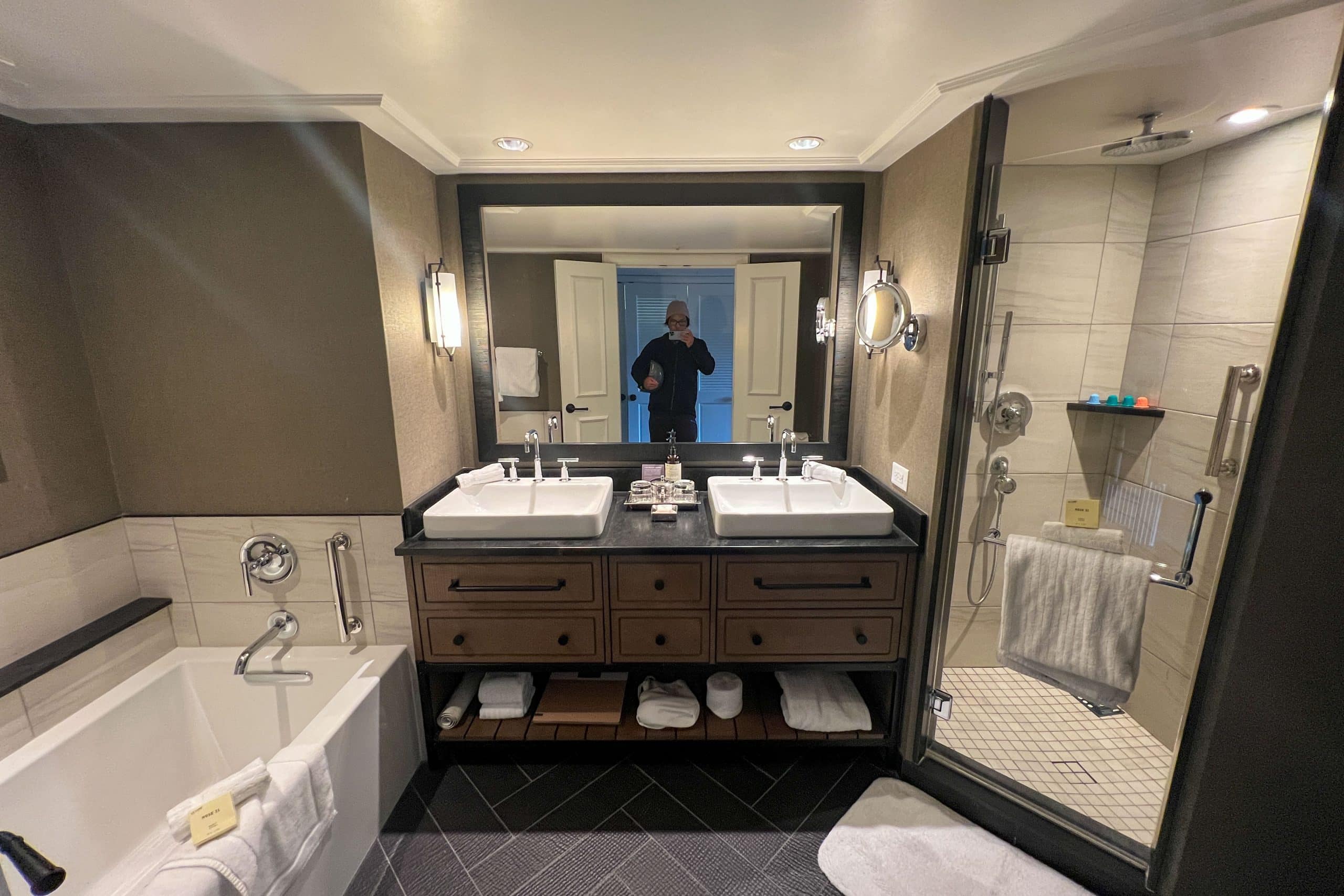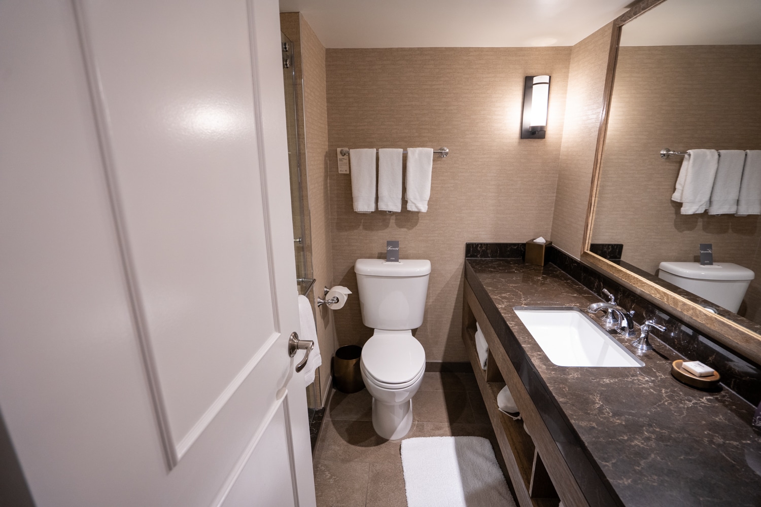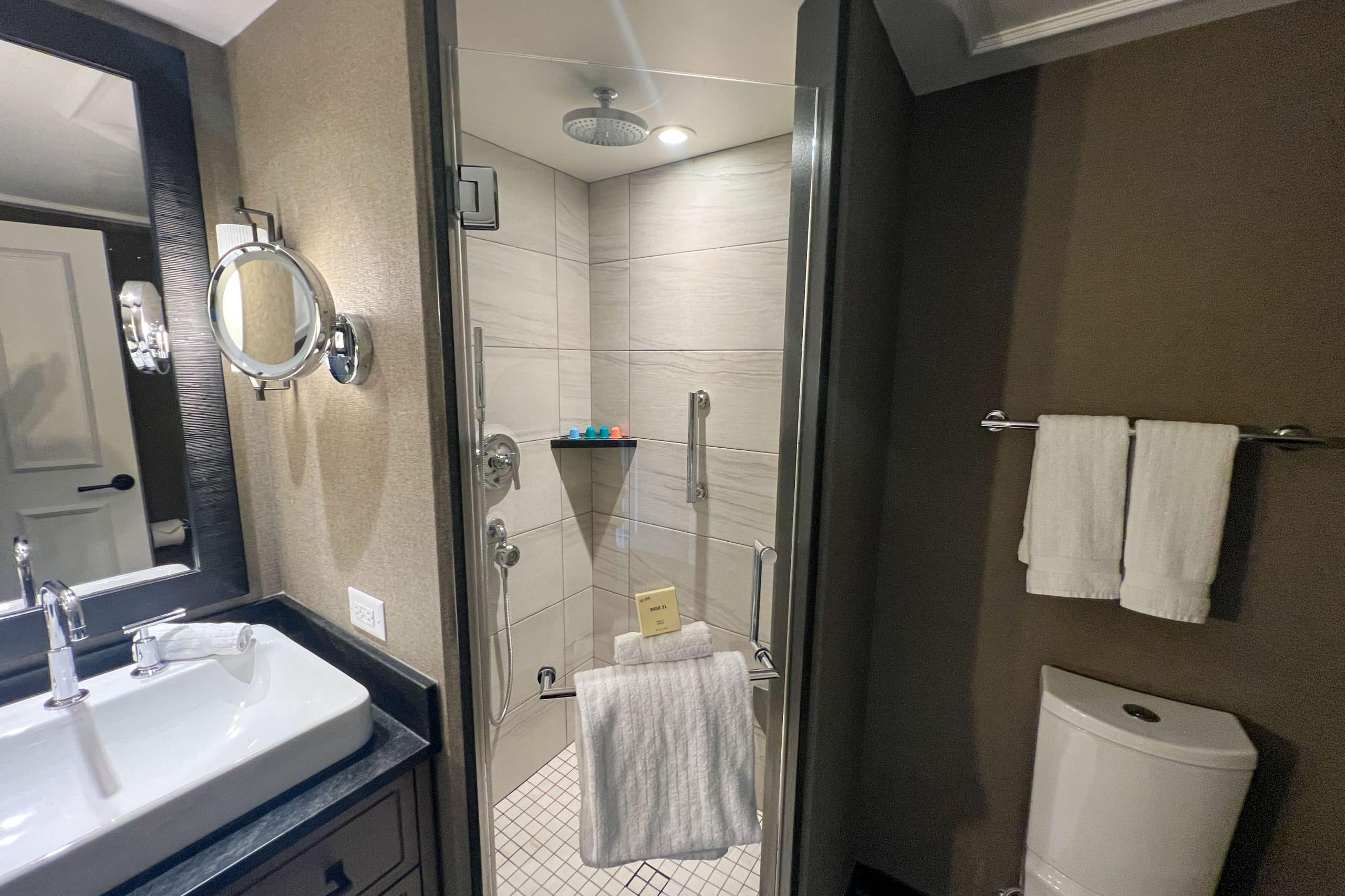 Moving into the bathroom, the space is small but functional, with a lengthy single vanity to the right and a walk-in shower to the left. The shower’s water pressure was excellent, which is a much-needed feature after a hard day on the slopes.
