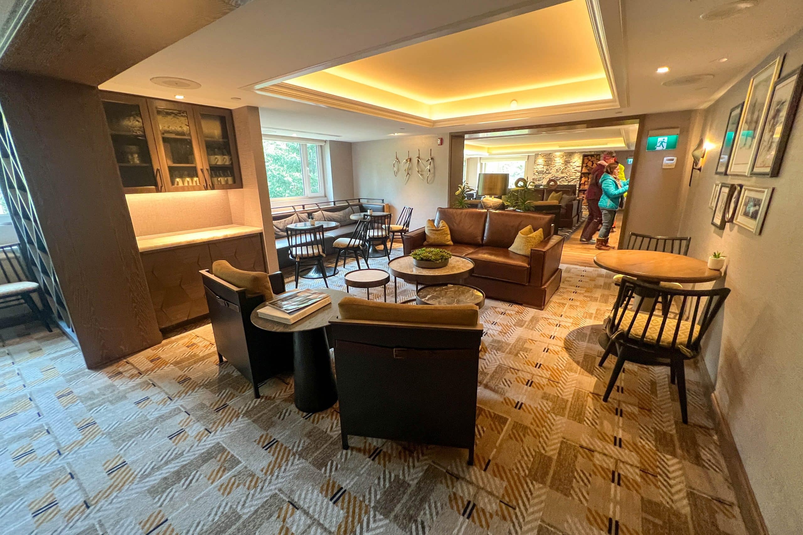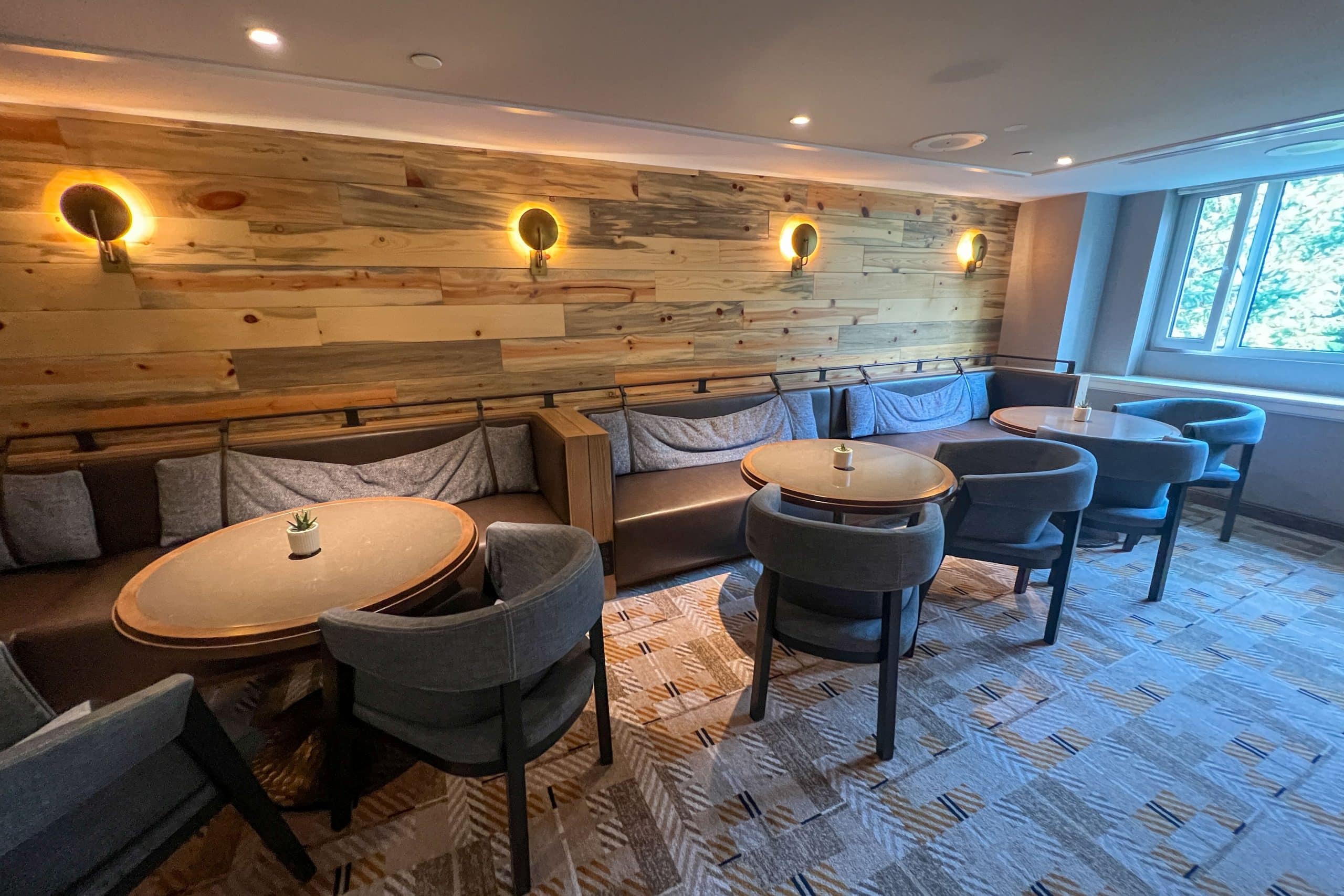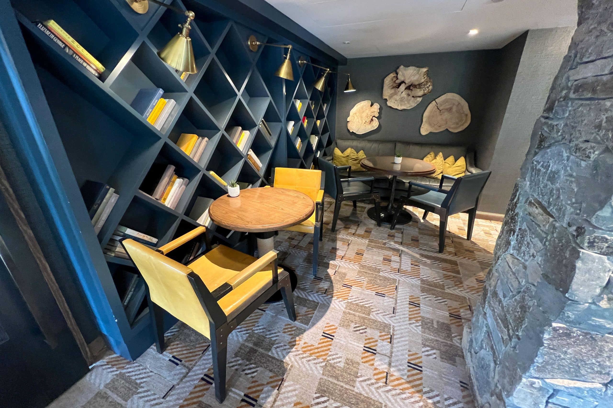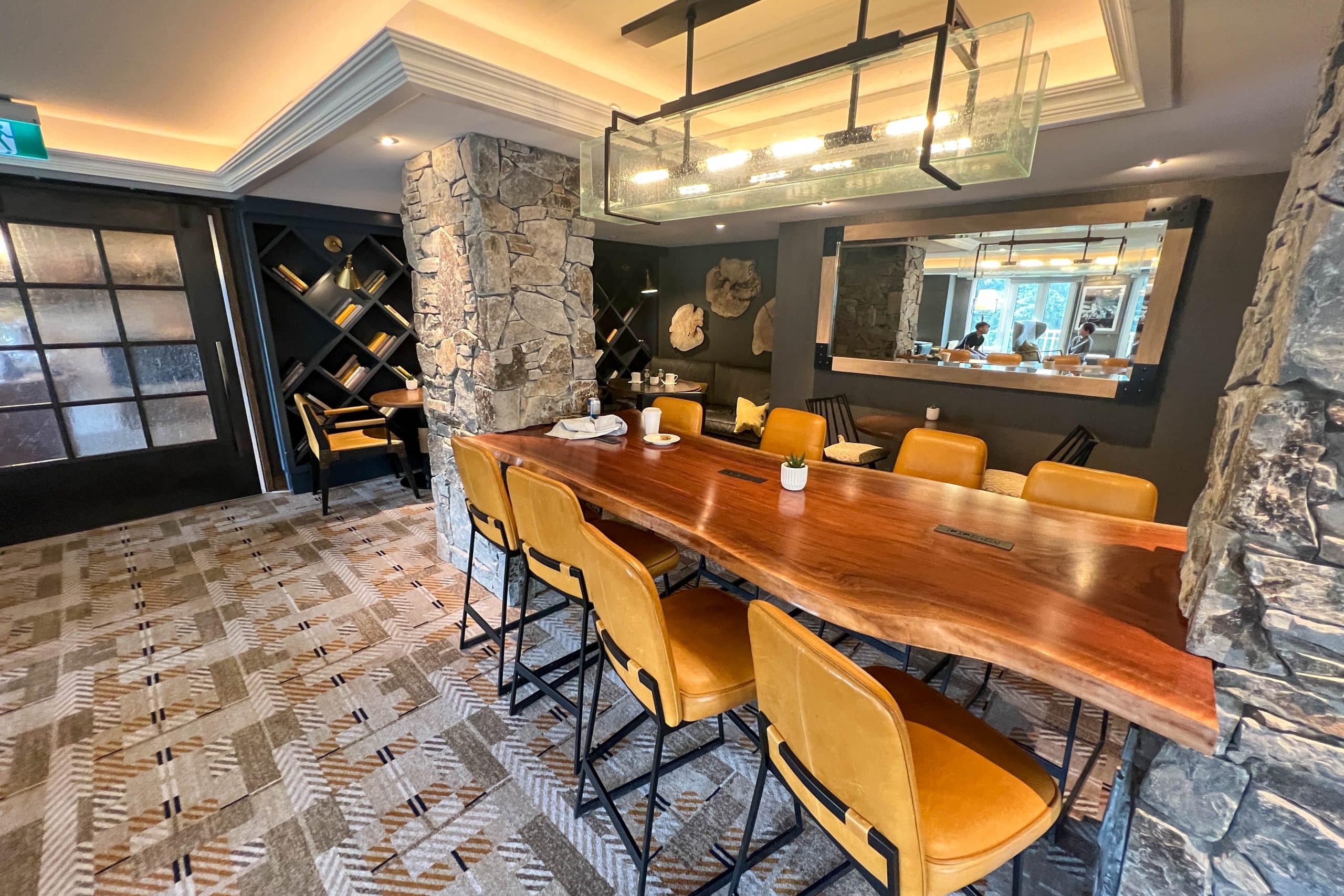 The lounge blends modern touches with rustic touches such as live edge wood, custom stone work, leather seats, and woven fabrics.