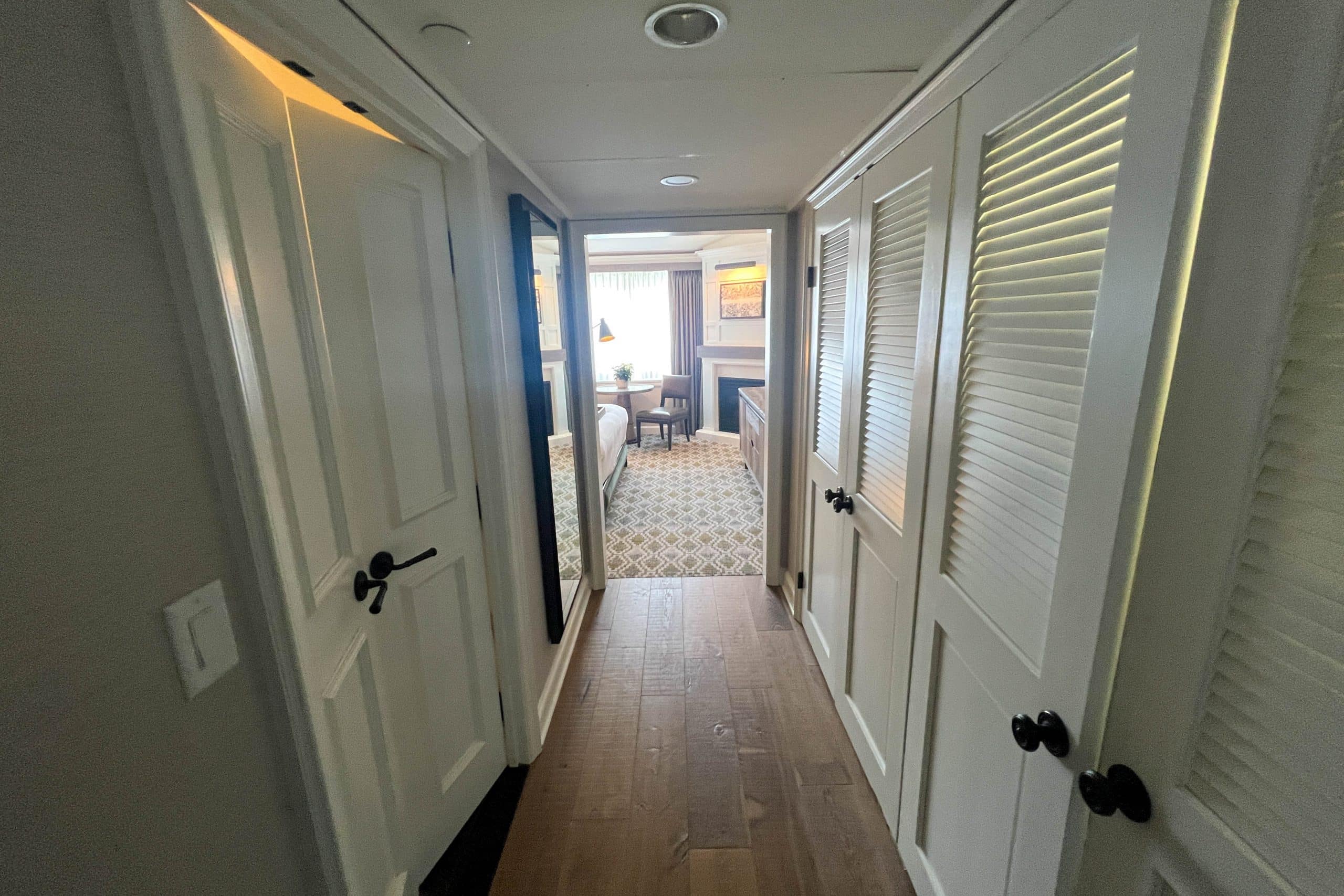 At the entrance of the room, you’ll find the bathroom situated on the left-hand side. It boasts a tasteful design with elegant herringbone flooring and a double vanity that features a generously sized mirror.