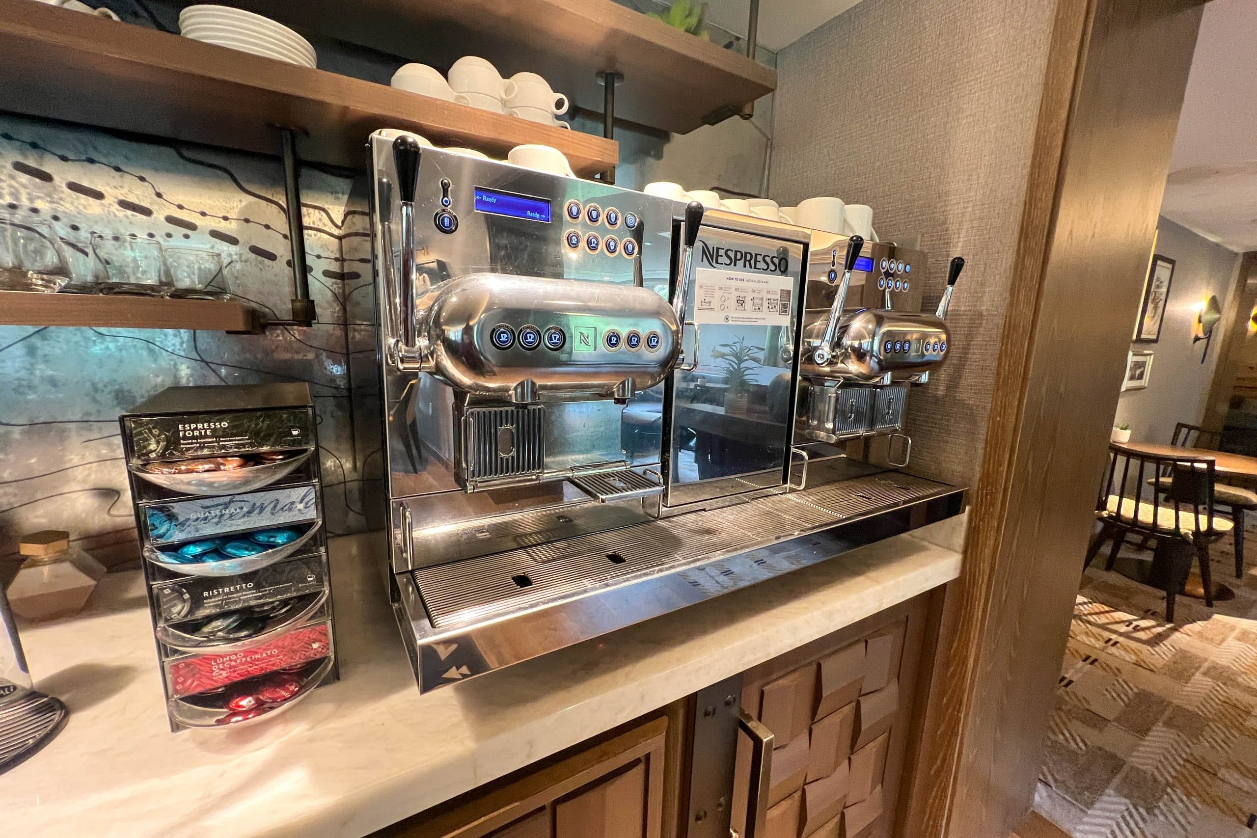 Lastly, there’s a self-serve area with soft drinks, juice, beer, and wine, as well as tea and a large Nespresso Zenius to make specialty coffees.