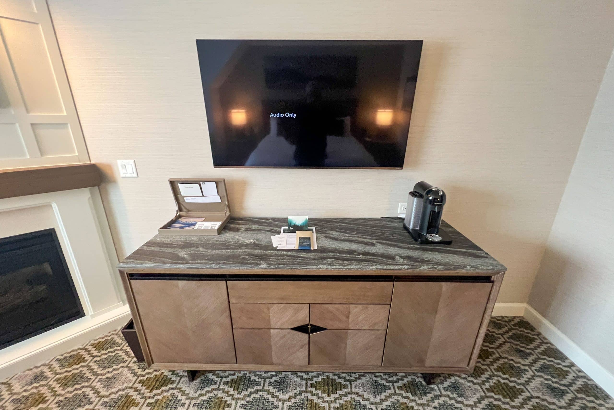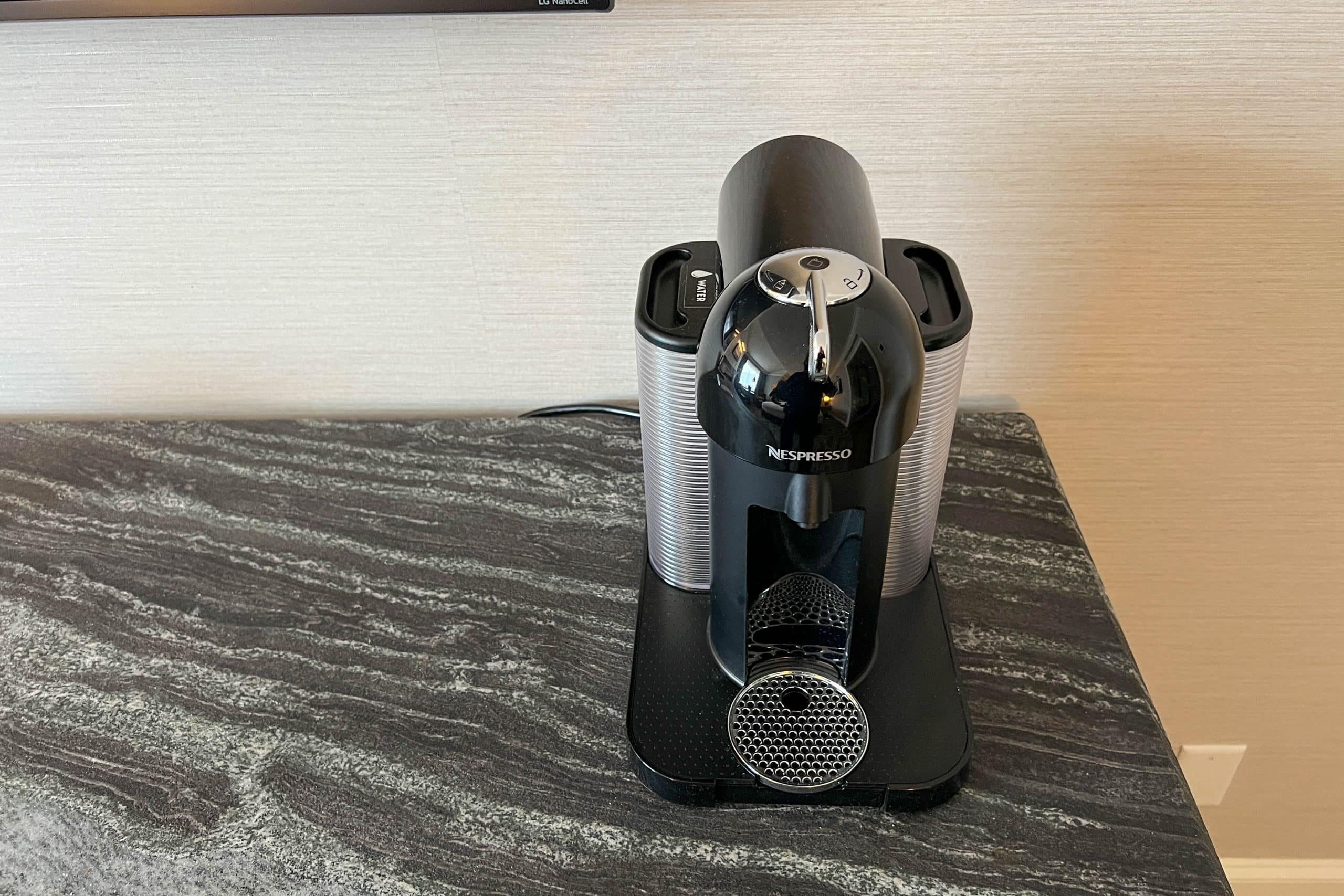 On the opposite wall to the kind bed is a lengthy armoire. Atop is a Nespresso, and quite a luxurious one at that. Above the armoire is a wall-mounted flat-screen TV.