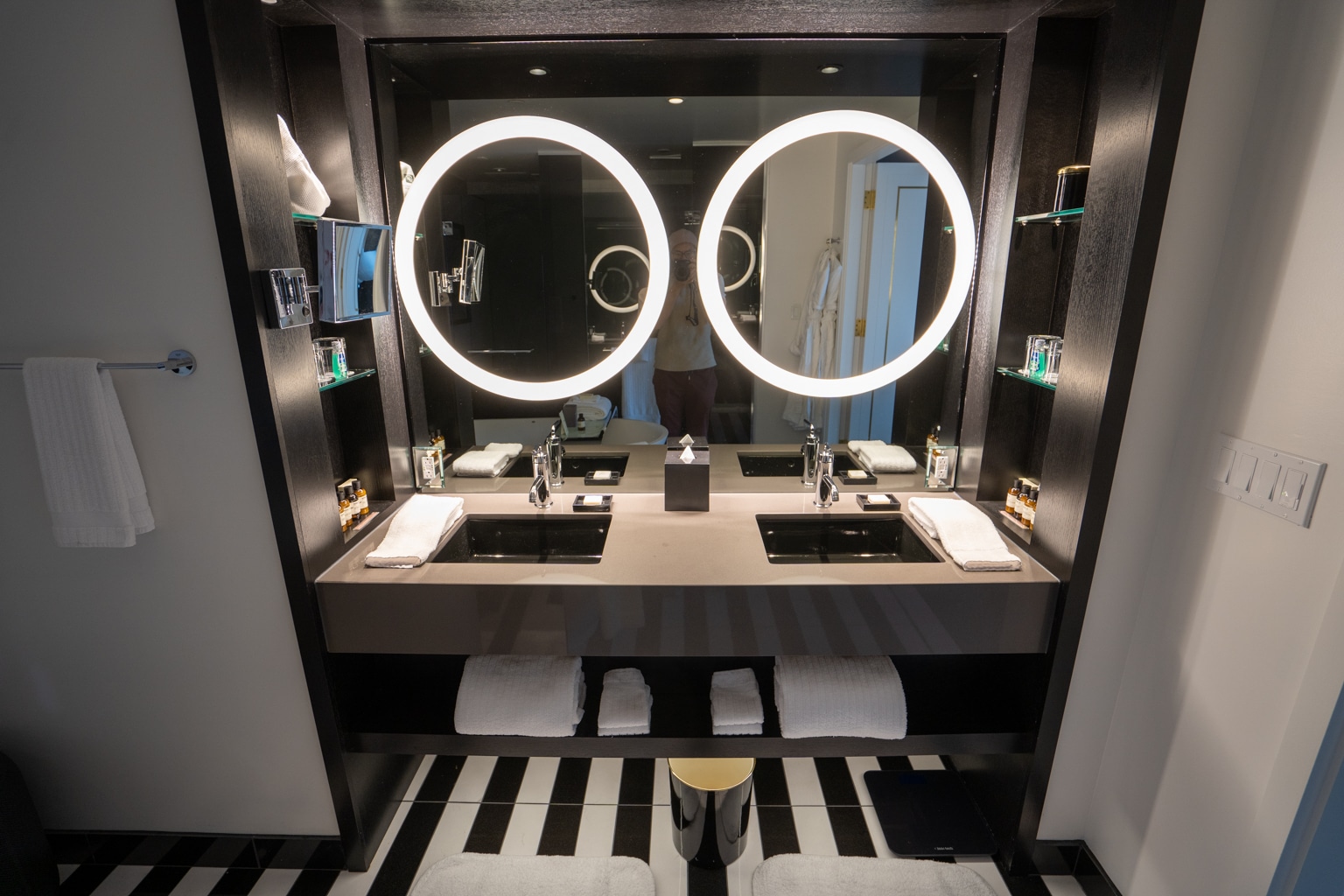 The vanities also popped against the dark contrast of the room, consisting of two sinks with large rounded LED mirrors hovering over them.