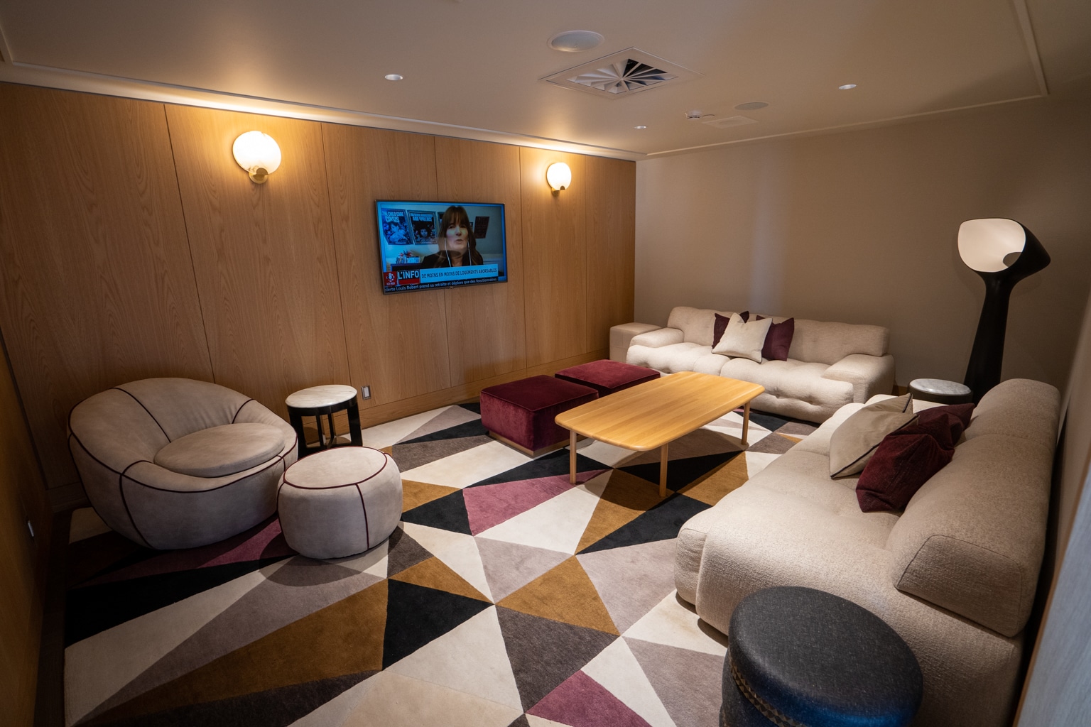 A flat-screen TV is mounted facing the sectional, and two more armchairs are located near the room’s window. A small workspace, consisting of a desk and chair, is situated to the right of the TV.