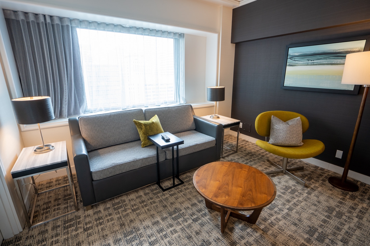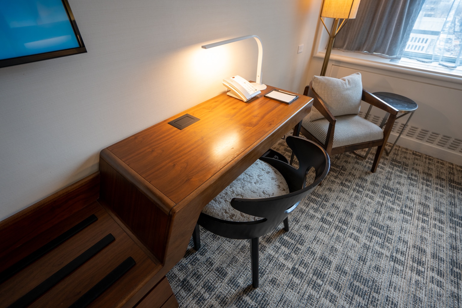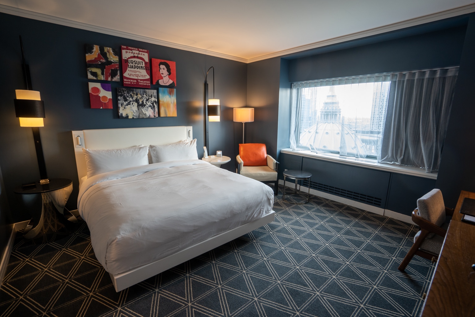 I thought it was a nice size for a standard room, comfortably hitting in the king-sized bed, two reading chairs in each corner by the window, and a work desk.