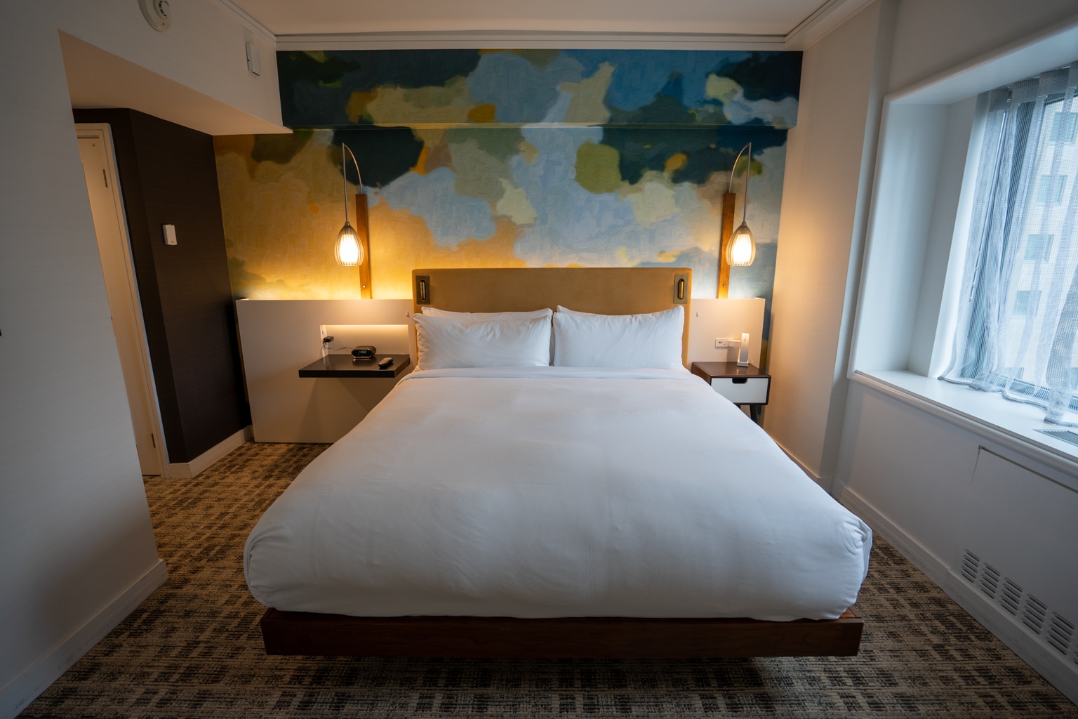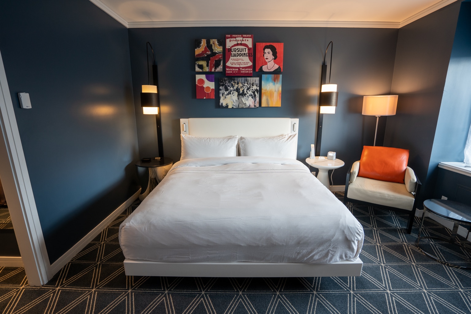 The room featured much of the same décor as the Junior Suite, with a vibrant wallpaper behind the bed and the same hanging bulb lights.