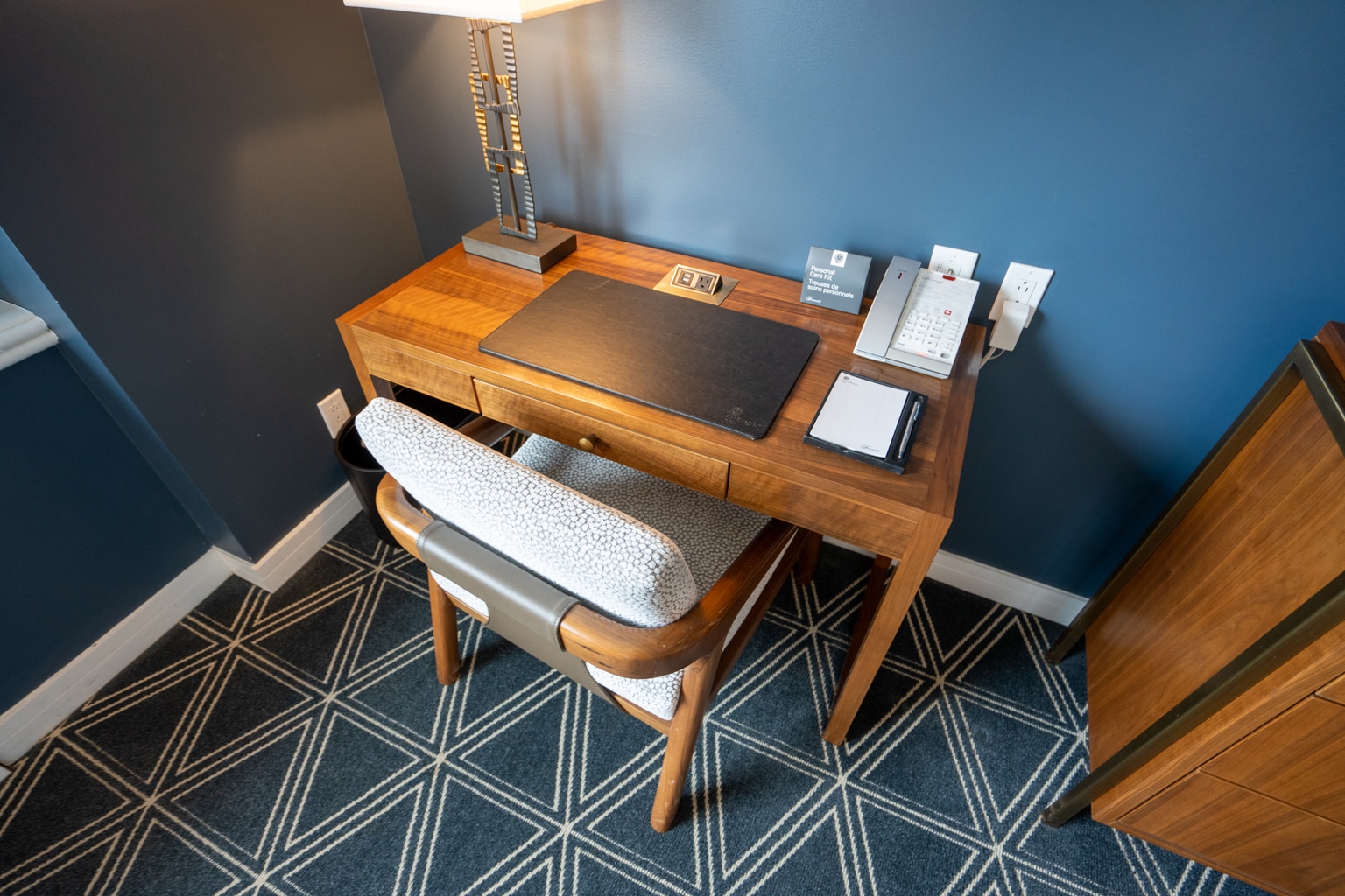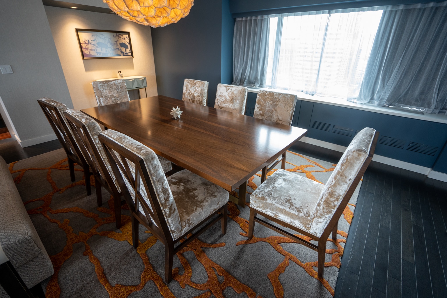 The décor has a contemporary feel with a vintage 1960s flair. The room consists of deep blue finishes against bold accents, such as geometric carpets and artwork covering the entire back wall.