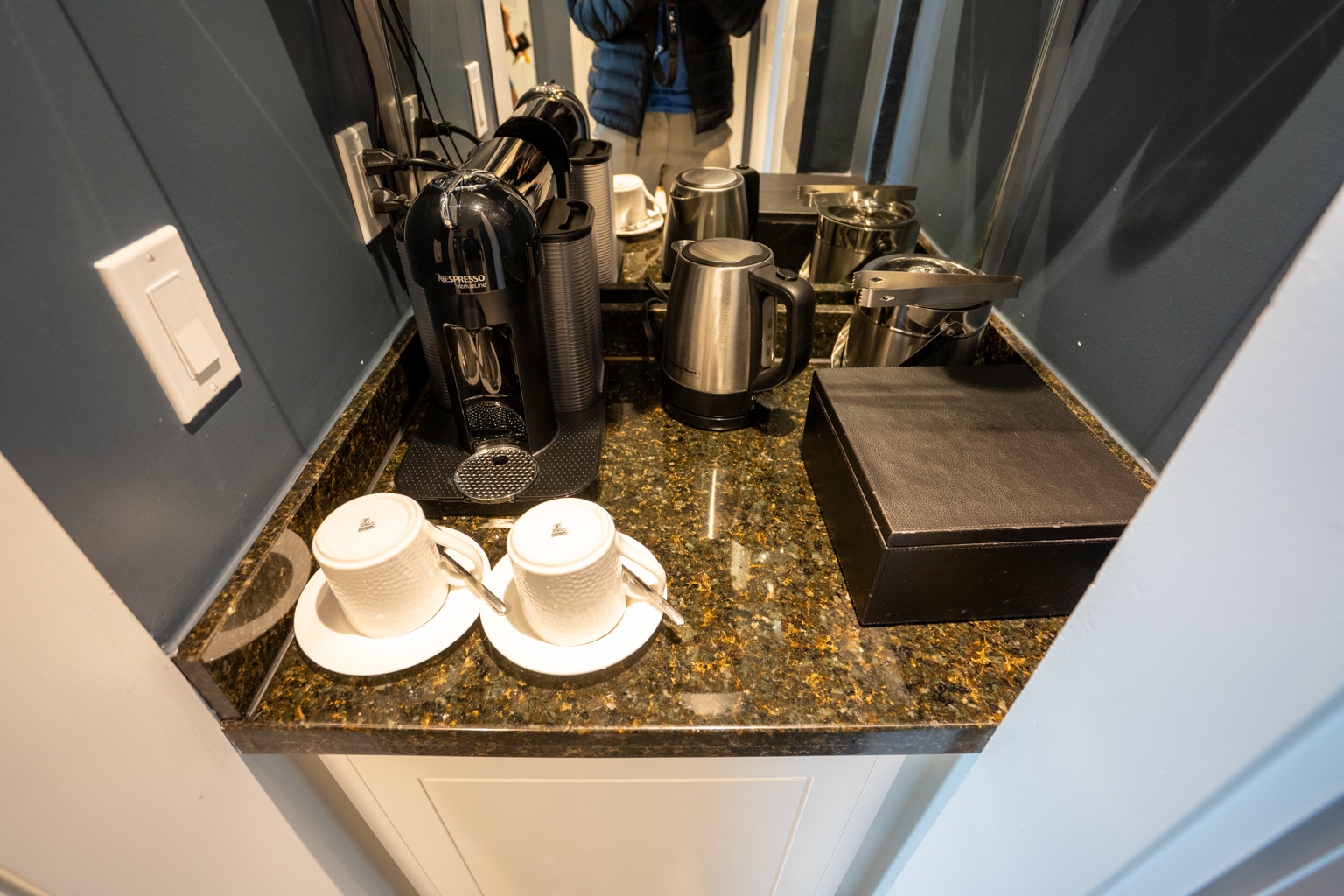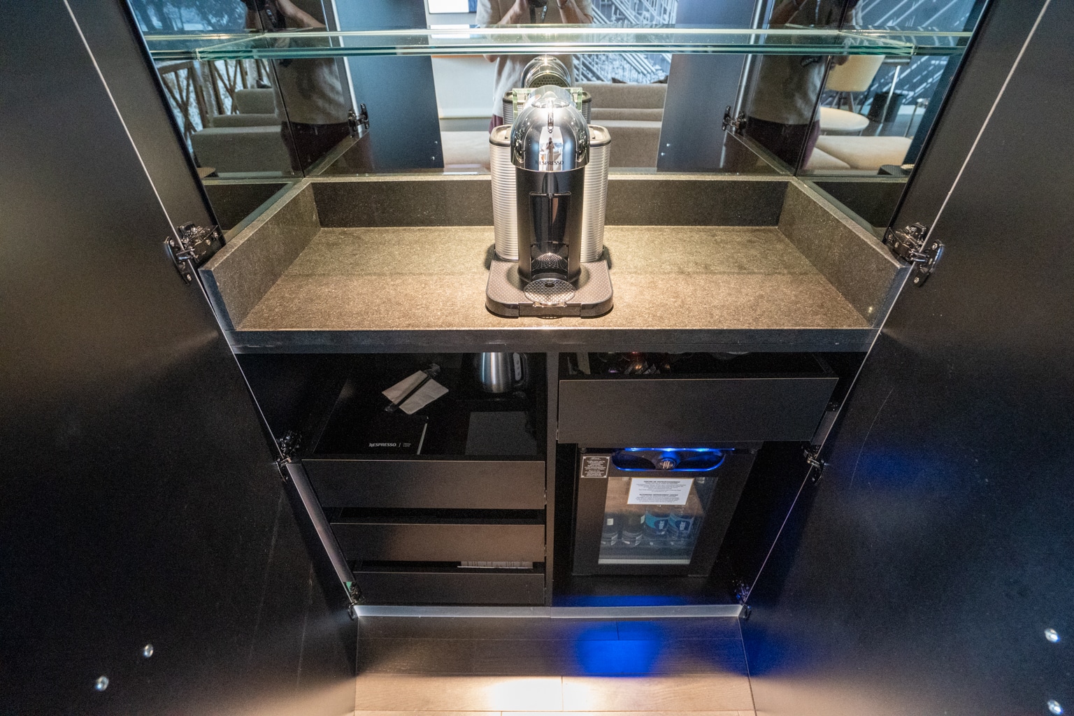 As you enter the room, to the left is a small pantry with a Nespresso coffee maker with complimentary coffee, as well as a kettle with complimentary tea.