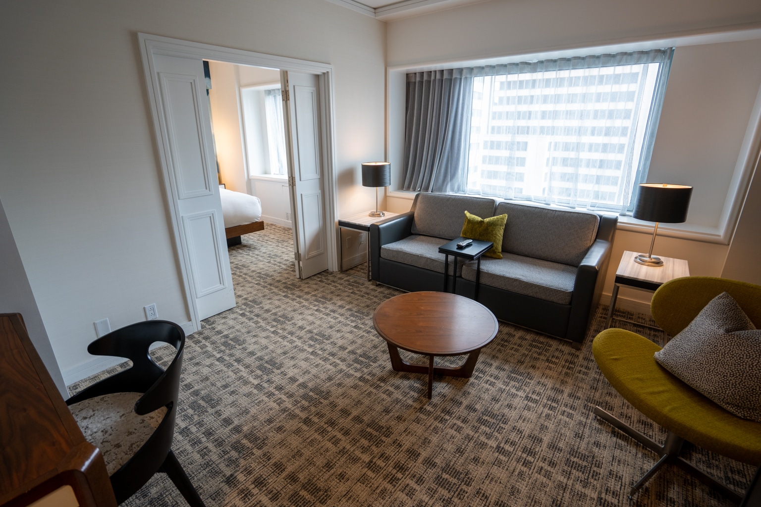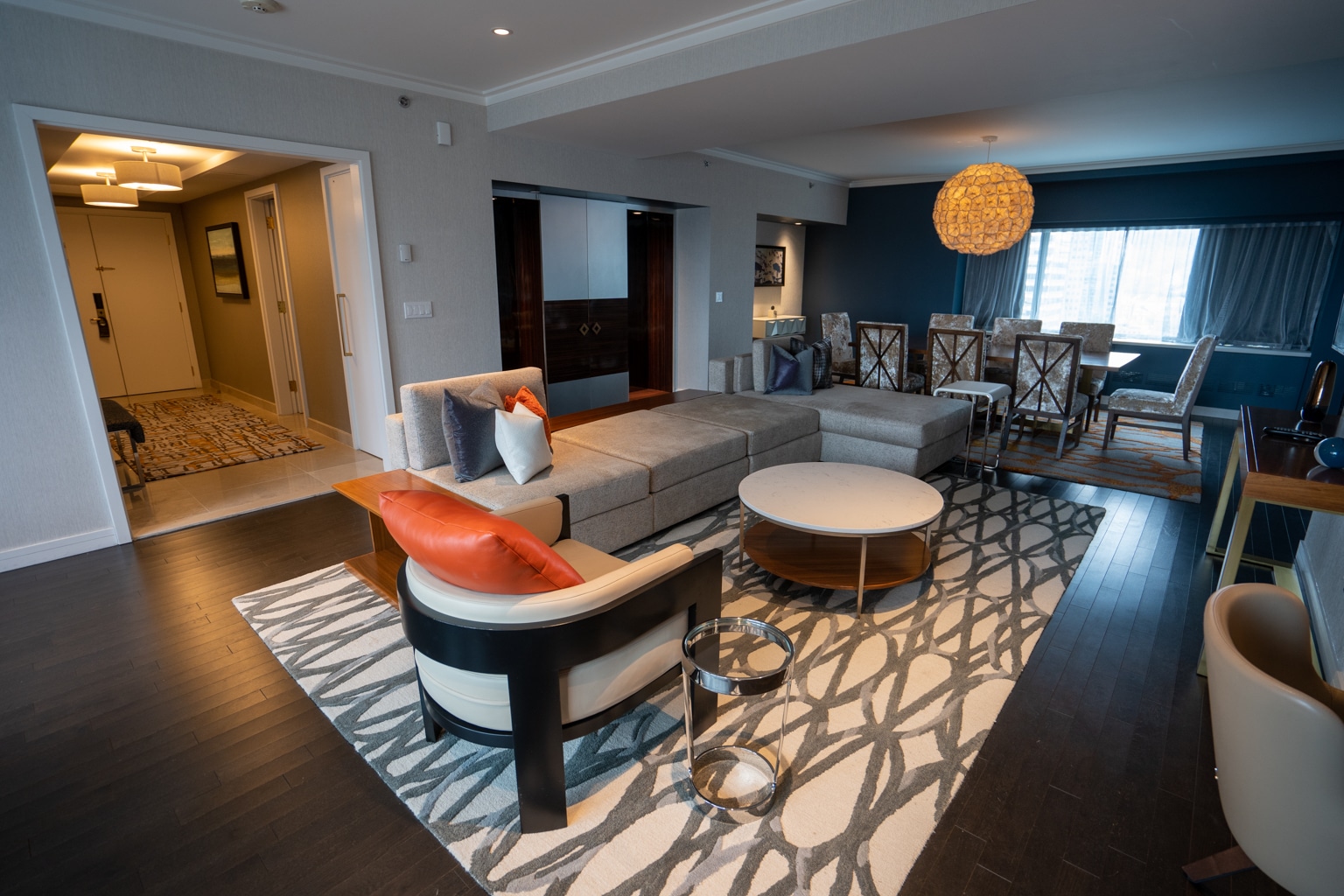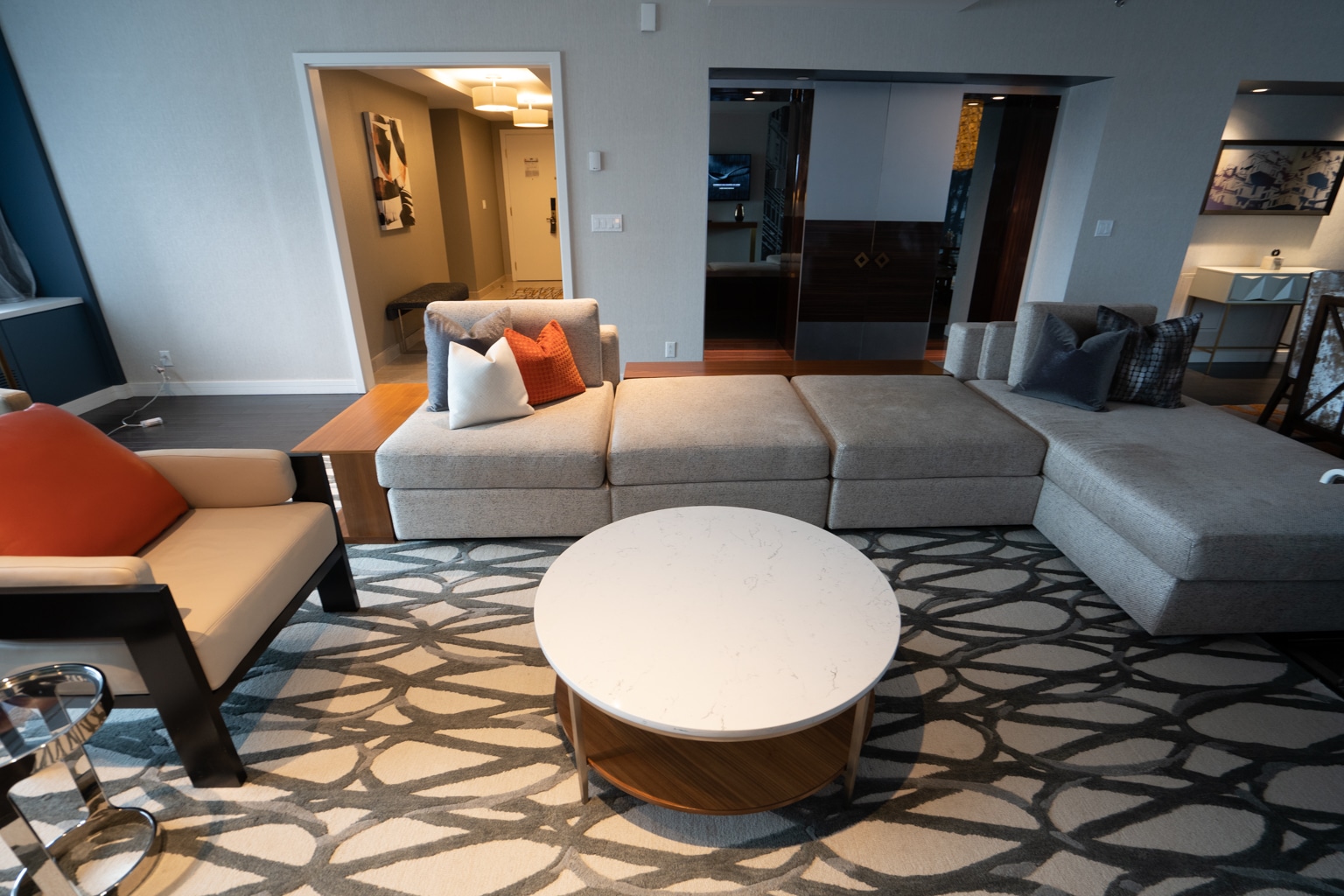 There is a spacious living area separate from the bedroom, complete with a dining and meeting space that seats eight people, and another seating area with a sectional, coffee table, and armchair.