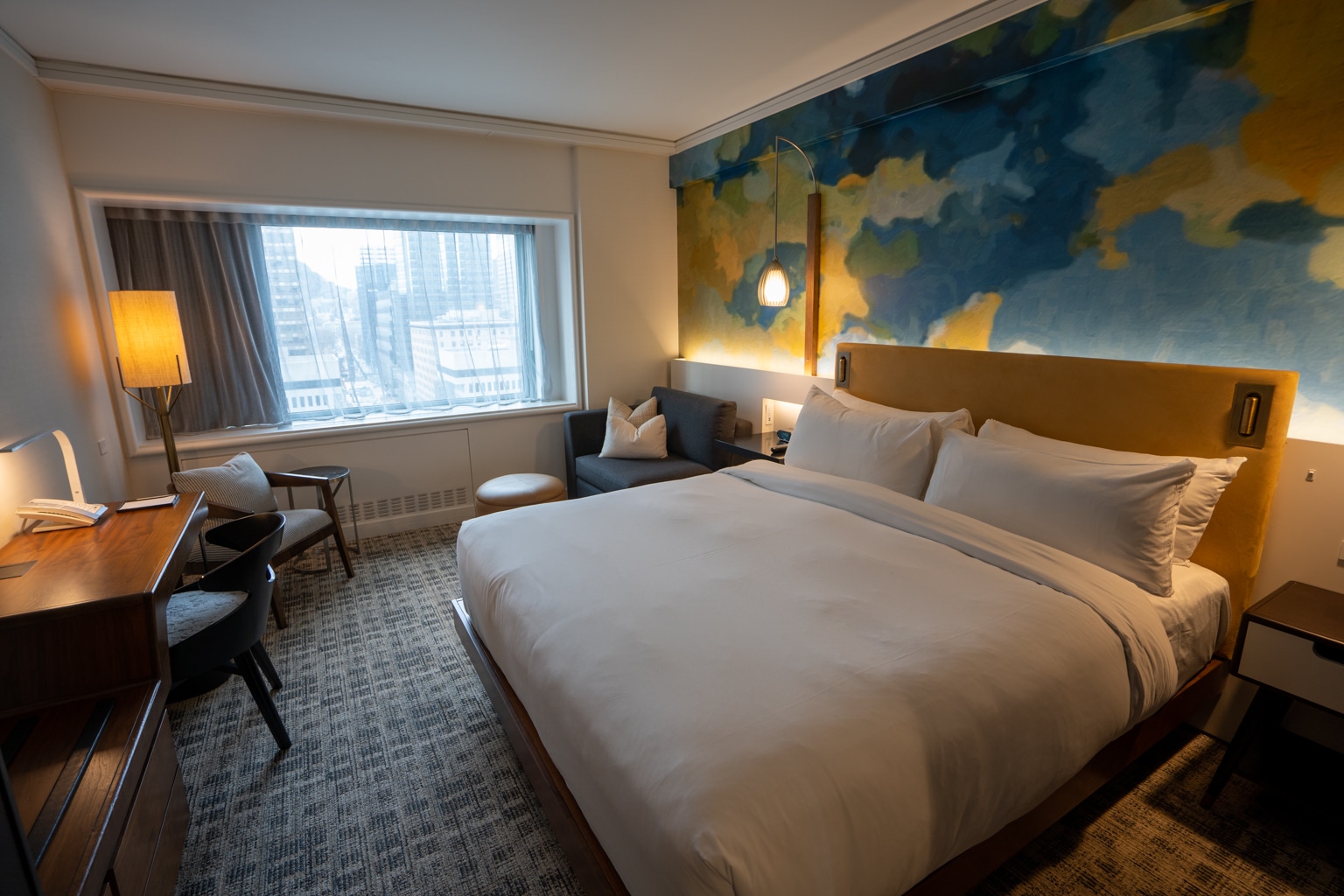 I liked the Gold Floor King Room’s deep blue finishes, similar to the Mile End Suite, as well as the overall modern feel of the room. The room looked out onto Marie-Reine-du-Monde Cathedral and the Downtown Montreal skyline.