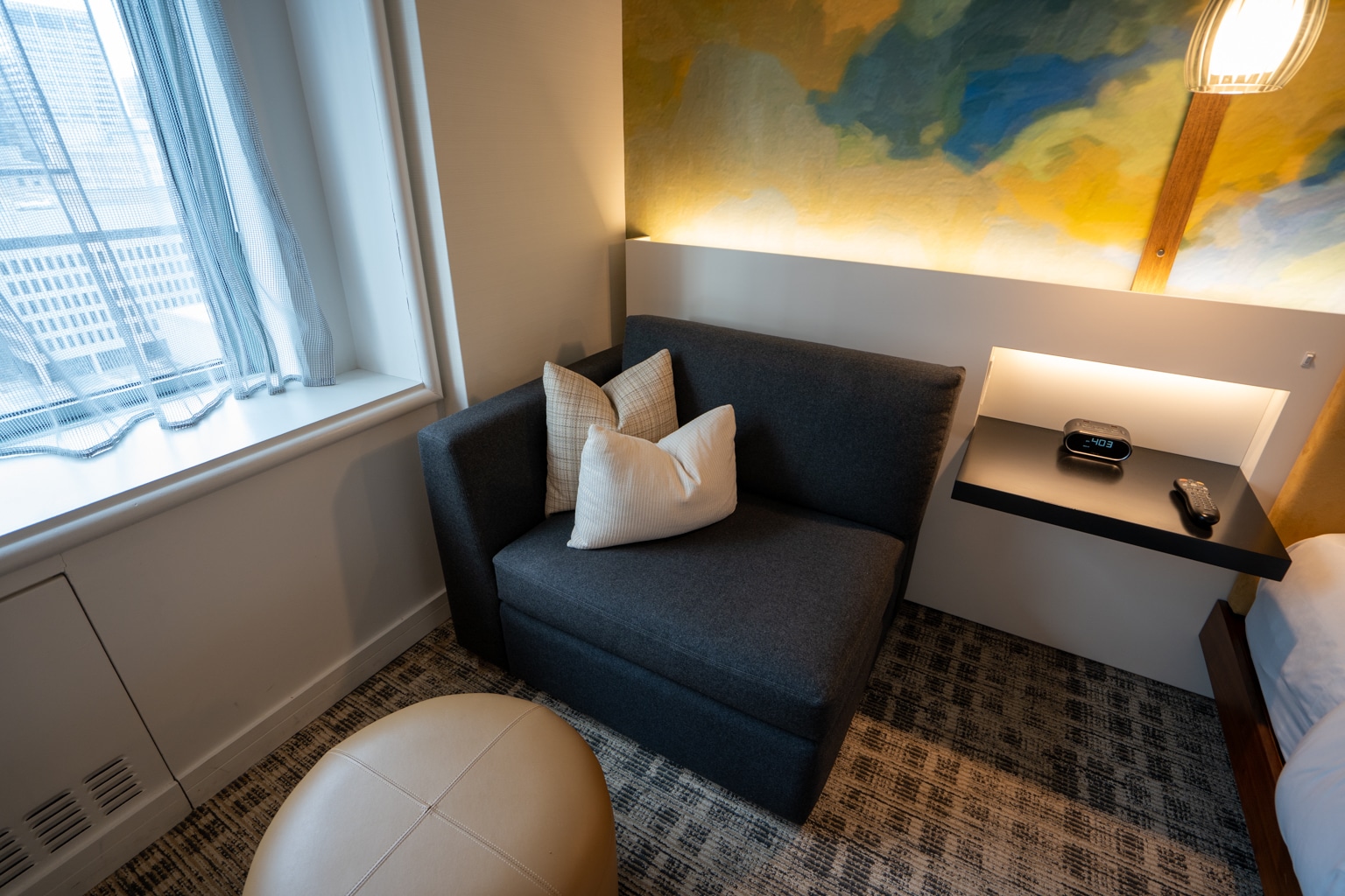 This room featured the same small but modern bathroom as the Junior Suite, with a walk-in shower and single vanity. Indeed, I found the Gold Floor rooms to be more sophisticated and the standard rooms more playful, with vibrant art and interesting patterns on the walls.