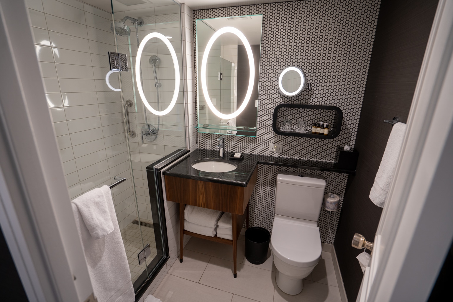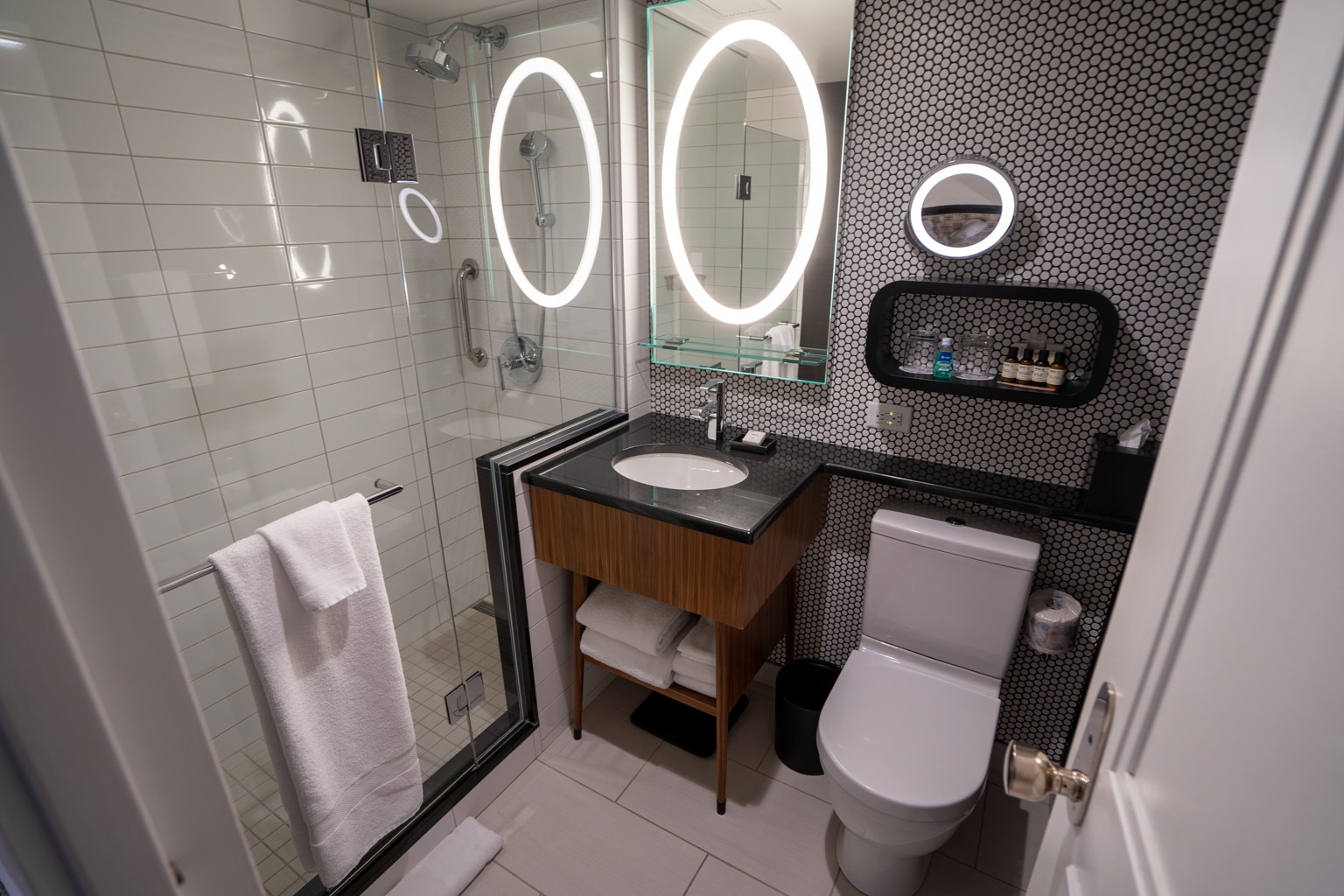 The primary bathroom was small but still sleek and modern, with a single LED mirror, sink, and a walk-in shower. I thought the finishes of the bathroom were even nicer than upstairs on the Gold Floor.