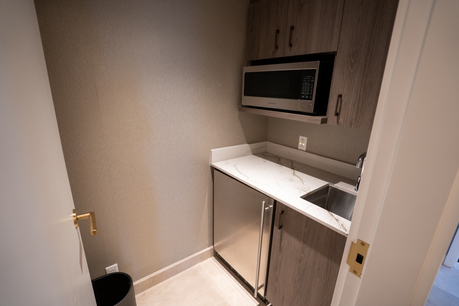 On the other side of the hallway, you can find a small kitchenette with a microwave, sink, and fridge to the right.