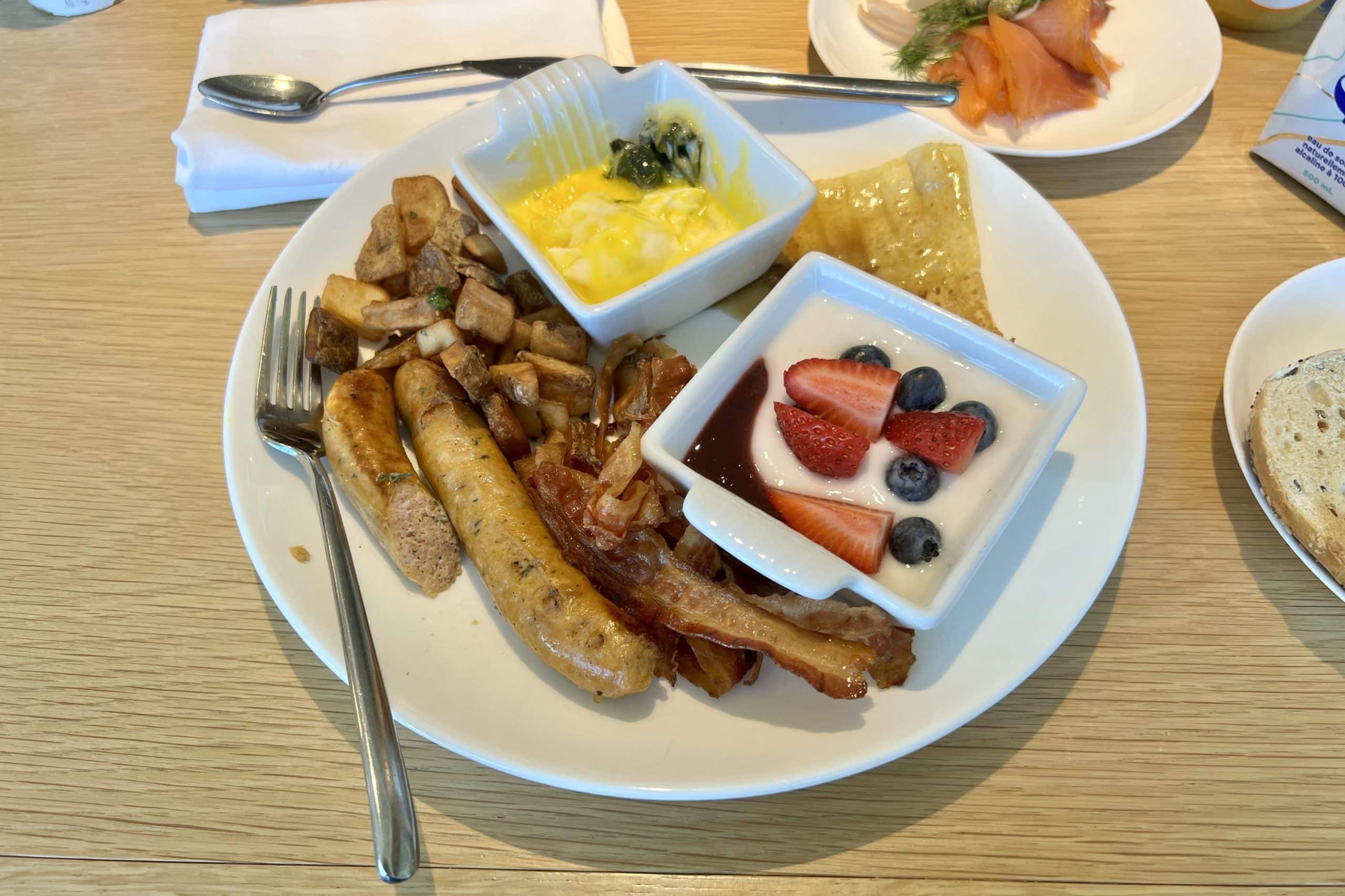 The breakfast was fairly standard but high-quality, including eggs, sausages, pastries, and yogurt.
