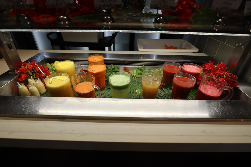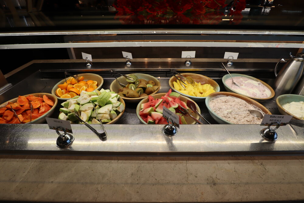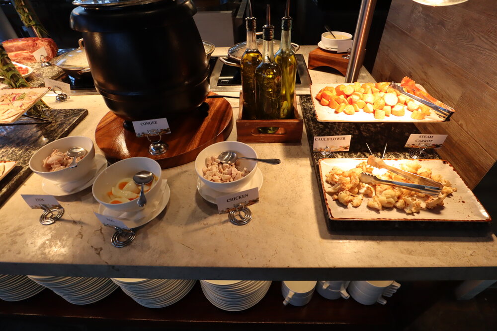 The hotel’s breakfast buffet is served in the Goji Kitchen & Bar. There’s a wide range of seating options, including a few seats right by the water, with splendid views of the overwater villas across the lagoon.