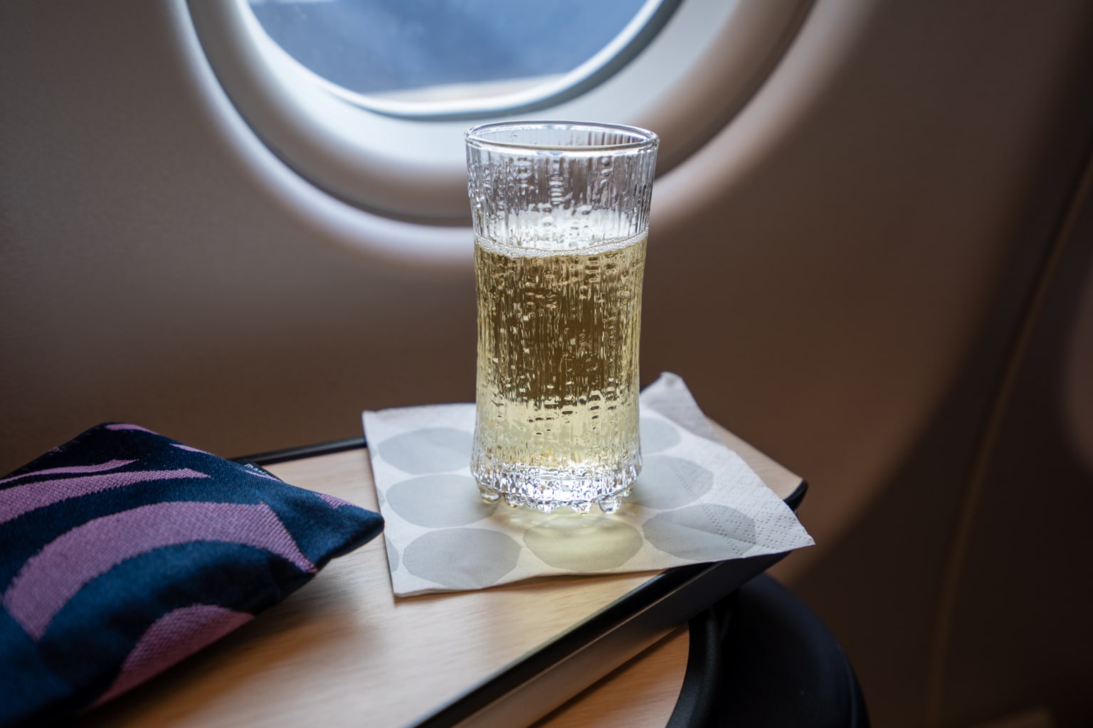 Before taking off, a glass of Champagne was proactively served in the airline’s beautiful signature glassware, alongside a hot towel.