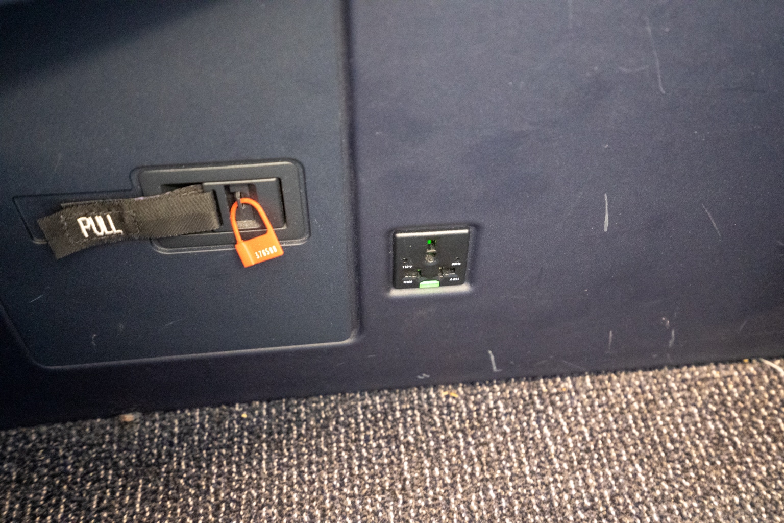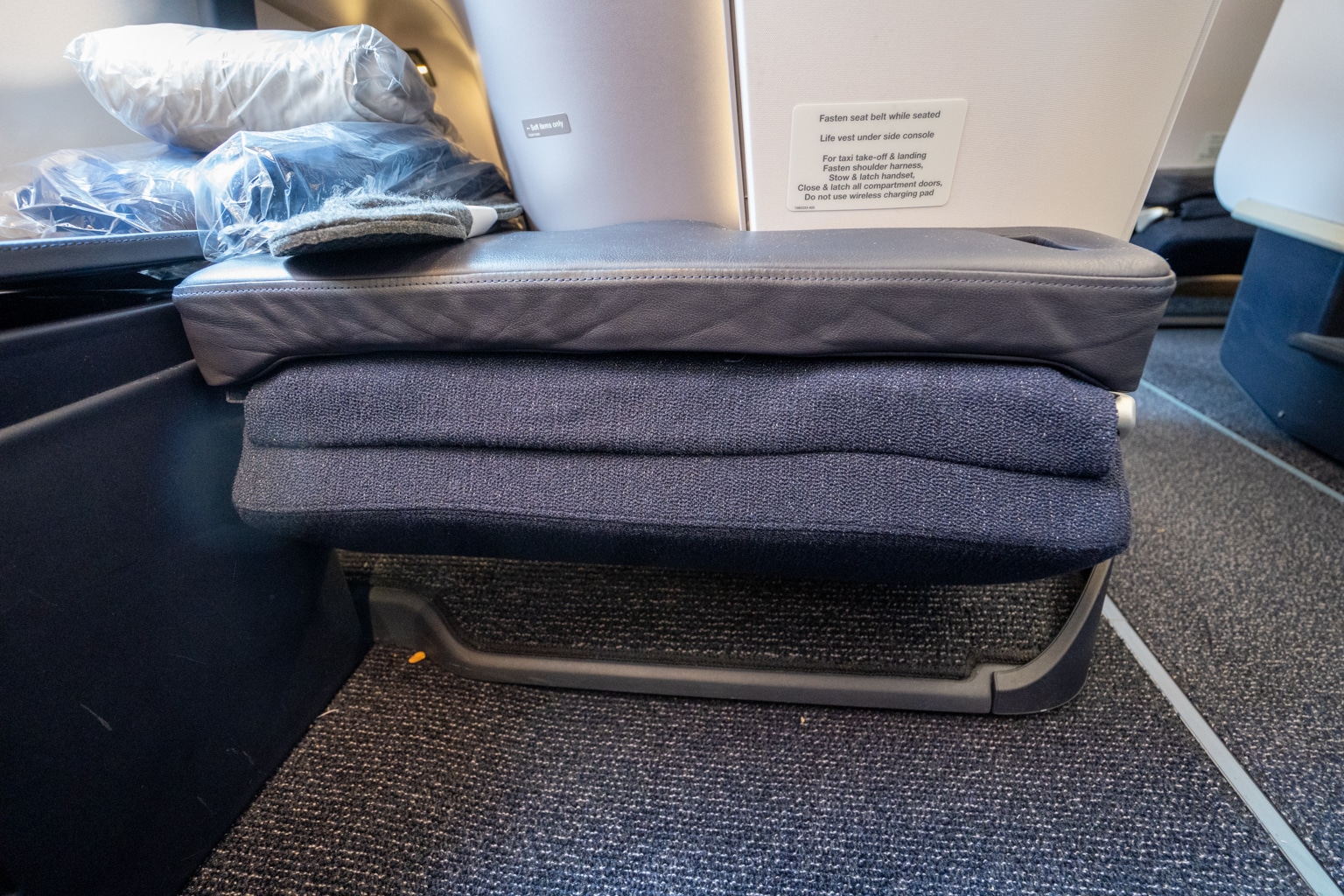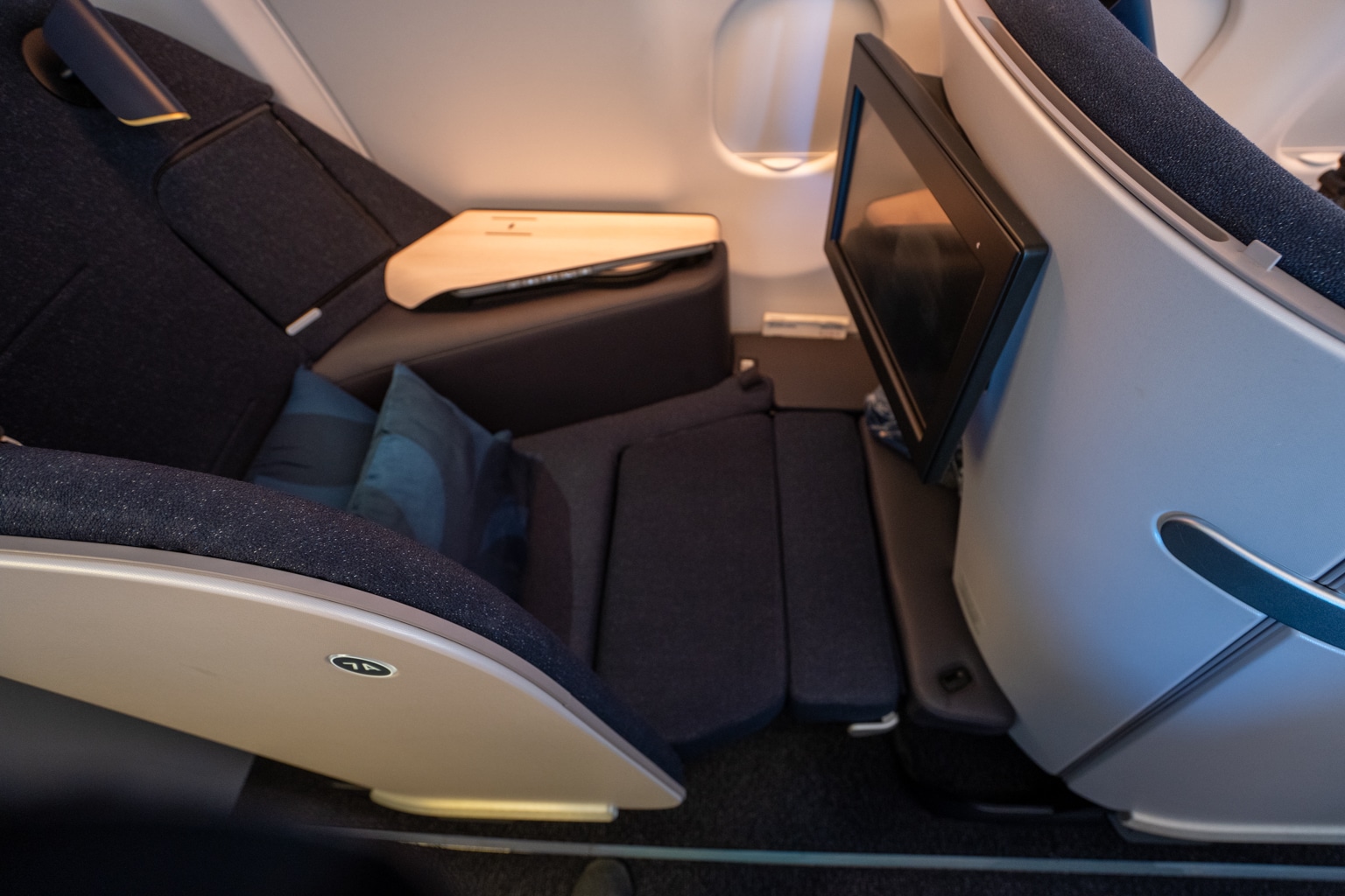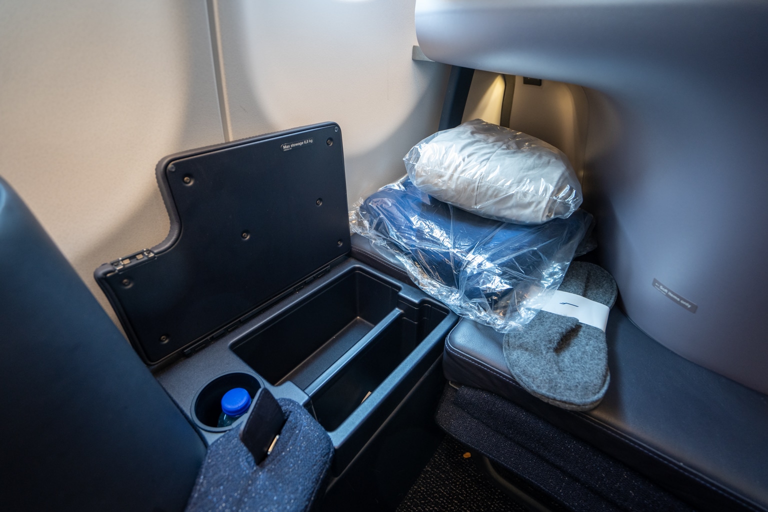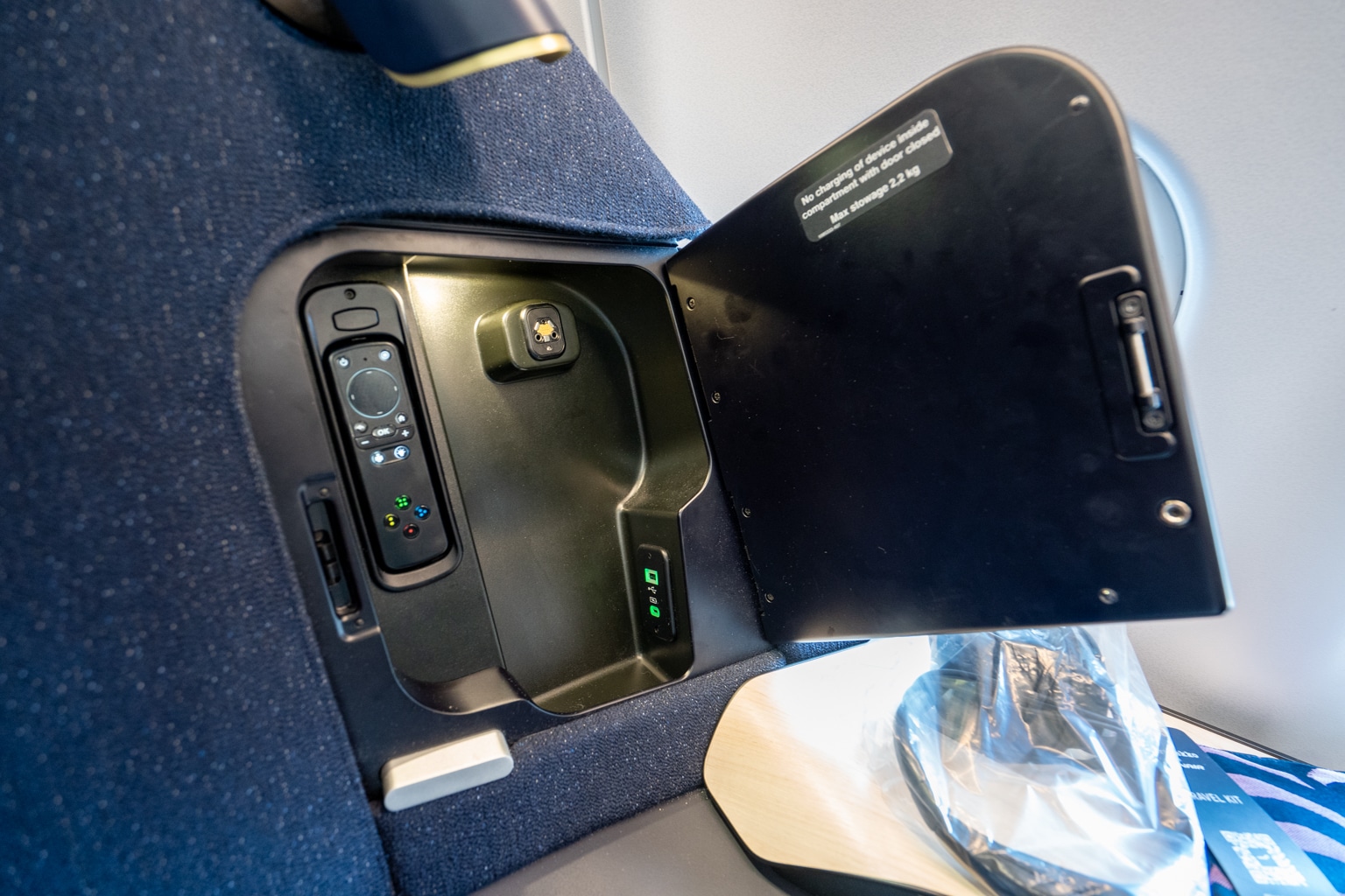 Below the screen, the footwell spans roughly half the width of the seat (with the other half taken up by the seat in front of you) and points away from the aisle. There’s also a literature pocket and a storage compartment for some small loose items.