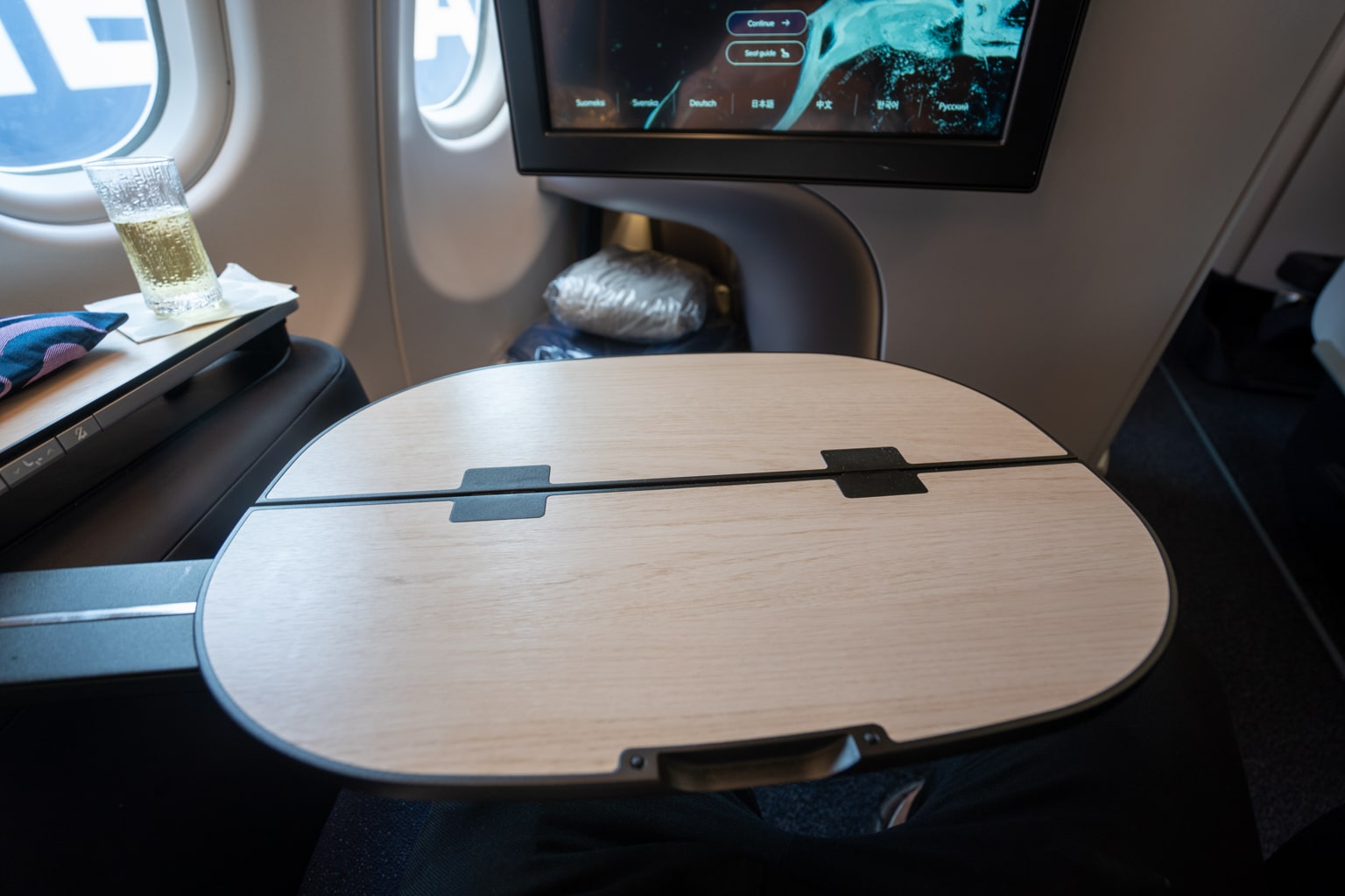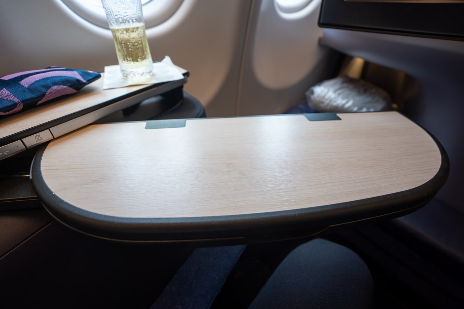 The tray table pops out of the wooden surface, and can be folded over into its full size. I found the movement of the tray table to be quite stiff, whereas I’d expect butter-smooth movement in the hard product of a brand-new business class.