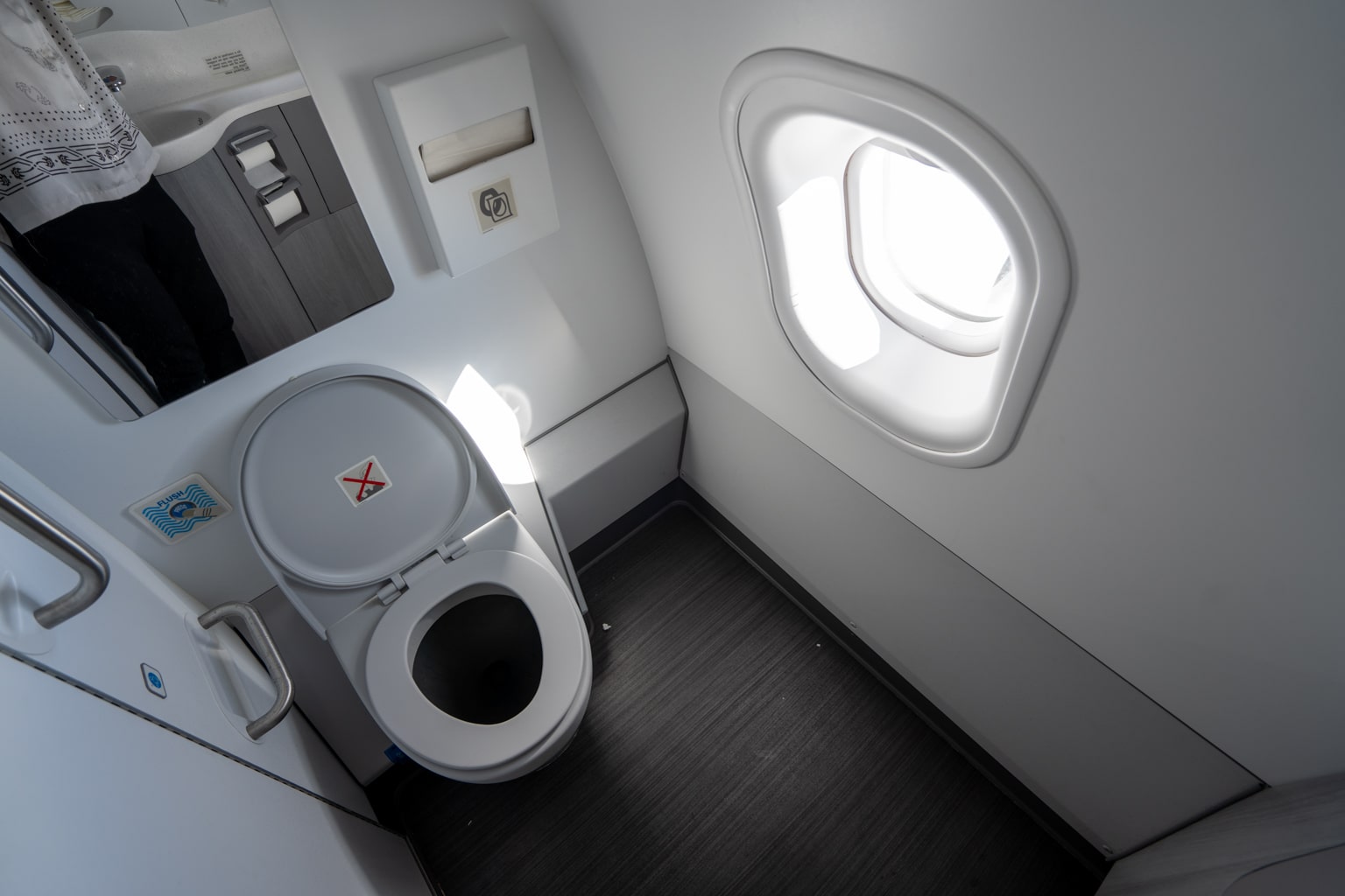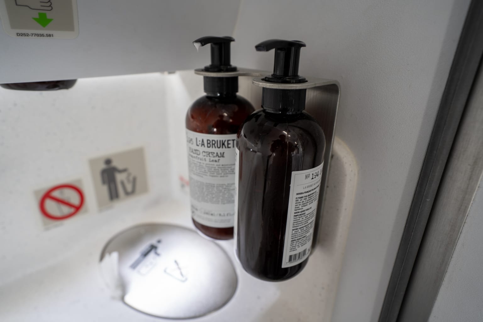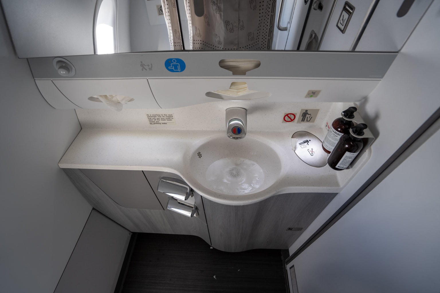 I thought the business class restroom was quite spacious. There was ample counter space surrounding the sink, hand cream amenities, and even a window.