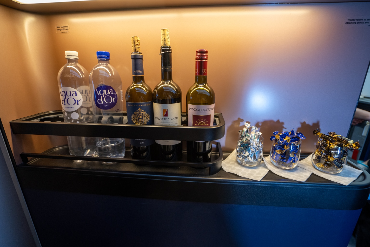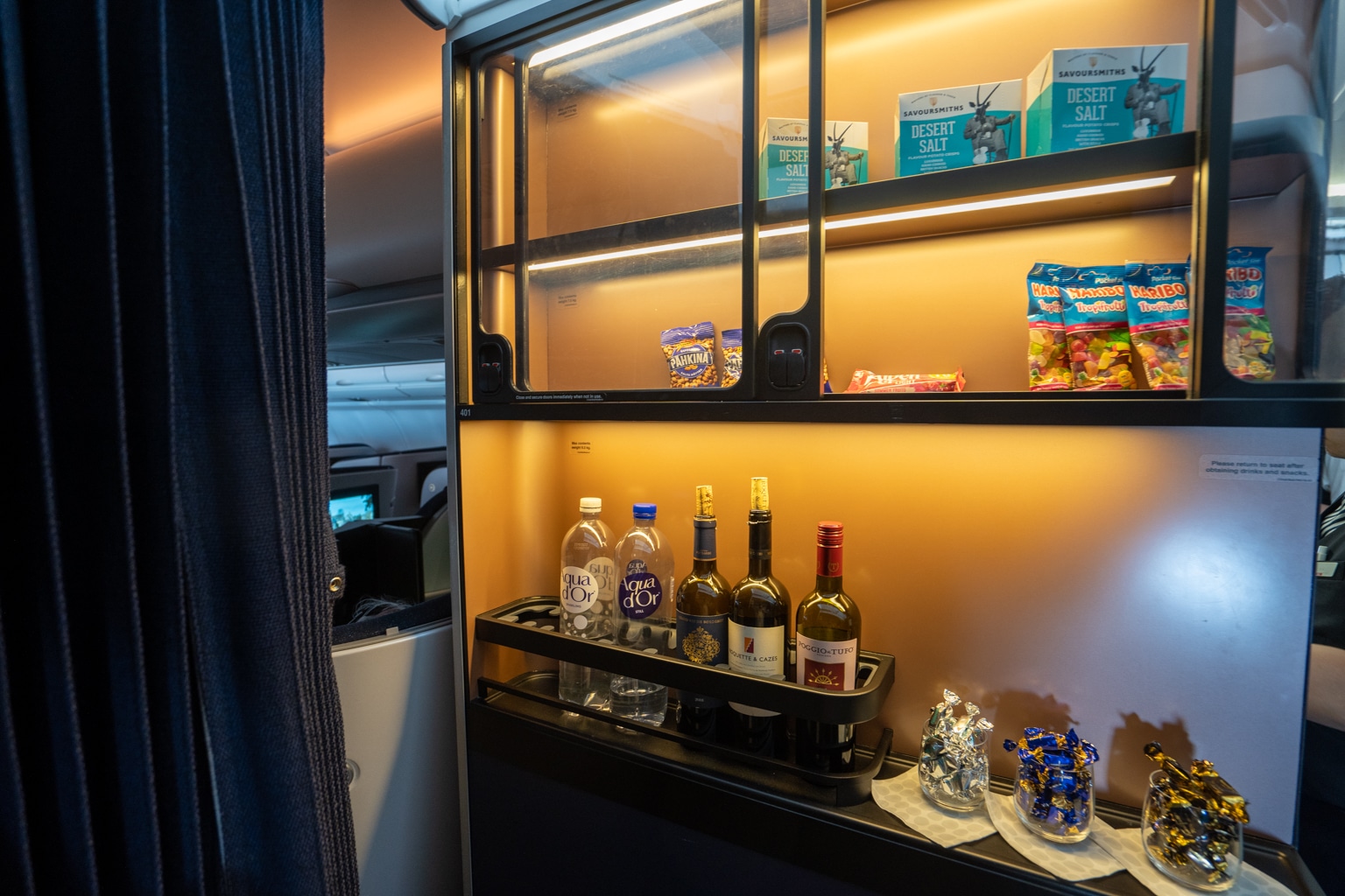 Finnair offers a snack cabinet in the galley for business class passengers to grab-and-go at their leisure.