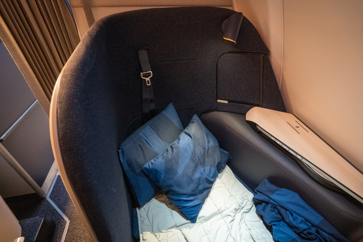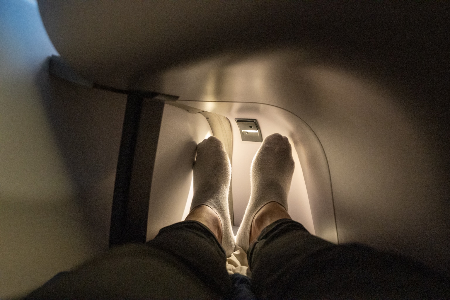 With how the seat and footwell shaped (funnelling towards either the left or right side of the seat), it’s best to lie on your side when sleeping. In my case, I found it most comfortable to sleep on my left side facing the window, as the footwell is on my left side.