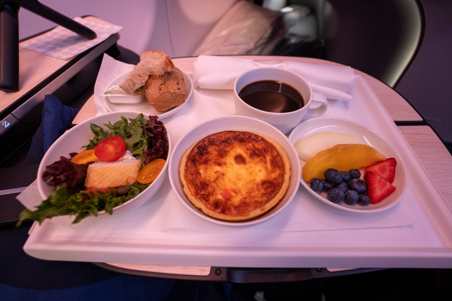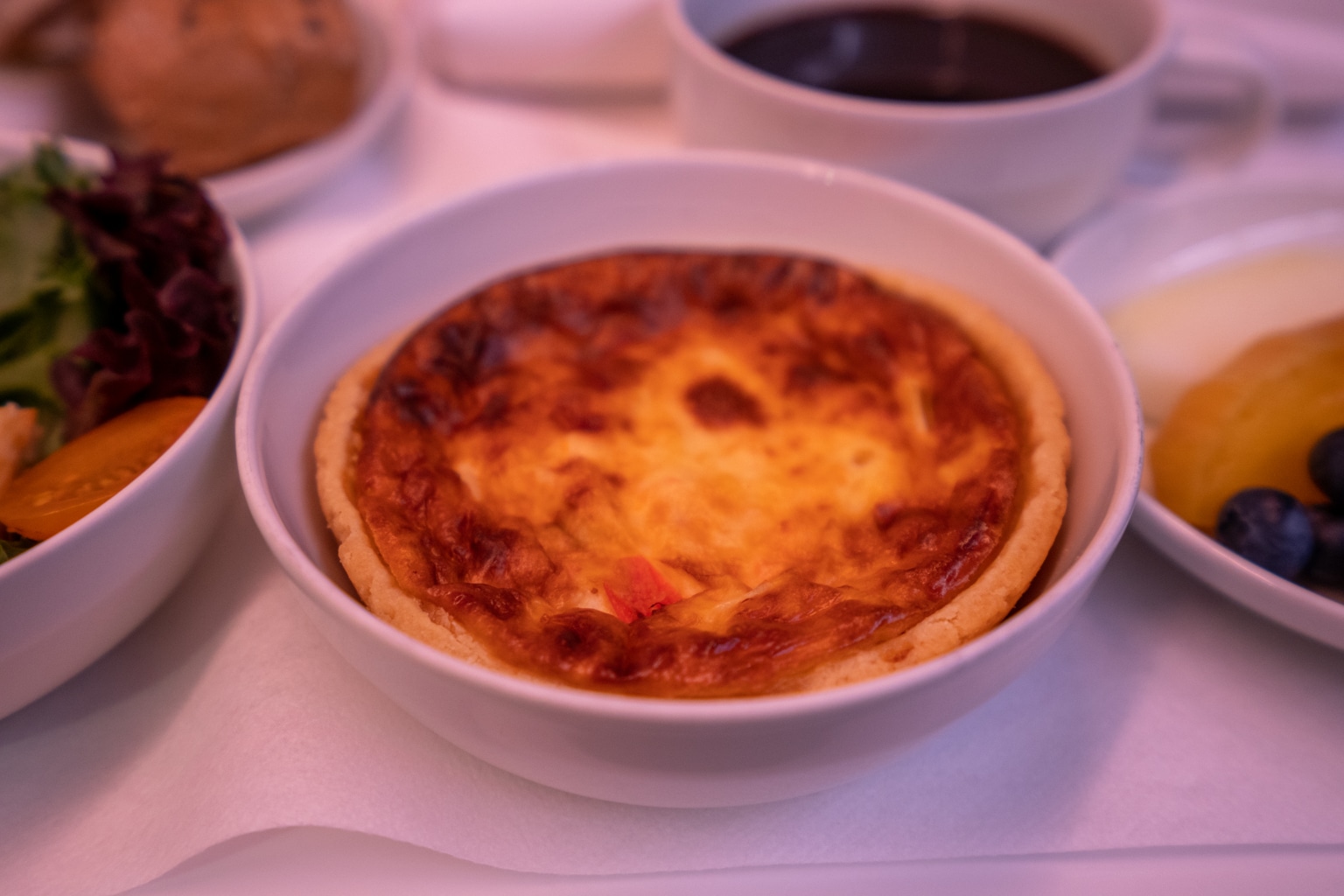 With just two hours of flight time remaining, the brunch course was served. This lighter meal consisted of a quiche with a Greenland halibut salad on the side, along with a cup of coffee.