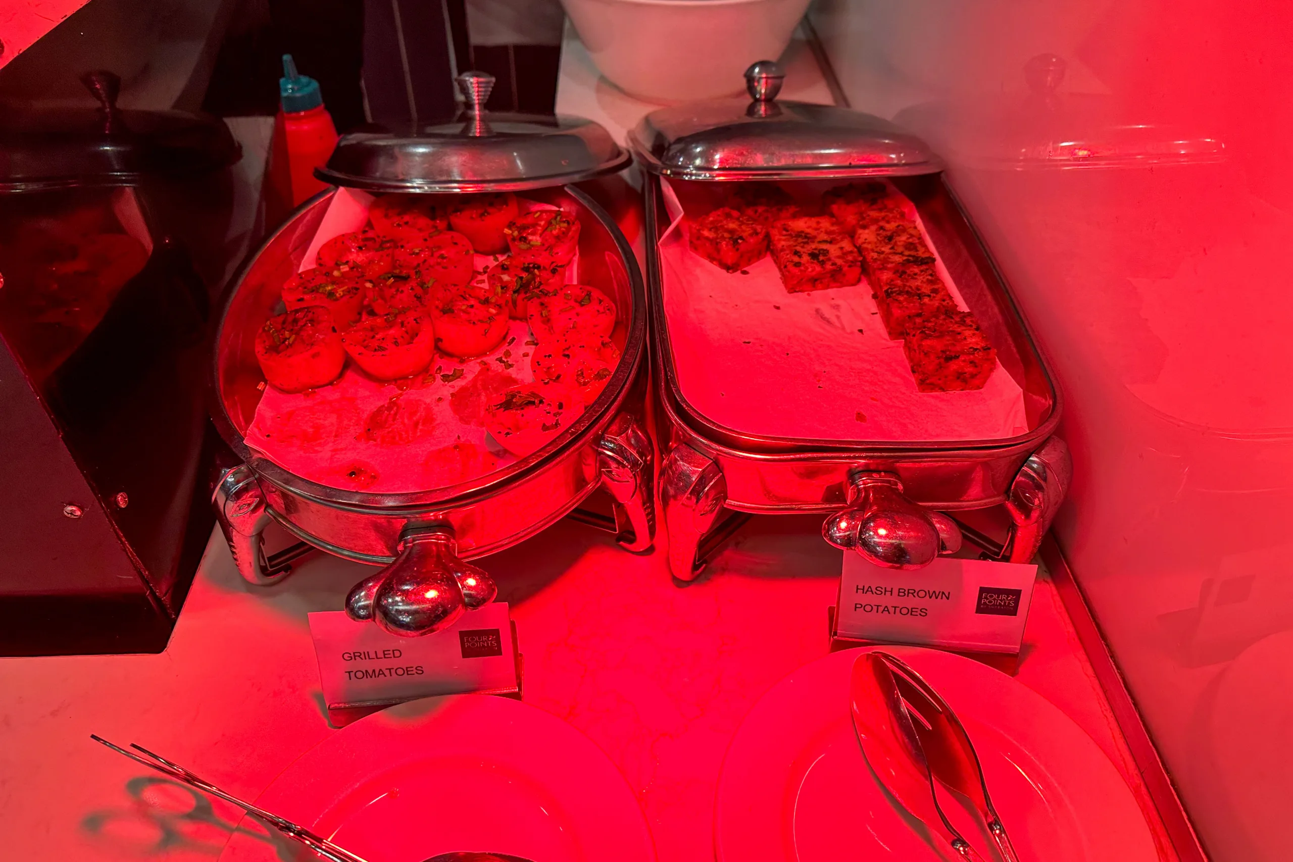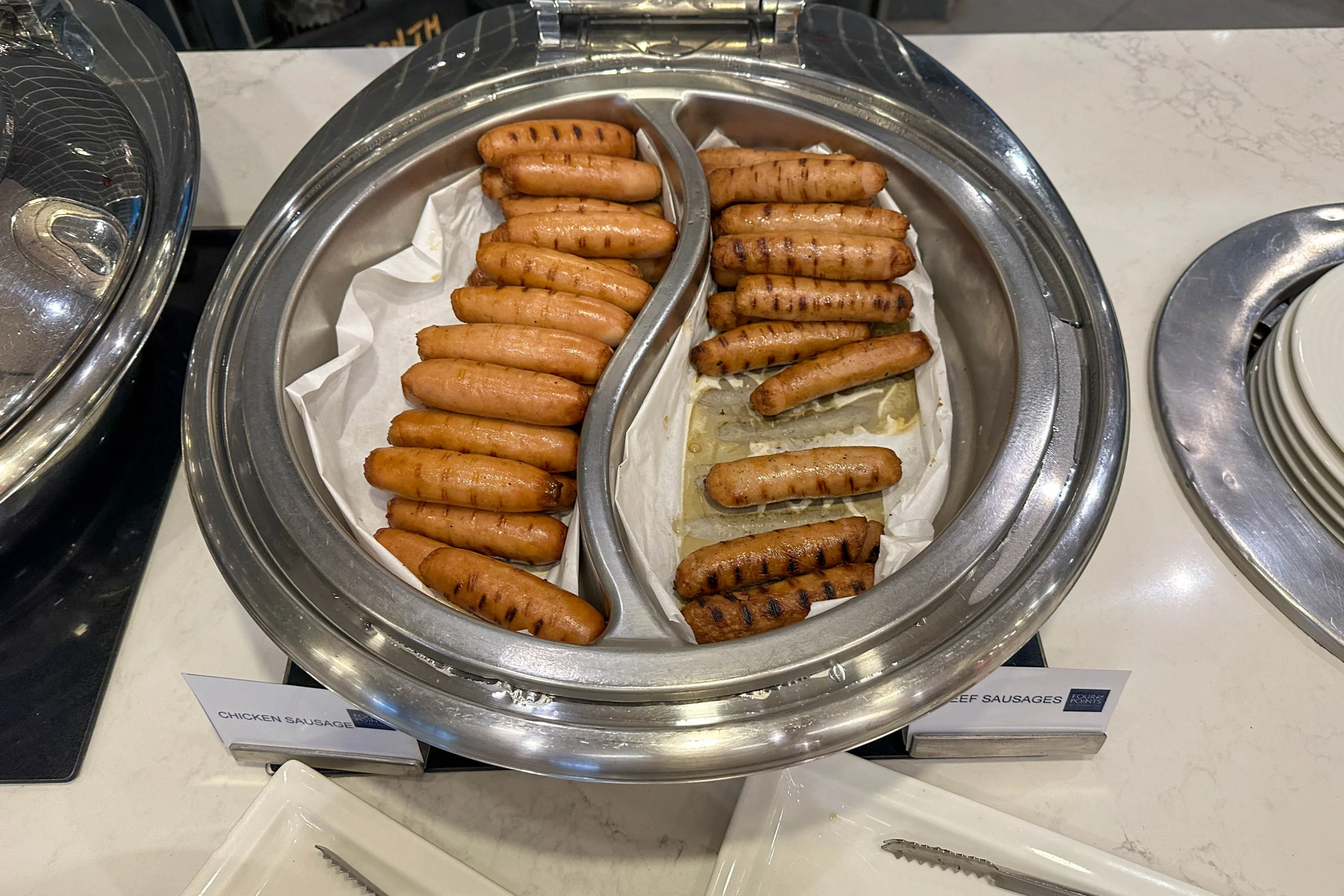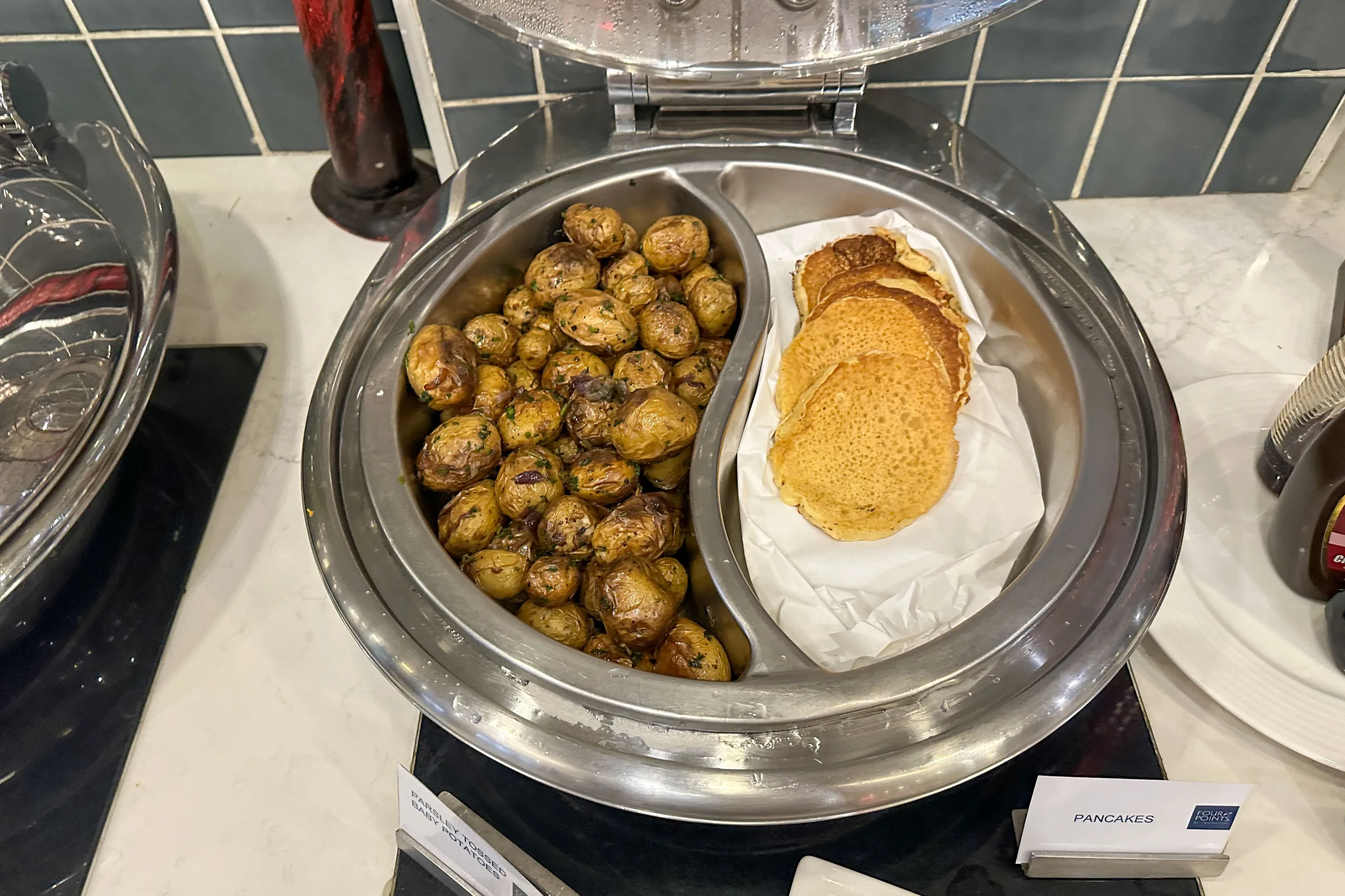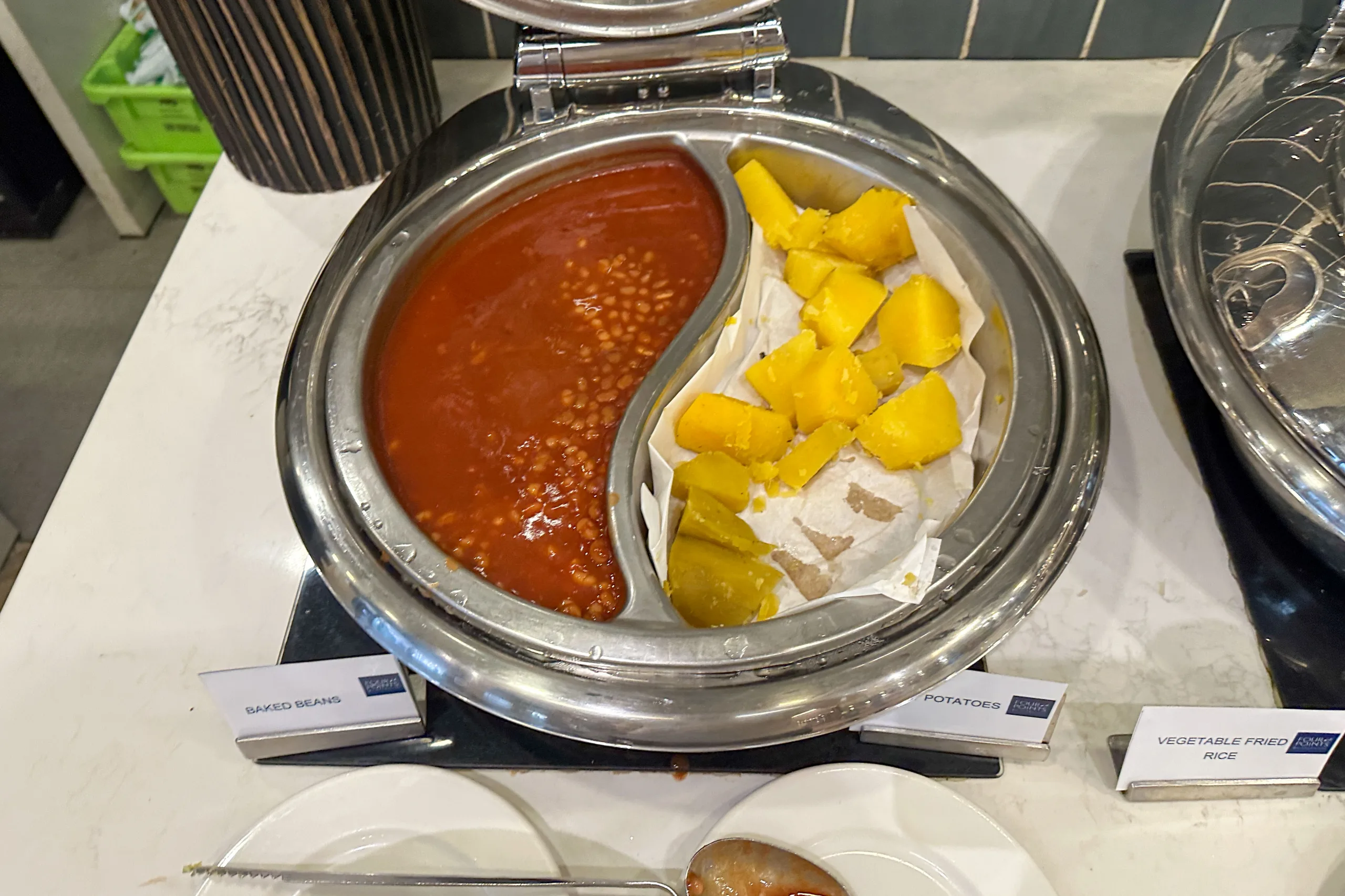 Western dishes on offer include scrambled eggs, bacon, sausages, assorted fried potatoes, baked beans, cereal, pastries, and fruits.
