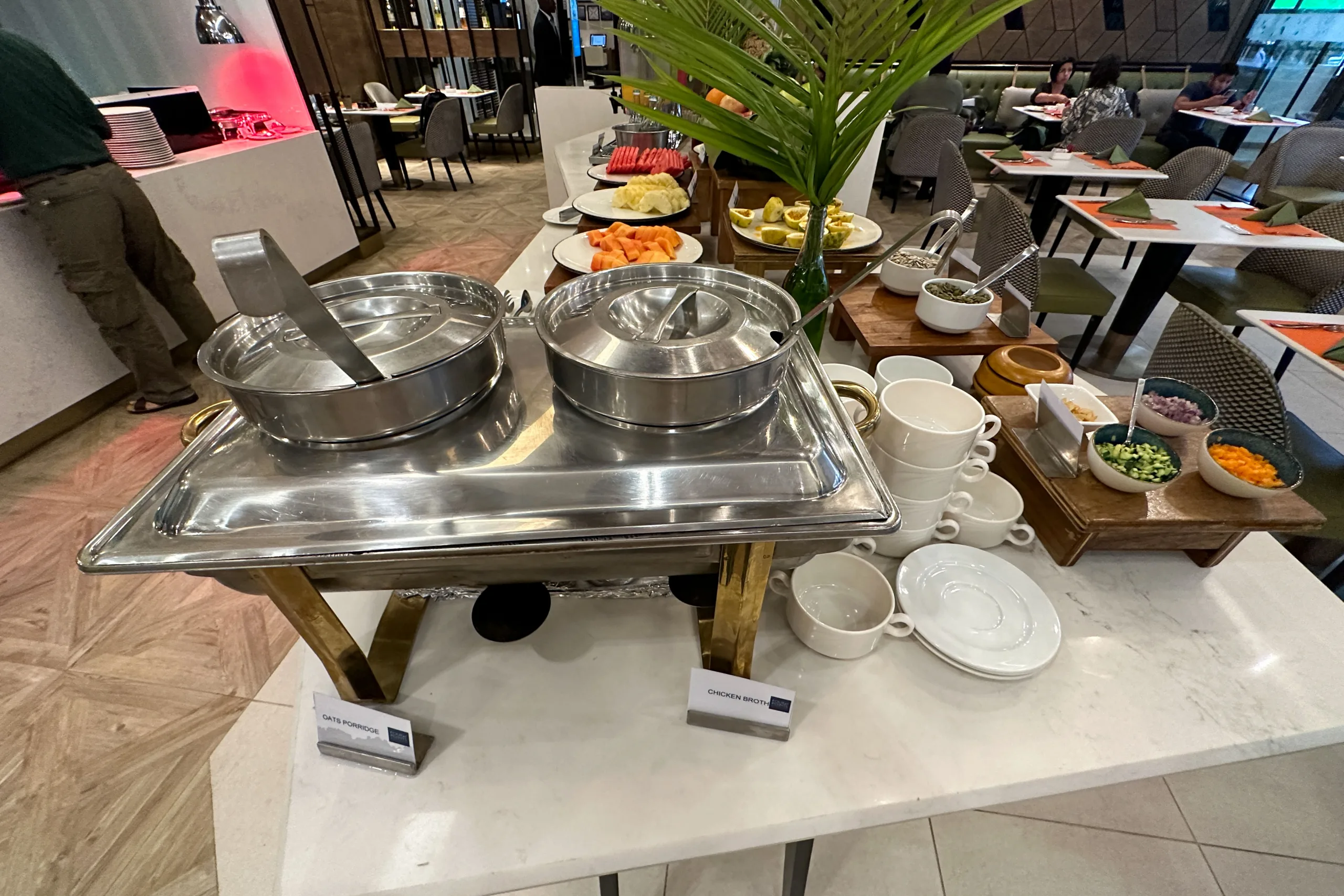 Assorted fruits and pastries are also available, as well as both broth and porridge.