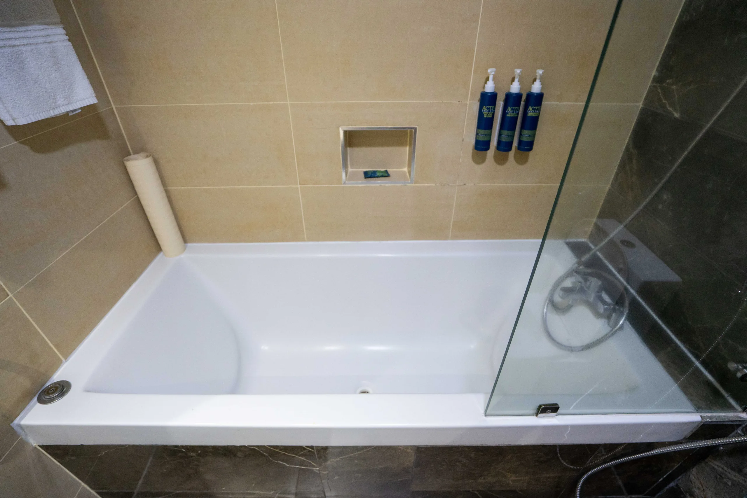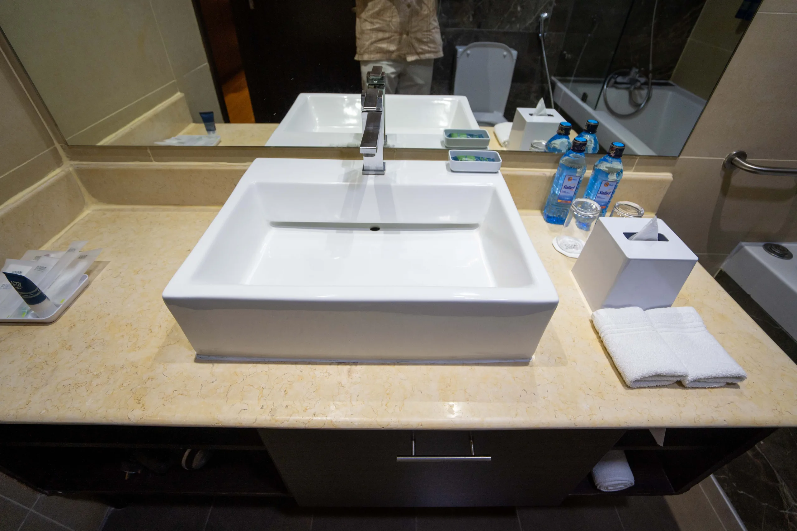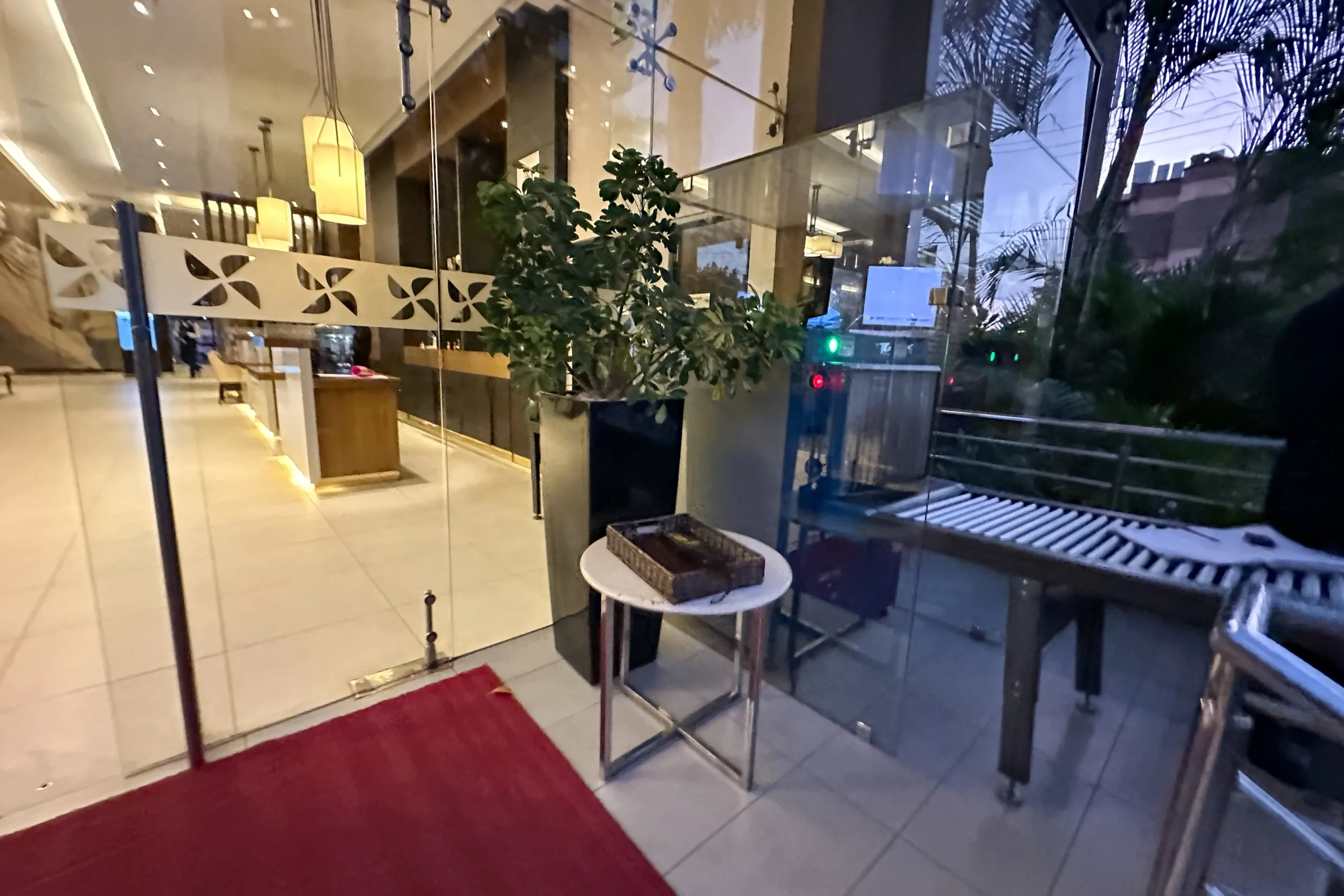Following the security checks, I was met with a straightforward and unassuming façade, painted in muted beige and complemented by a simplistic glass frontage. Surrounding the hotel, a collection of palm trees and various tropical plants intermingle.
