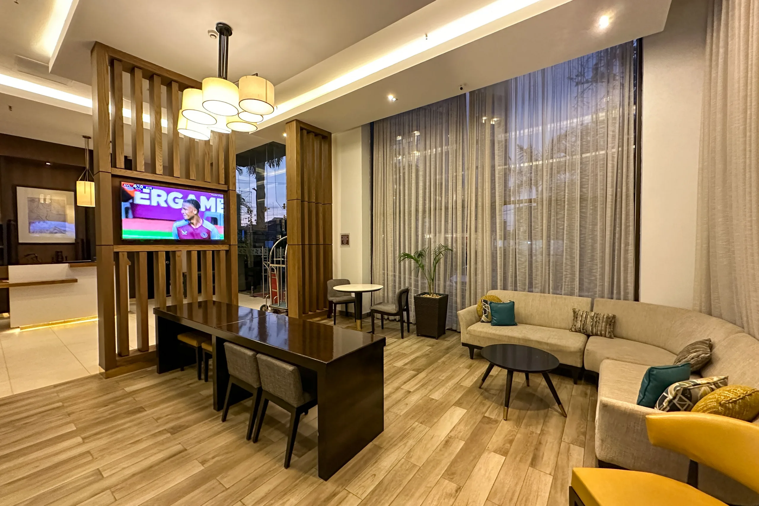 Once inside, the practicality continues in the lobby, where three check-in desks are strategically positioned. Adjacent to this, a minimalist seating area and desk are found, paired with a grey sofa, which is livened up by yellow and green throw pillows.