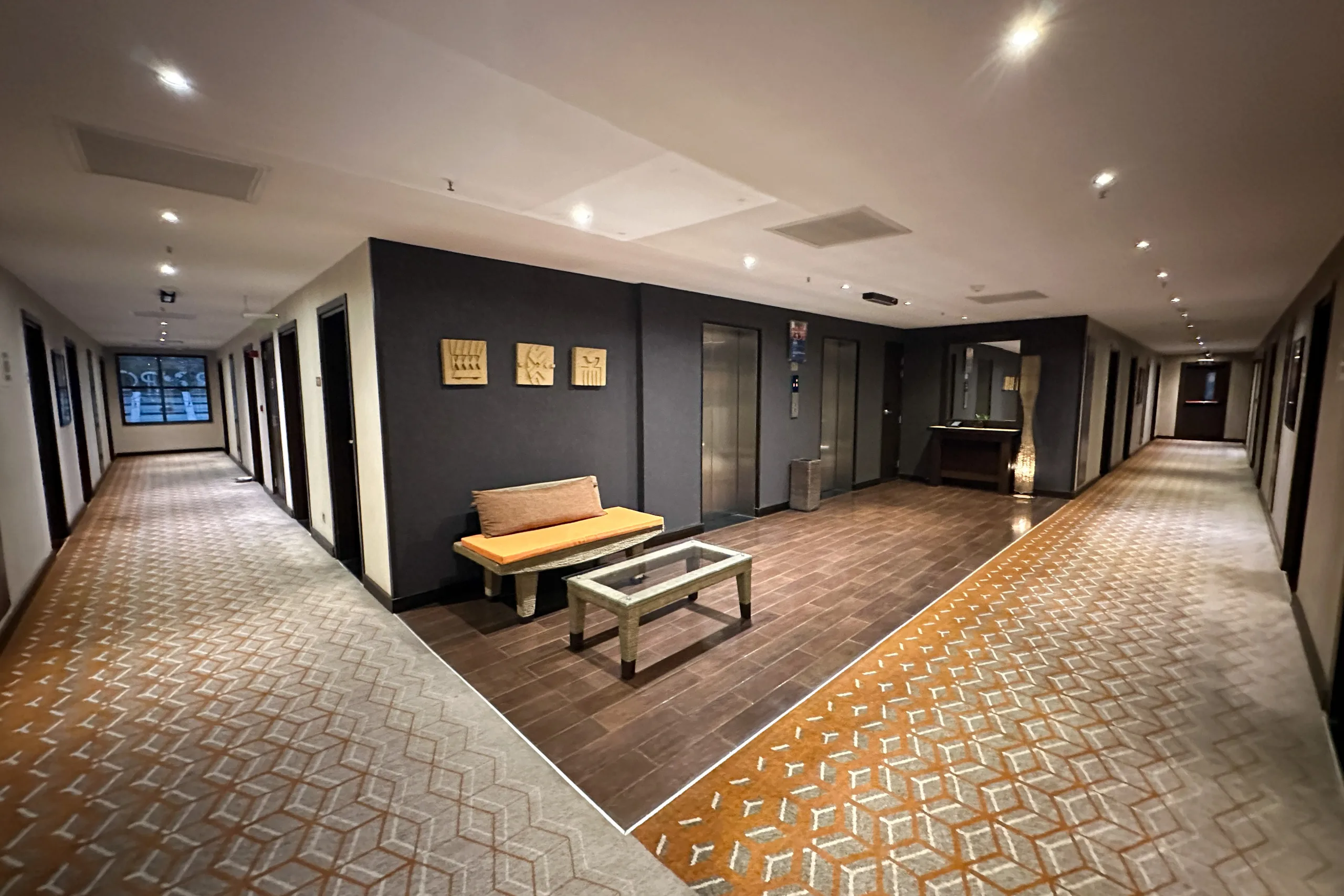 The guest room hallways are modern with an understated aesthetic. A balanced palette of dark and light grey uniformly adorns the walls.