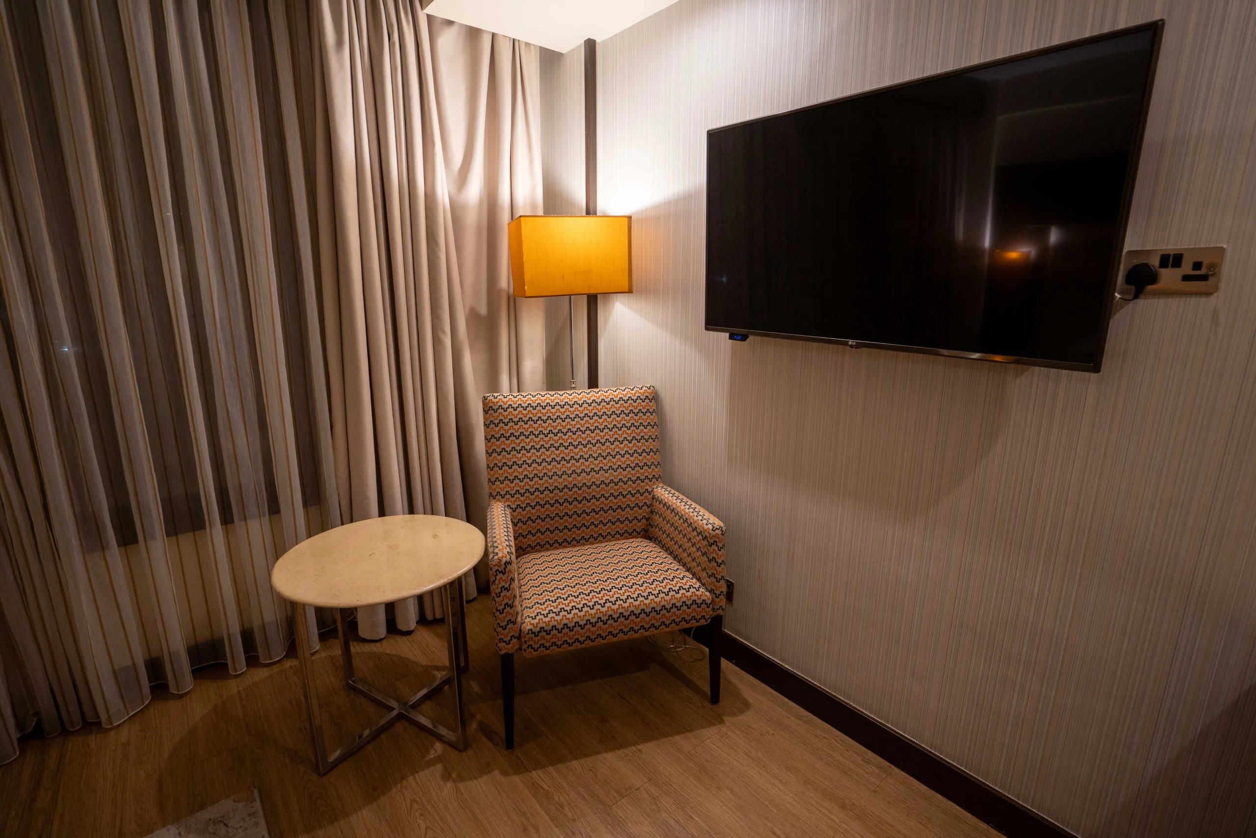 Tucked into the right-hand corner, there’s a beige armchair with a geometric pattern on the upholstery, with a small, round table nearby.