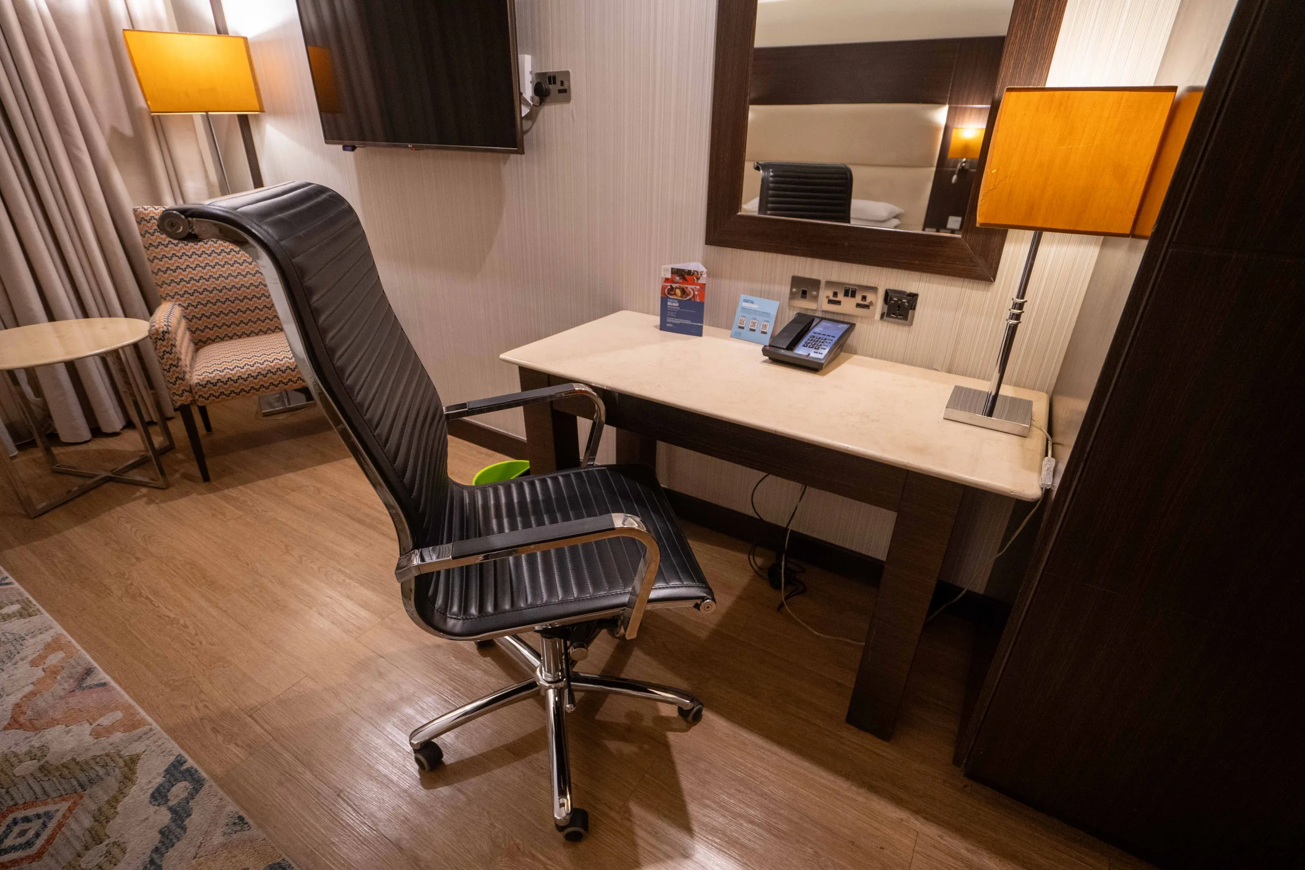 Adjacent to the TV, there’s a desk with a chair and a lamp. The desk has a mirror above it and a minibar below it.