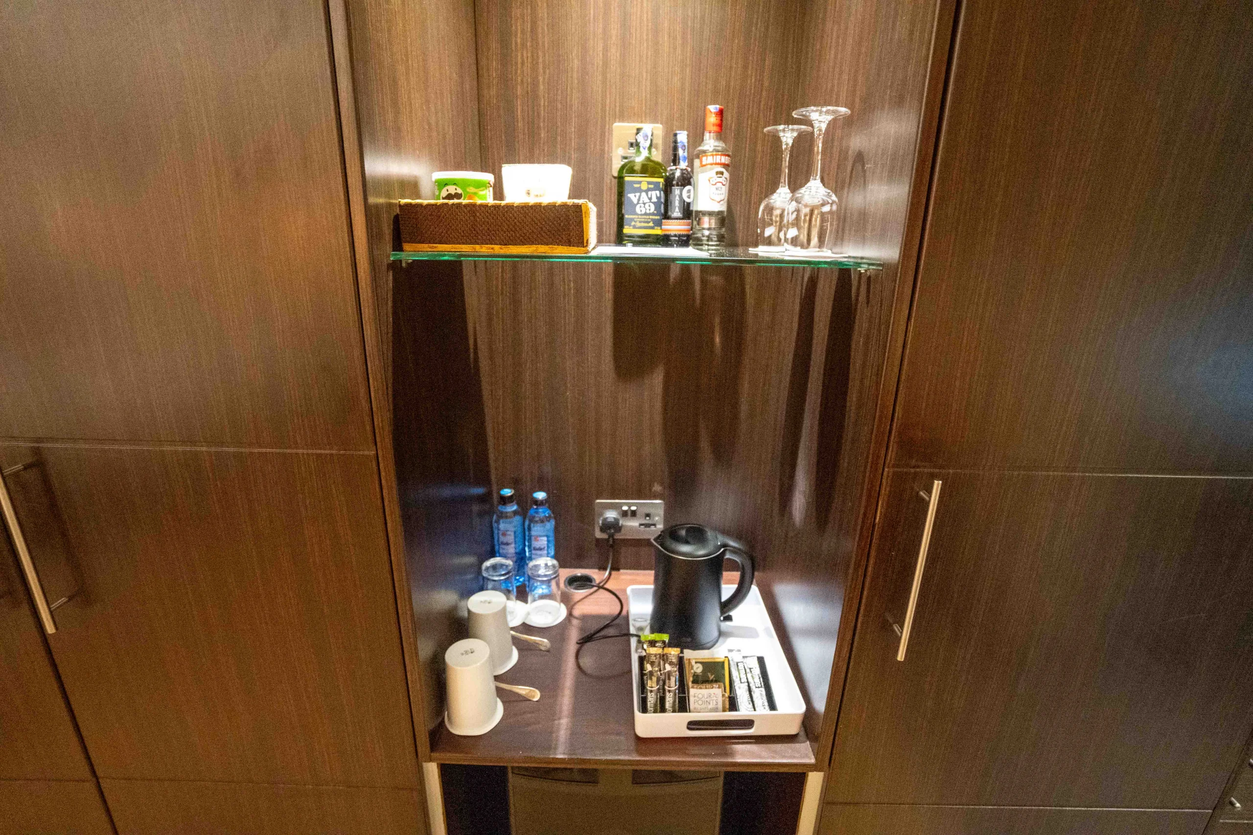 The minibar is built into a wooden cabinet on the right-hand wall. On the top shelf, there are a few bottles of alcohol and snacks. On the bottom shelf, there are two bottles of water, a kettle, and a coffee maker.