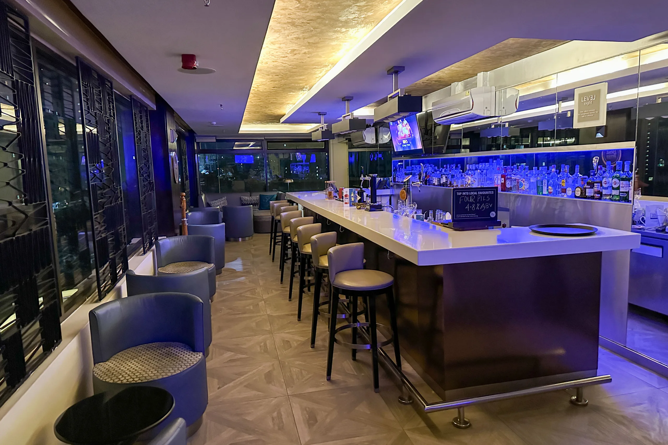 From Mezzé on the Deck, you can take the stairs down one level to Level 8 Lounge & Bar, another rooftop spot. The ambiance is ultra-cool, with blue and purple ambient lighting accentuating the bar.
