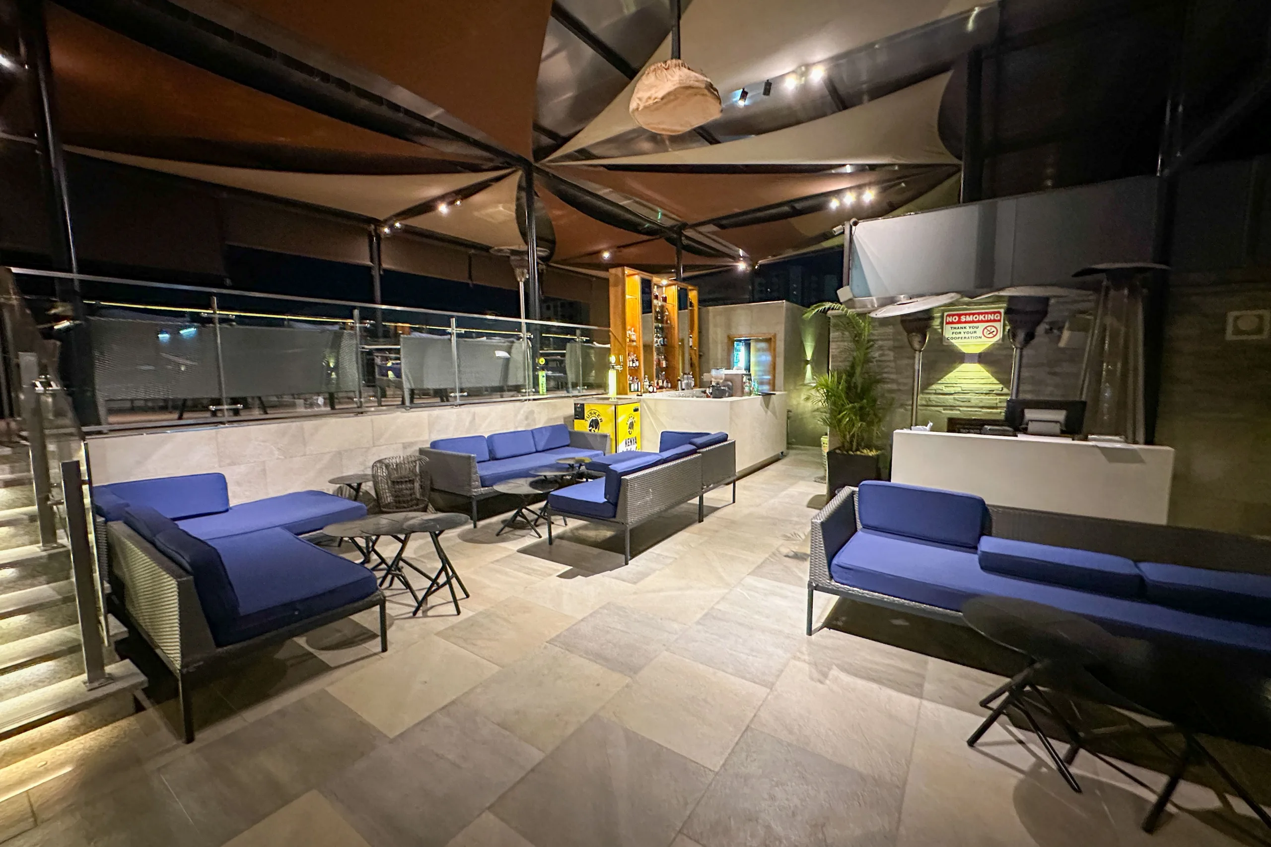 The outdoor area is spread over two levels. The upper level offers cozy seating under a white canopy, with comfortable rattan armchairs and bar stools. If you prefer something more laid-back, there are sofas on the level below.