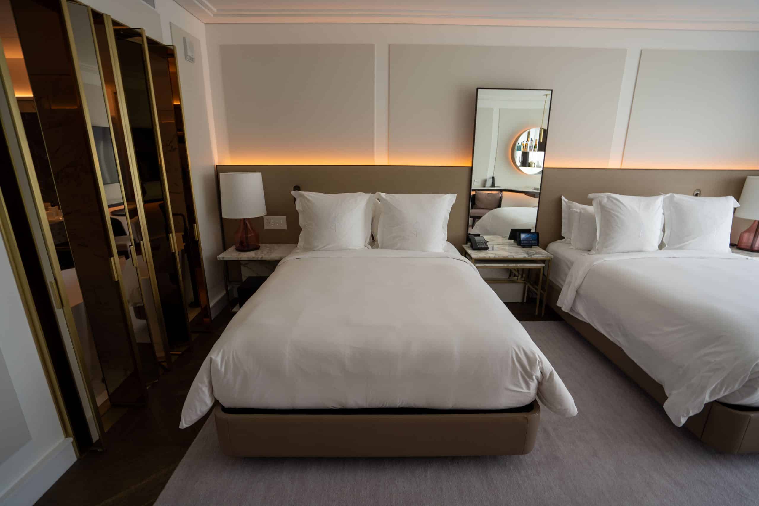 The Premier Two Queen Room is furnished with two queen beds that are flanked by marble side tables.