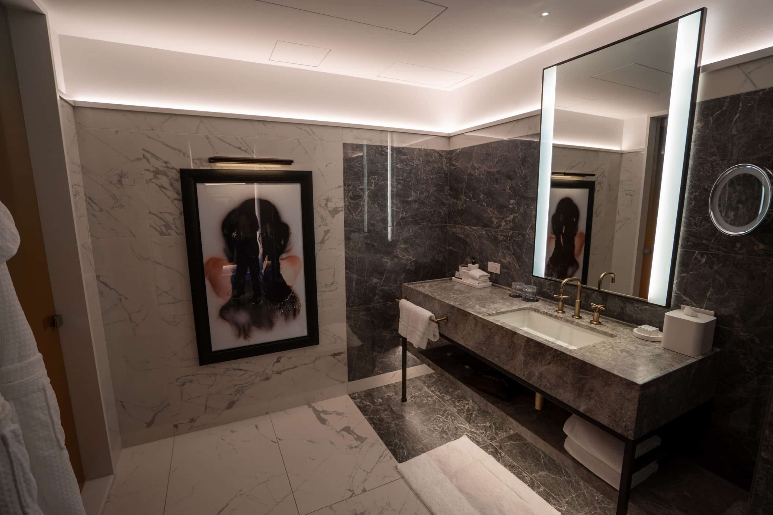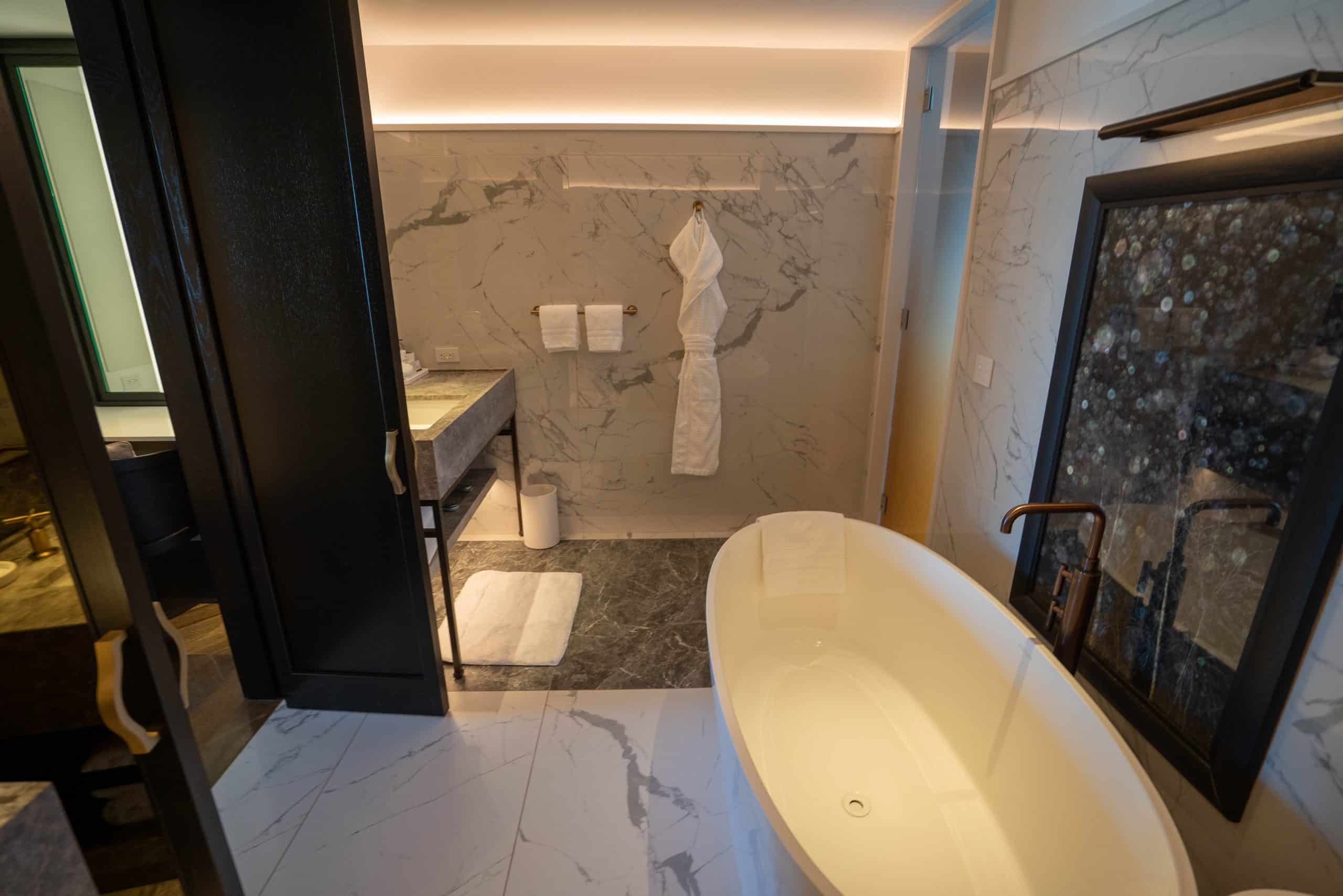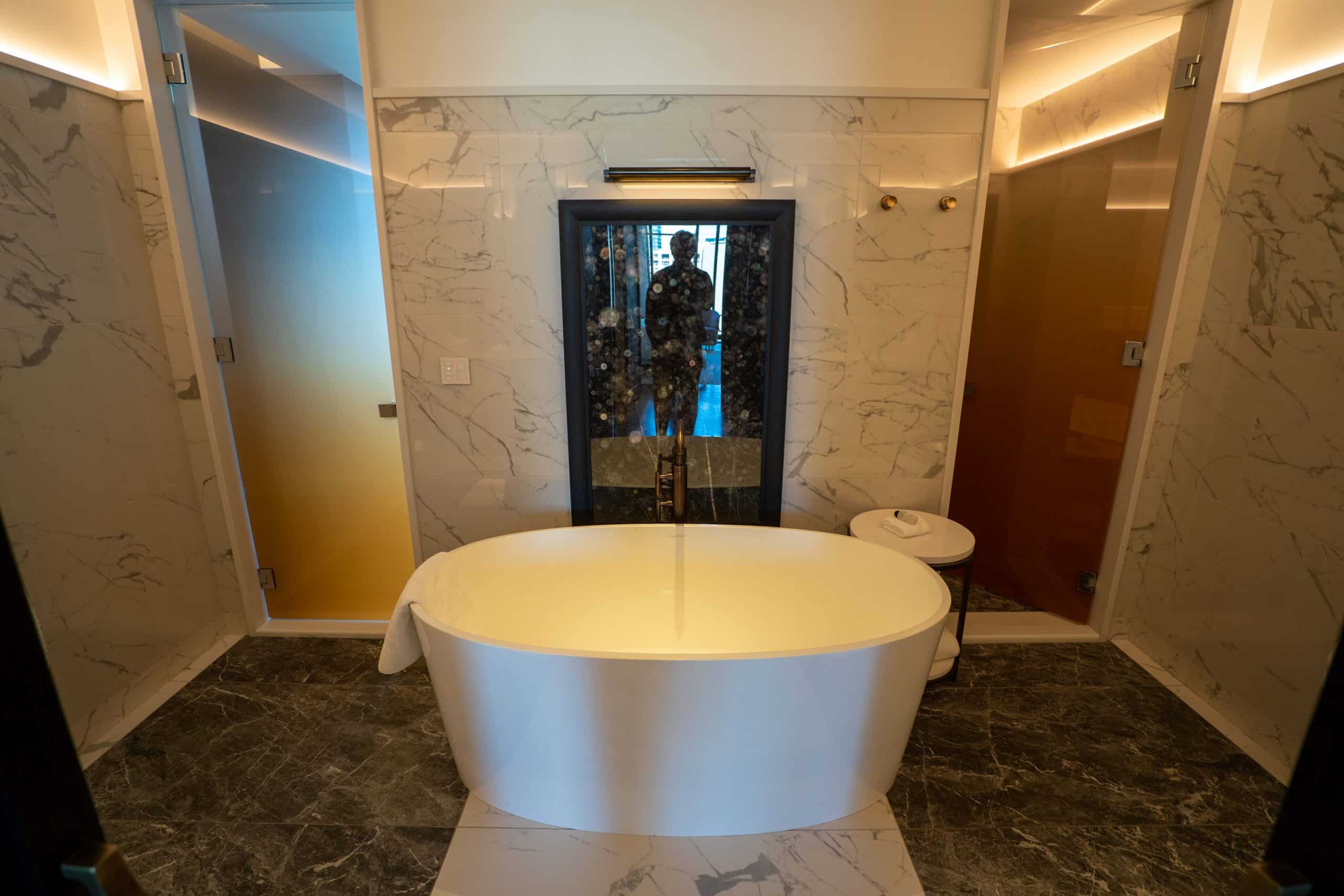 The bathroom is accessible near the beds and through a separate entrance at the foyer upon entering. It’s spacious and exquisite, clad in a cohesive blend of grey and white marble.