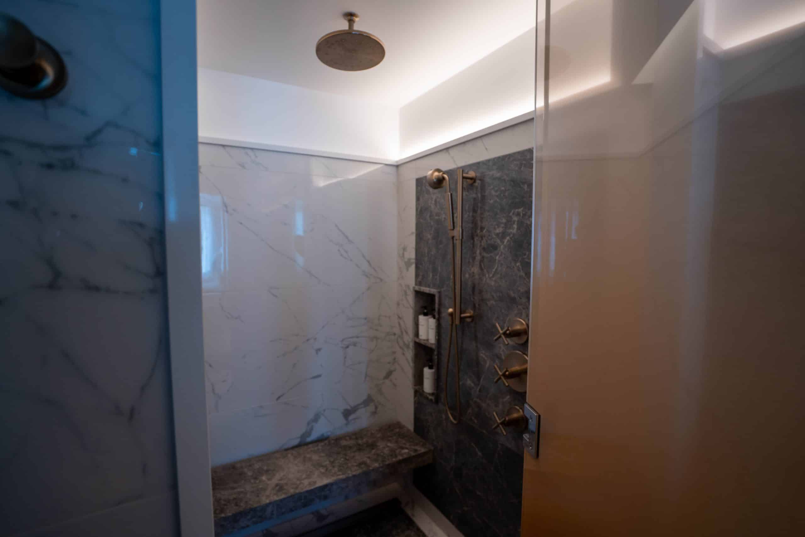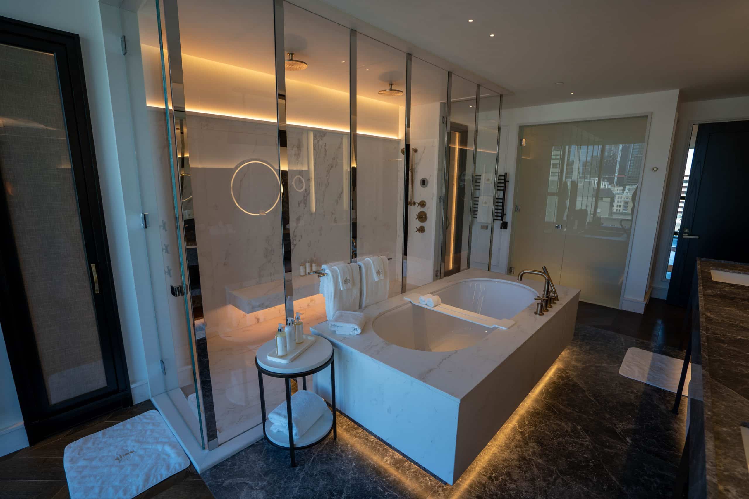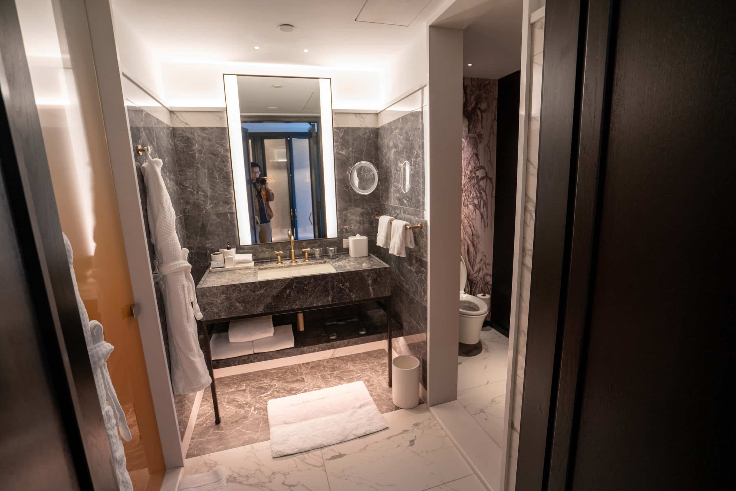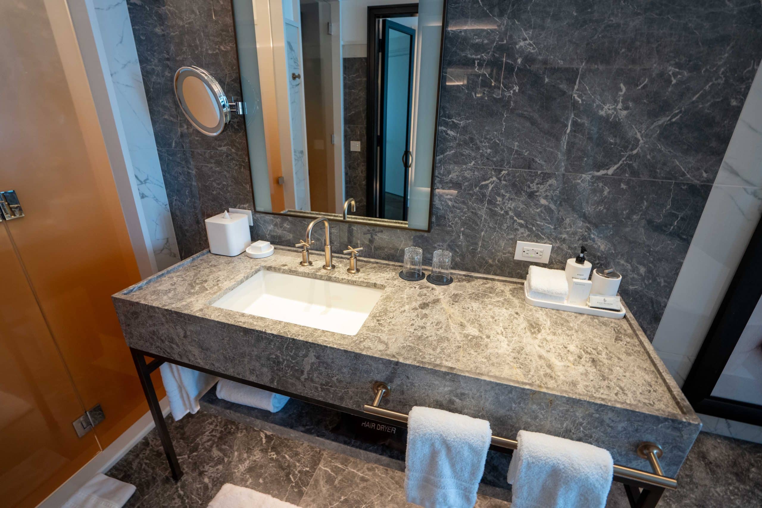 The bathroom is accessible near the beds and through a separate entrance at the foyer upon entering. It’s spacious and exquisite, clad in a cohesive blend of grey and white marble.