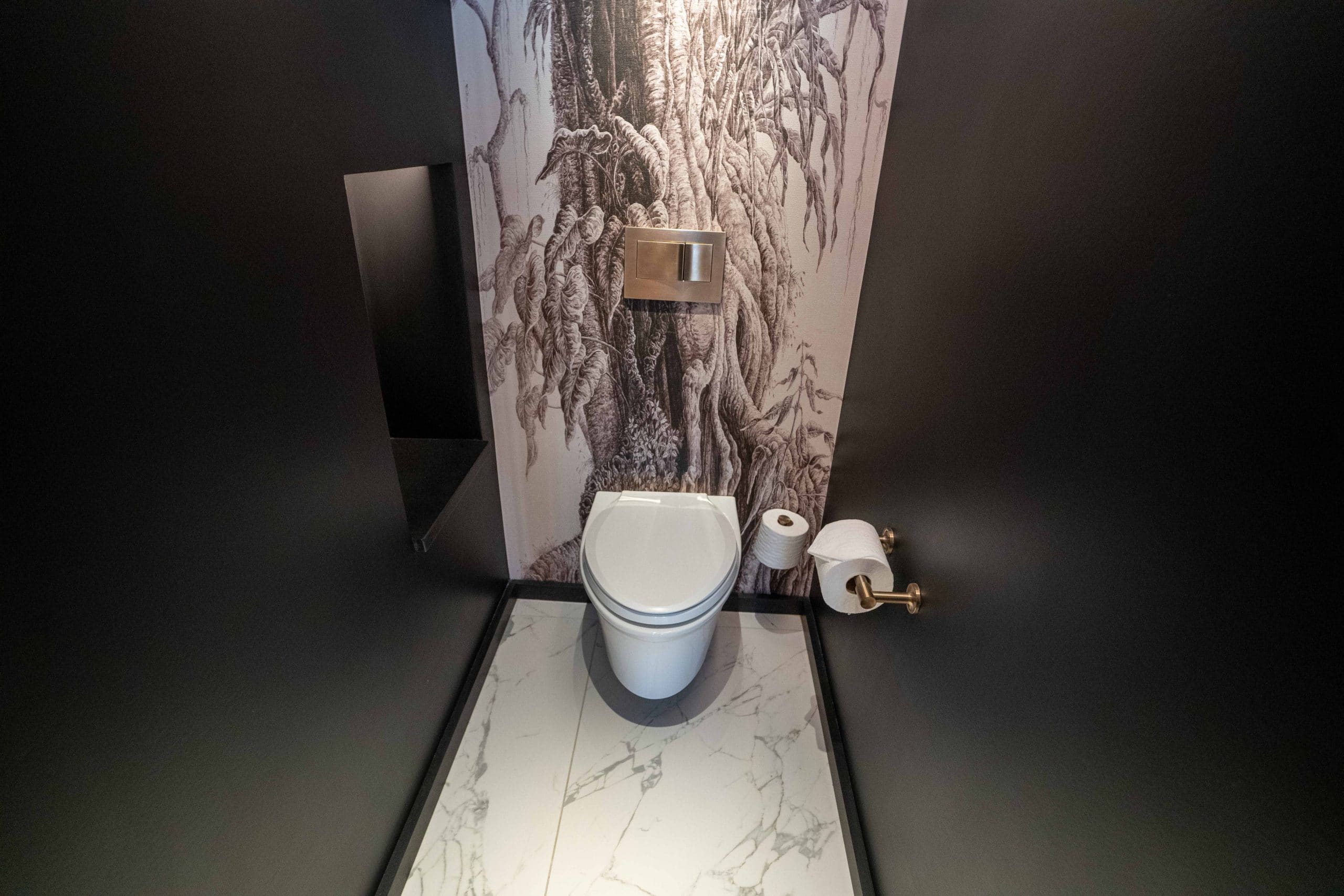 The toilet is housed within its own compartment, adorned with a playful accent wall.