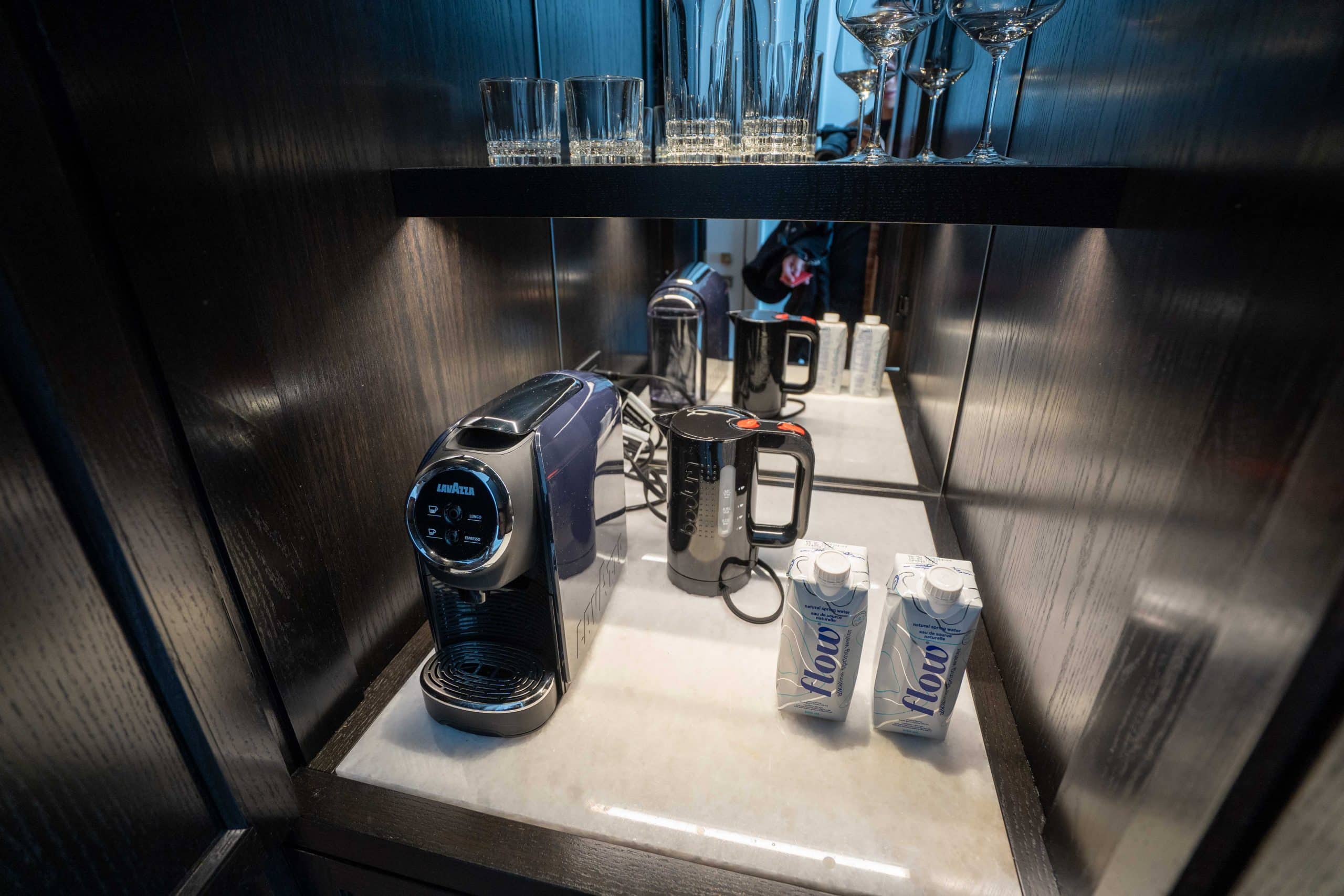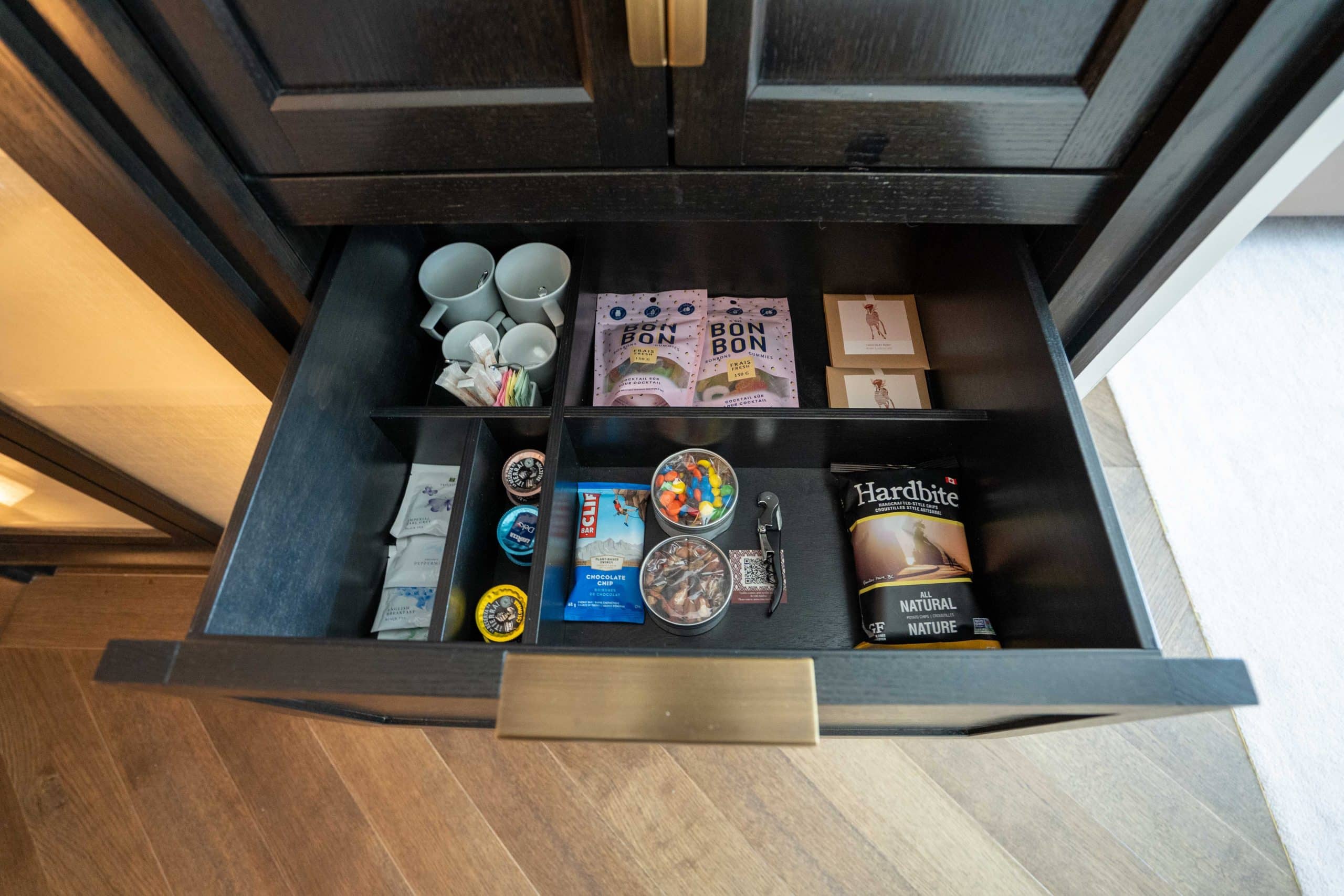 A cabinet houses a Lavazza coffee maker and a pair of Flow boxed water with a well-stocked snack drawer below.