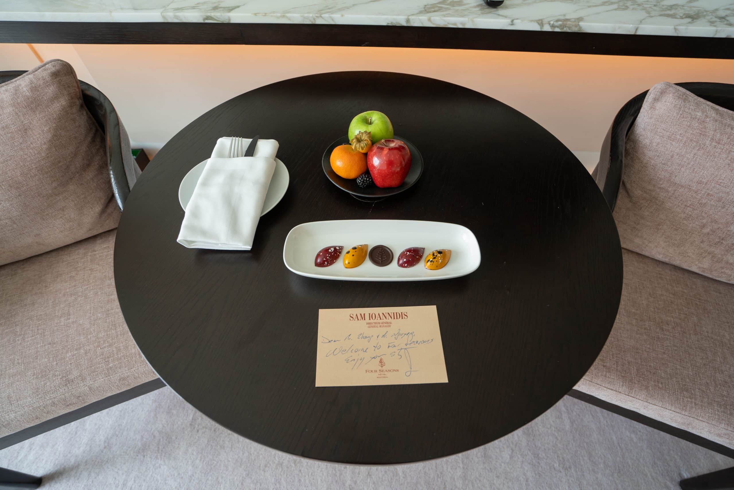 Additionally, there’s a pair of armchairs. Here, a table was proactively set up with a Four Seasons welcome amenity, including a handwritten note, leaf-shaped sweets, and a chocolate with the Four Seasons logo.