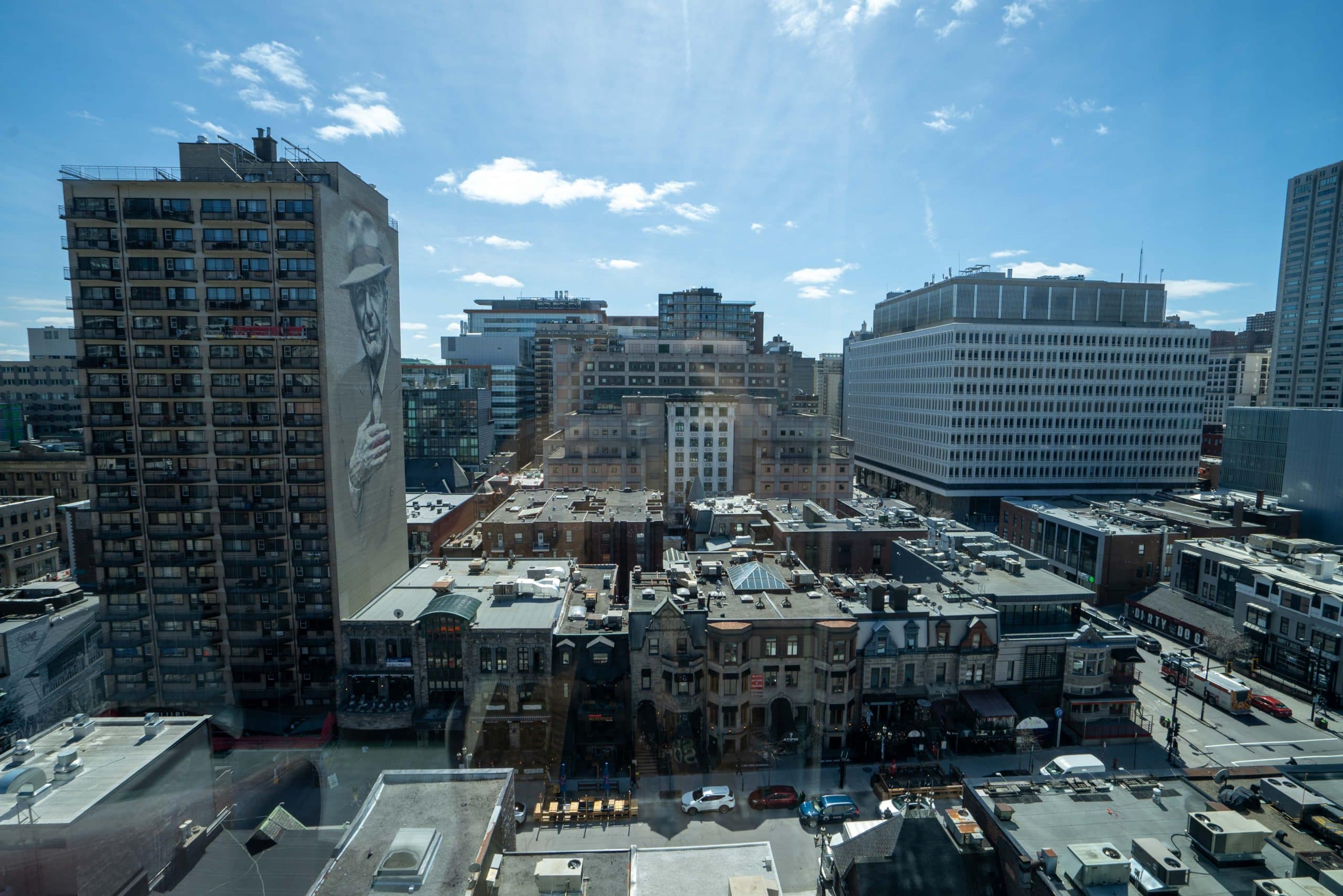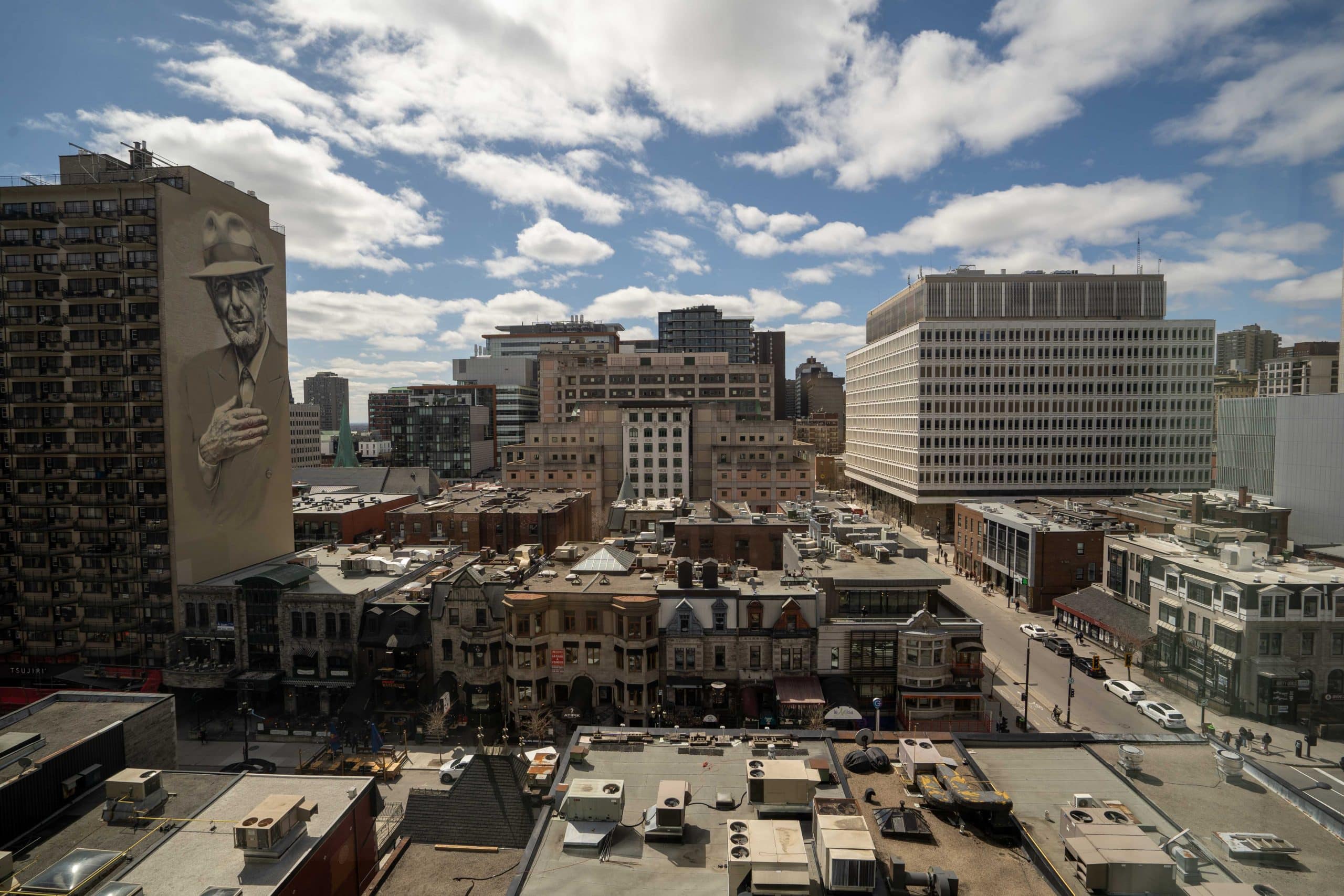 Moreover, the room features a plush seat positioned next to the floor-to-ceiling windows for a comfortable spot to take in views of Montreal and the Leonard Cohen mural.