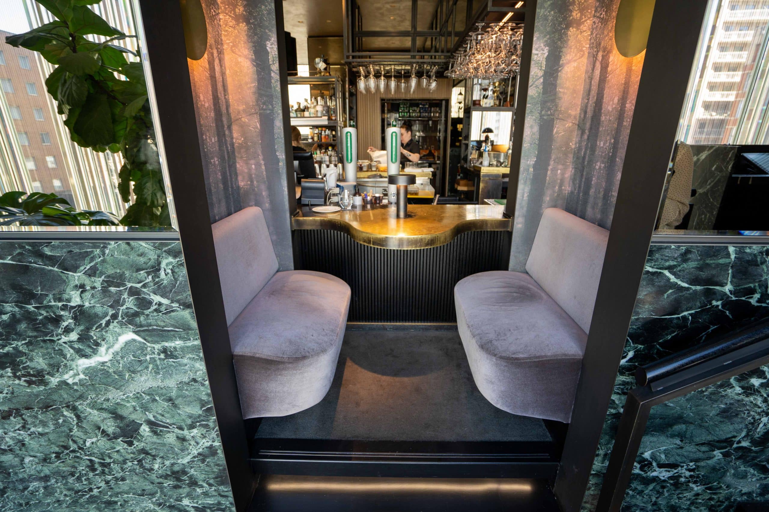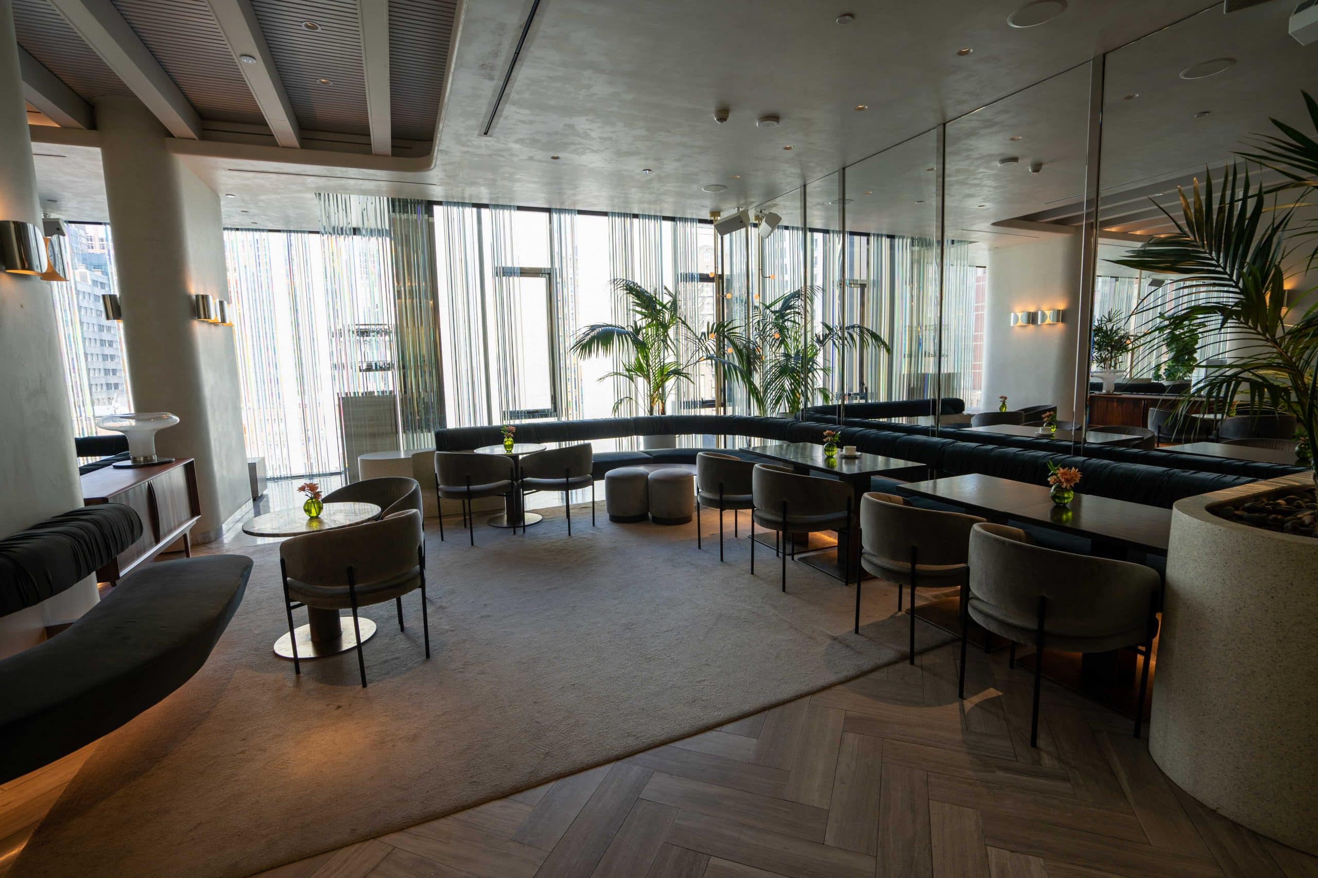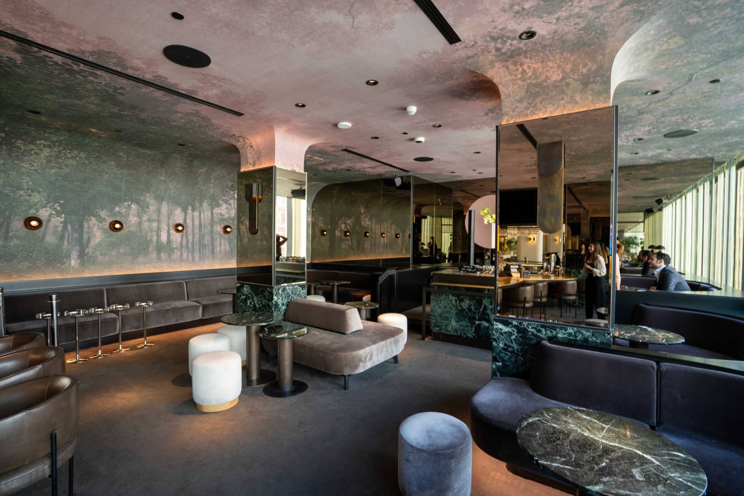 The design impresses with its artful composition, making it feel as if trees are climbing up and over the space. Plush booth and sofa-style seating options provide ample opportunities to indulge in a carefully crafted cocktail.