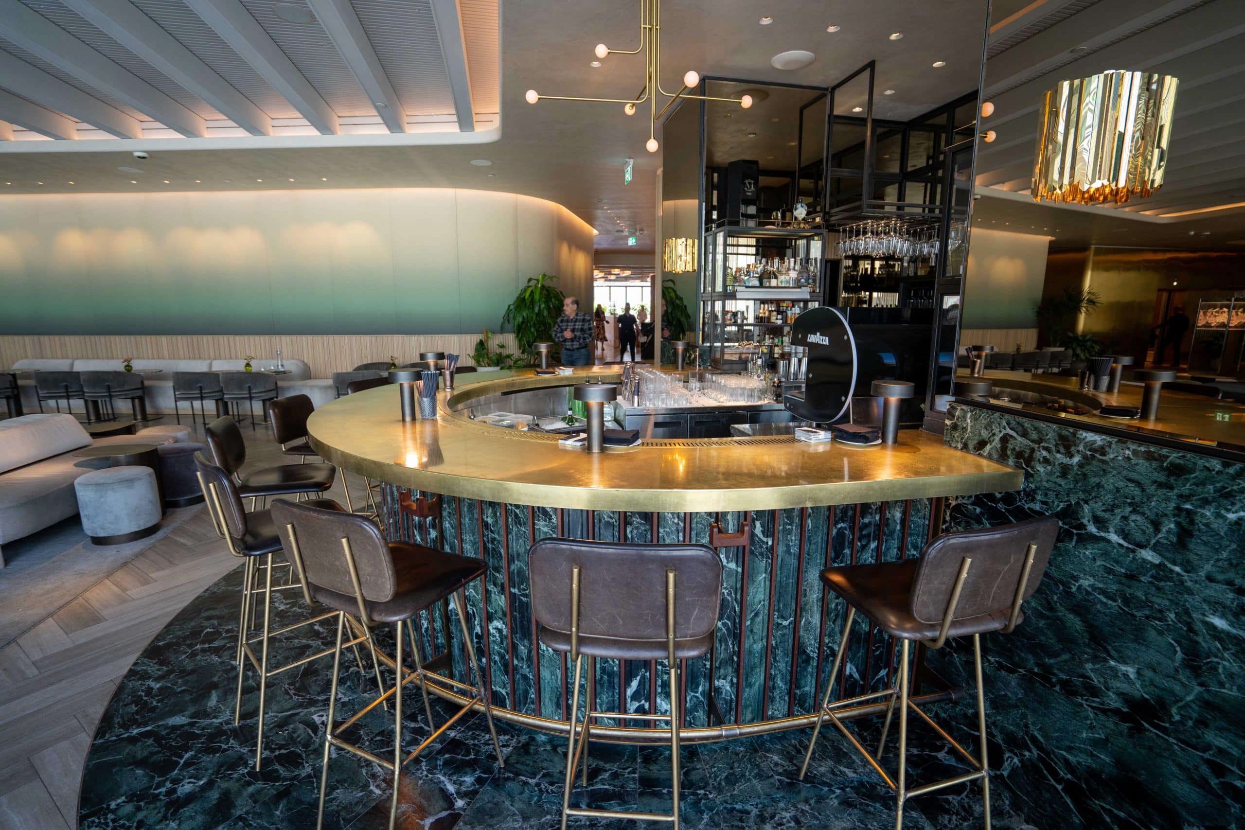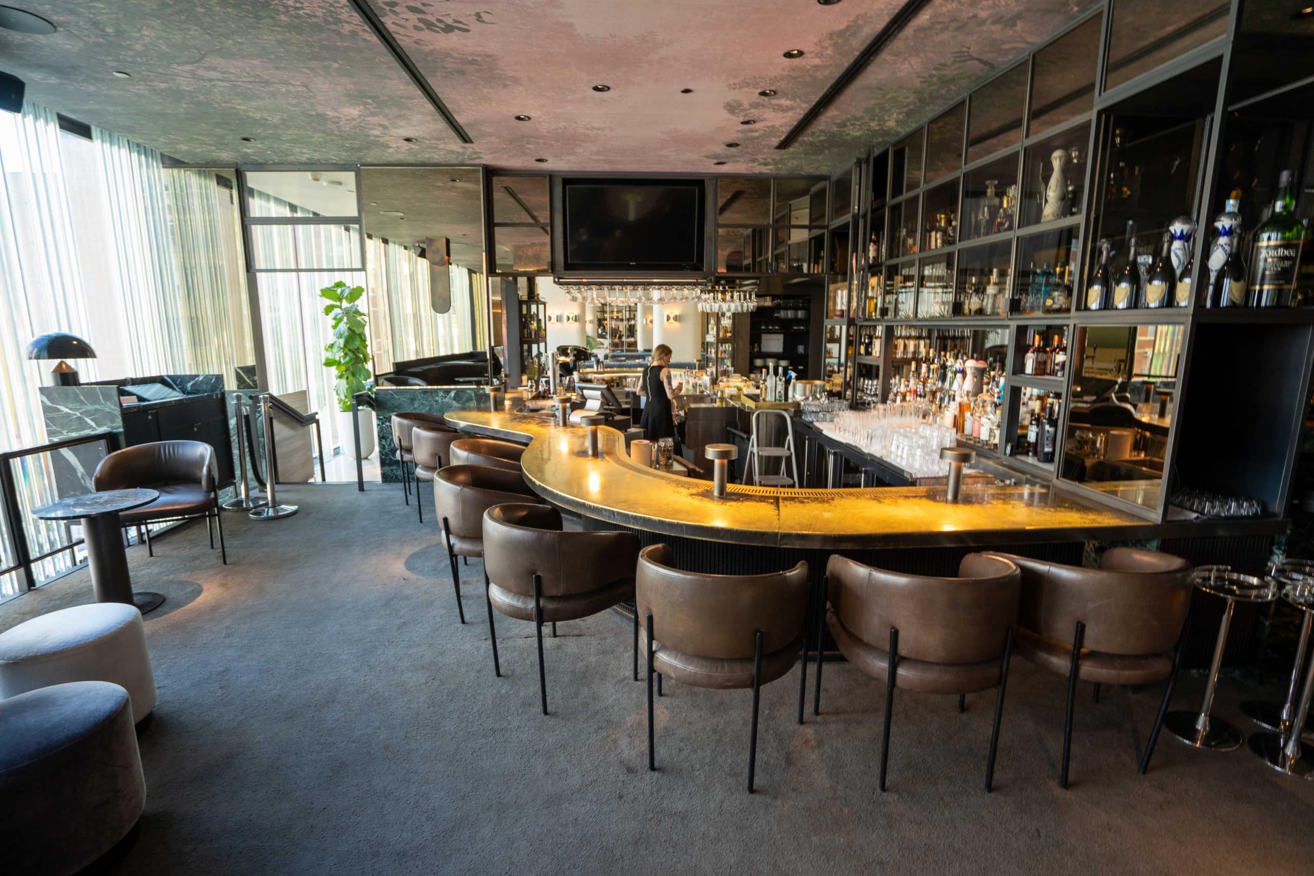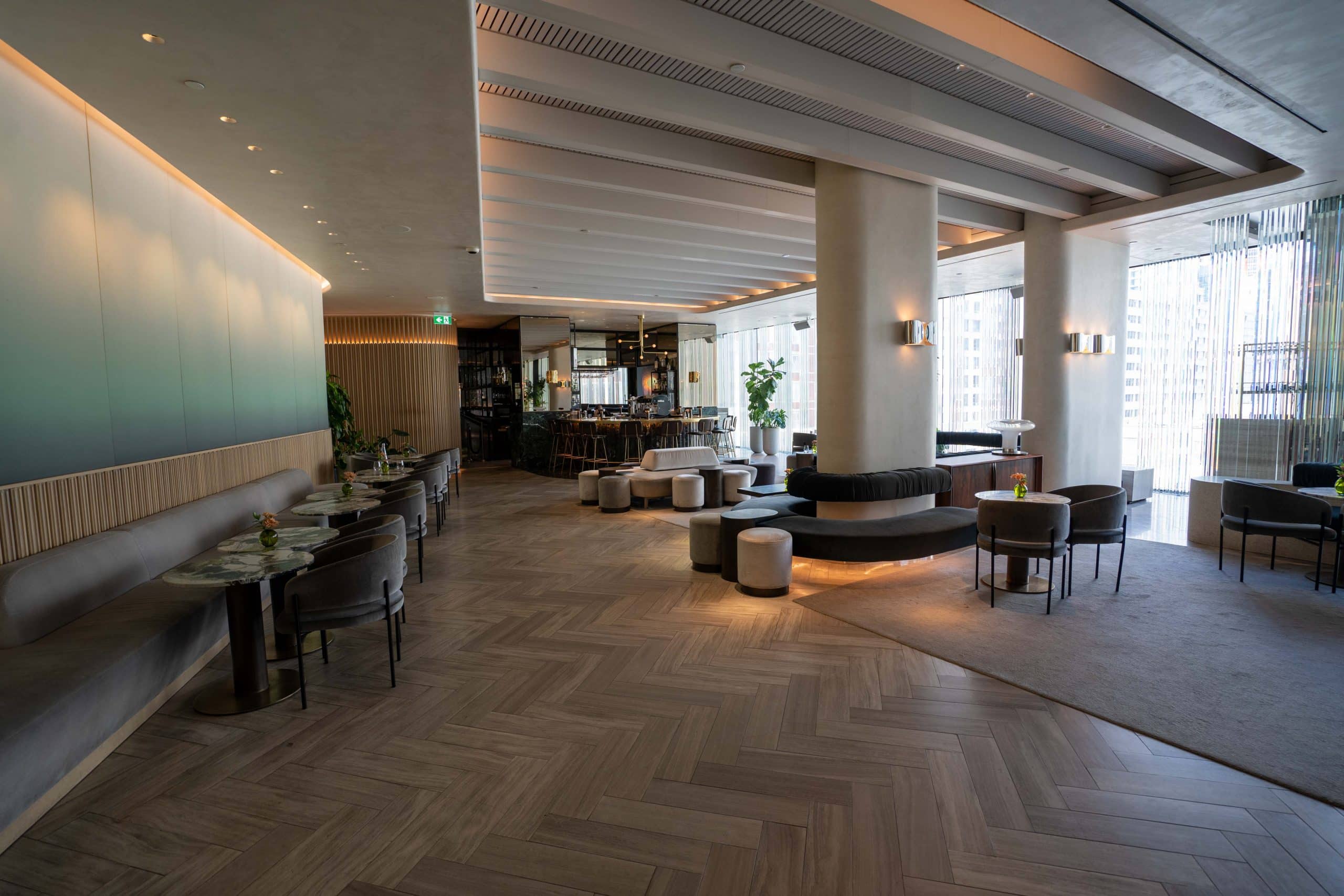 The design impresses with its artful composition, making it feel as if trees are climbing up and over the space. Plush booth and sofa-style seating options provide ample opportunities to indulge in a carefully crafted cocktail.