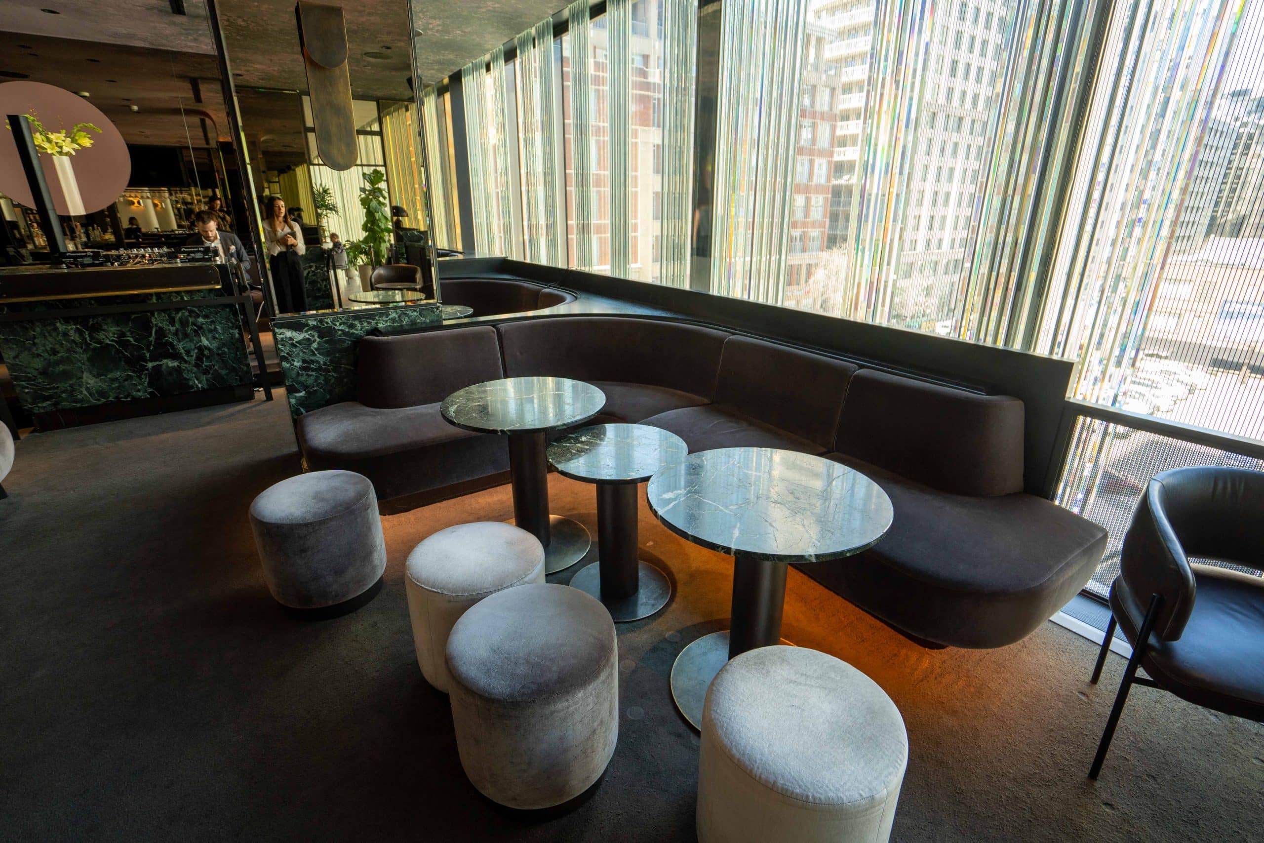 The seating options are as varied as they are plush, with dark legless benches wrapping around columns, light upholstered benches, and regular dining tables arranged throughout the space.