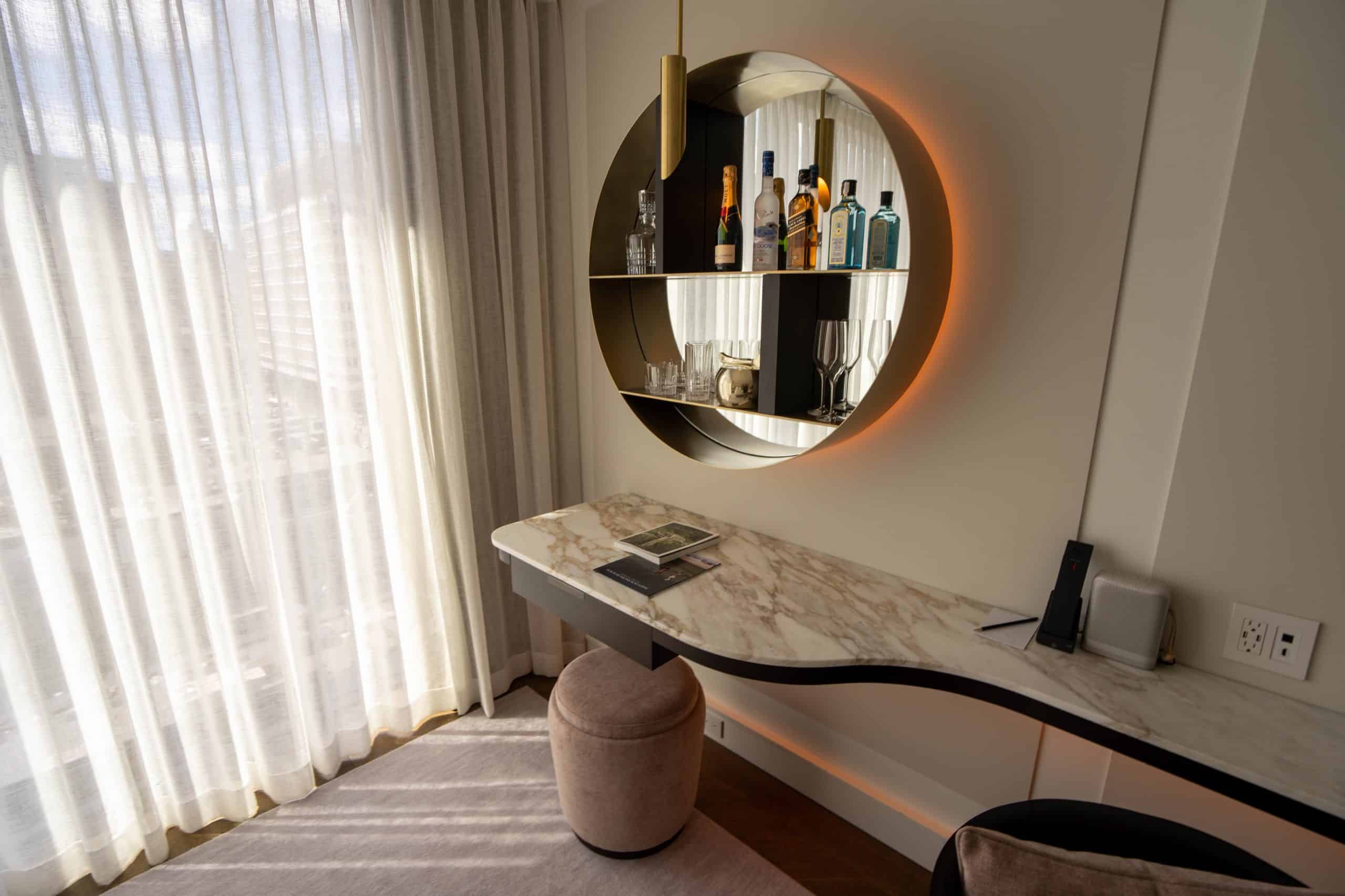 Opposite the bed, a beautiful circular mirror plays host to a wet bar which displays a range of top-shelf spirits, including Moët and Chandon Champagne and Johnnie Walker Black Label whisky, alongside appropriate glassware.