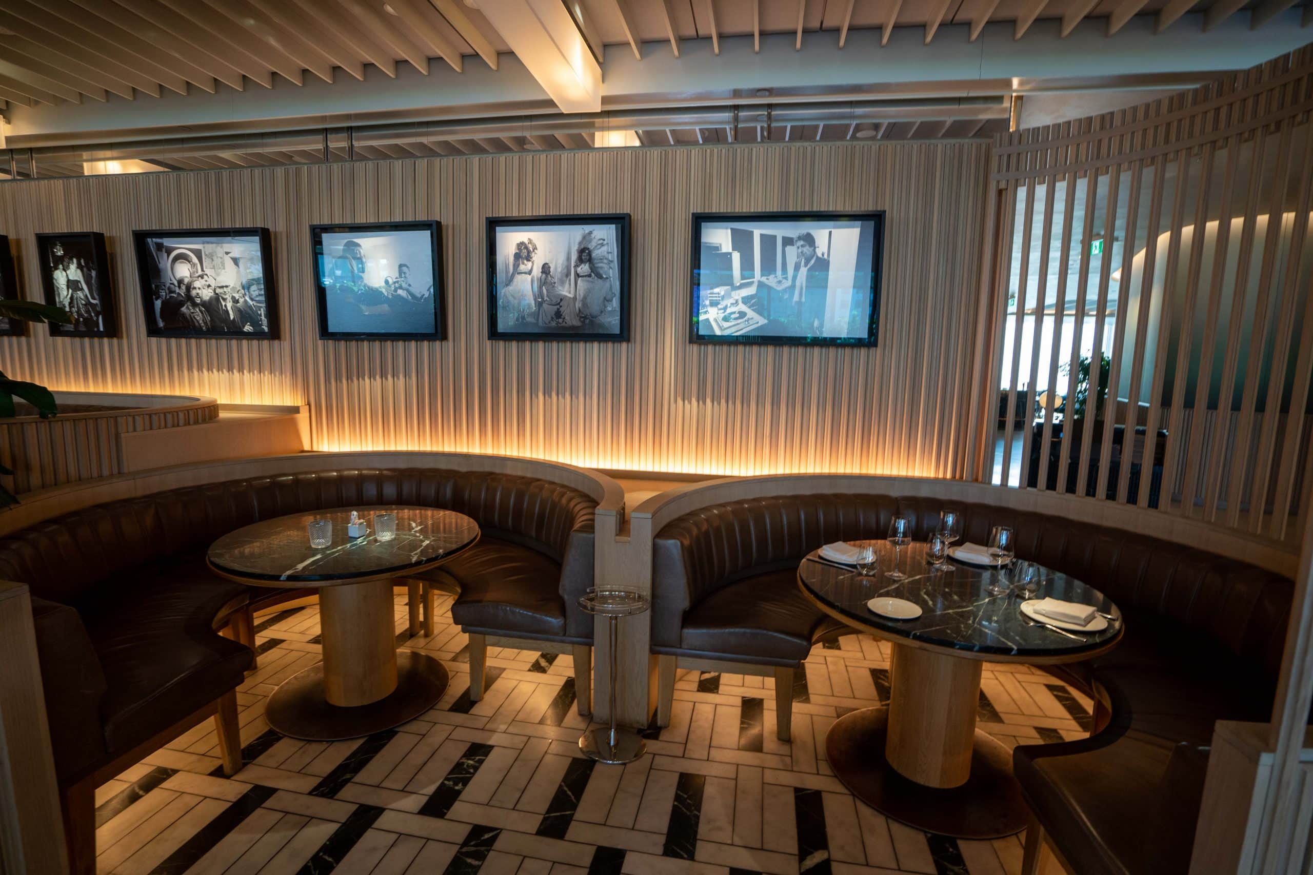 The main dining room has a more classic brasserie vibe, complete with curving wood and leather banquets, rattan seating, and monolithic marble partitions.