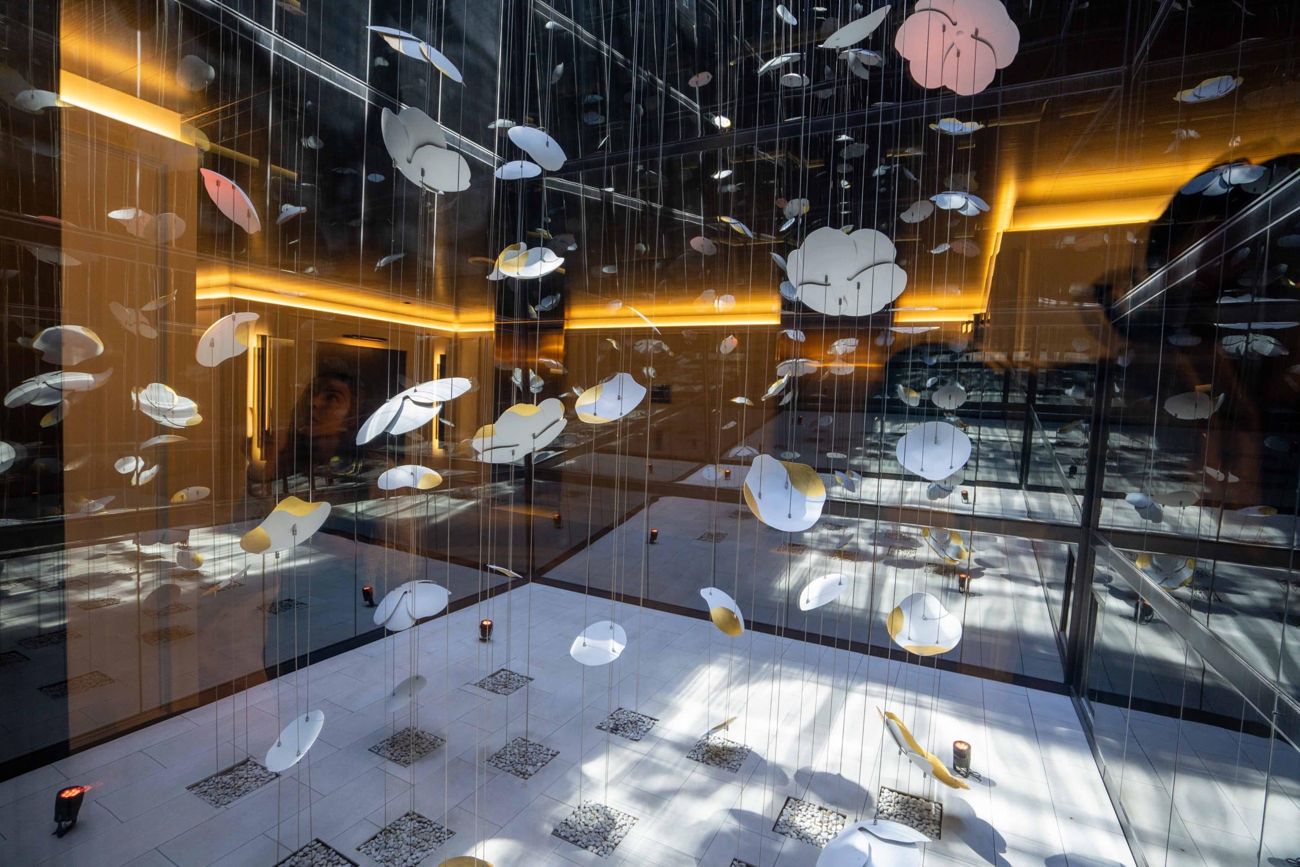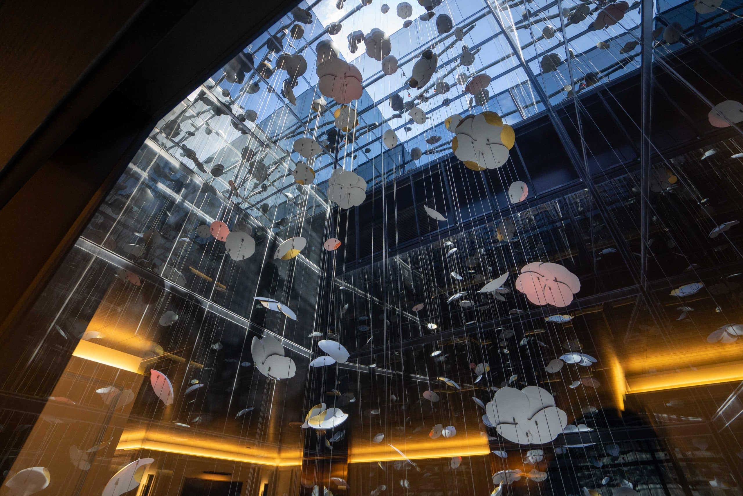 This work of art is made up of 90 floral suspensions crafted from aluminium, with each suspension beautifully embellished with gold-gilded accents and arranged in a cascading formation that extends from the 18th-floor skylight.