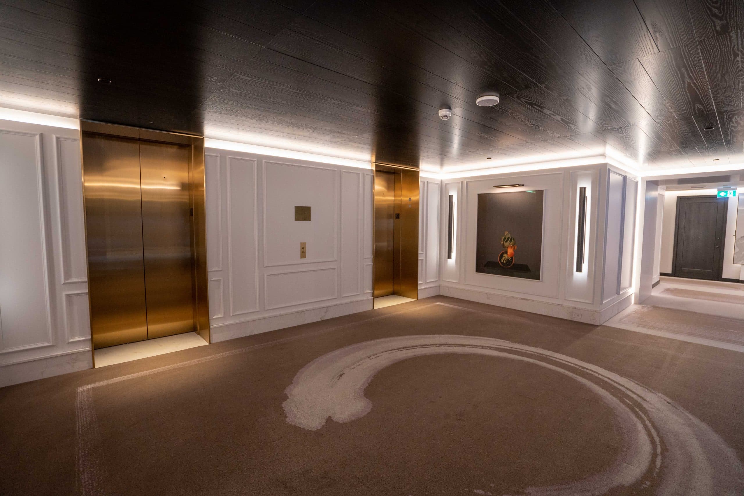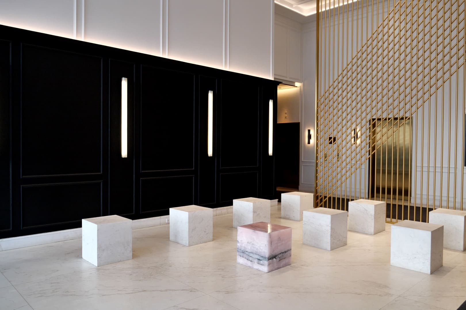 Upon stepping inside, the ground-floor lobby further exemplifies this with an attractive display of minimalist elegance. Playful marble cubes, reminiscent of contemporary art, serve as seats, while a towering brass partition adds a captivating focal point to the understated décor.