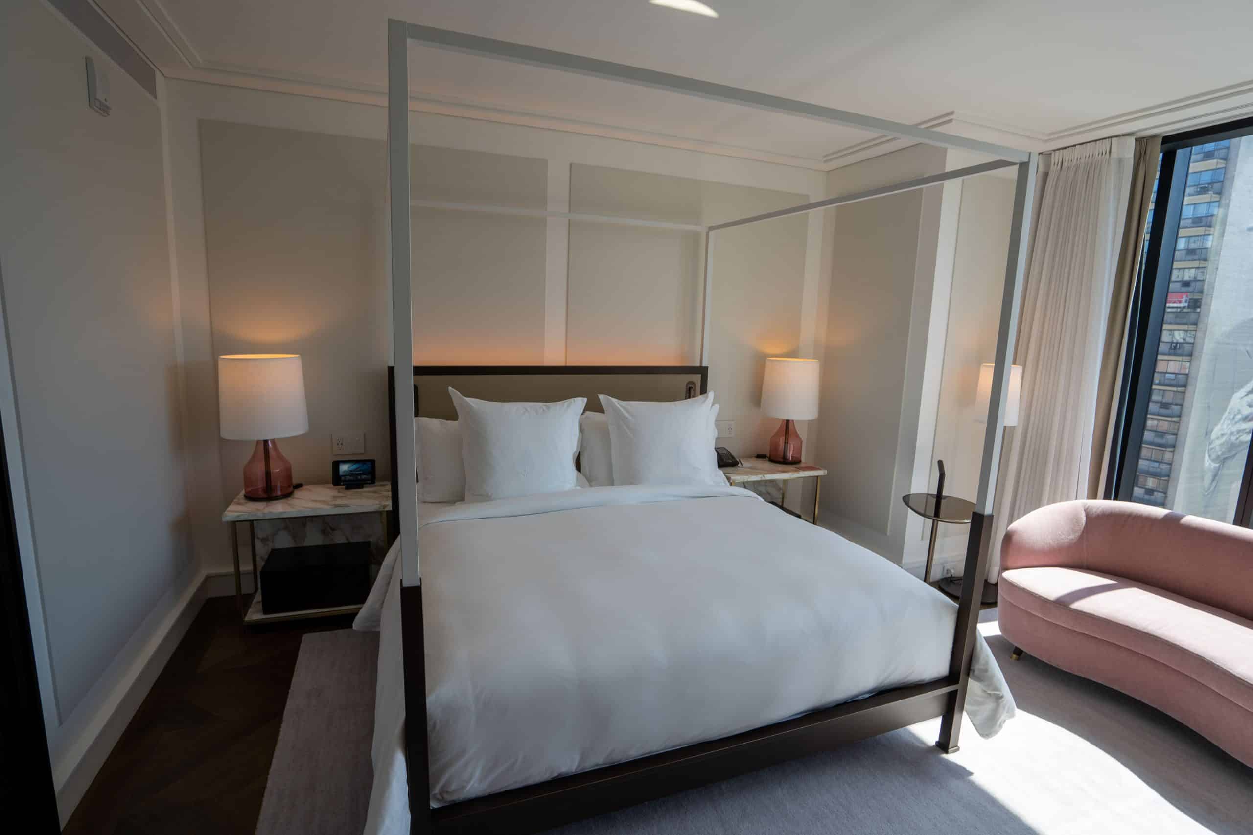 The bedroom of the suite is essentially the Deluxe King Room, featuring a striking canopy bed and adjacent plush loveseat.